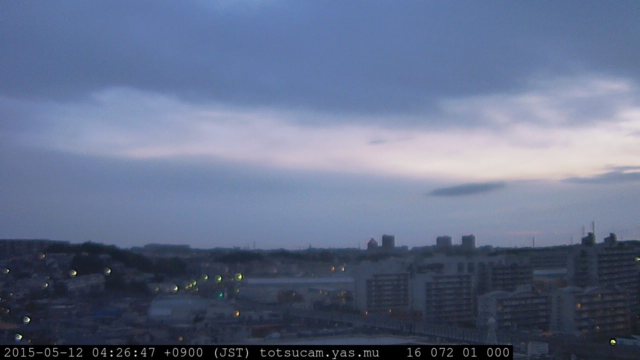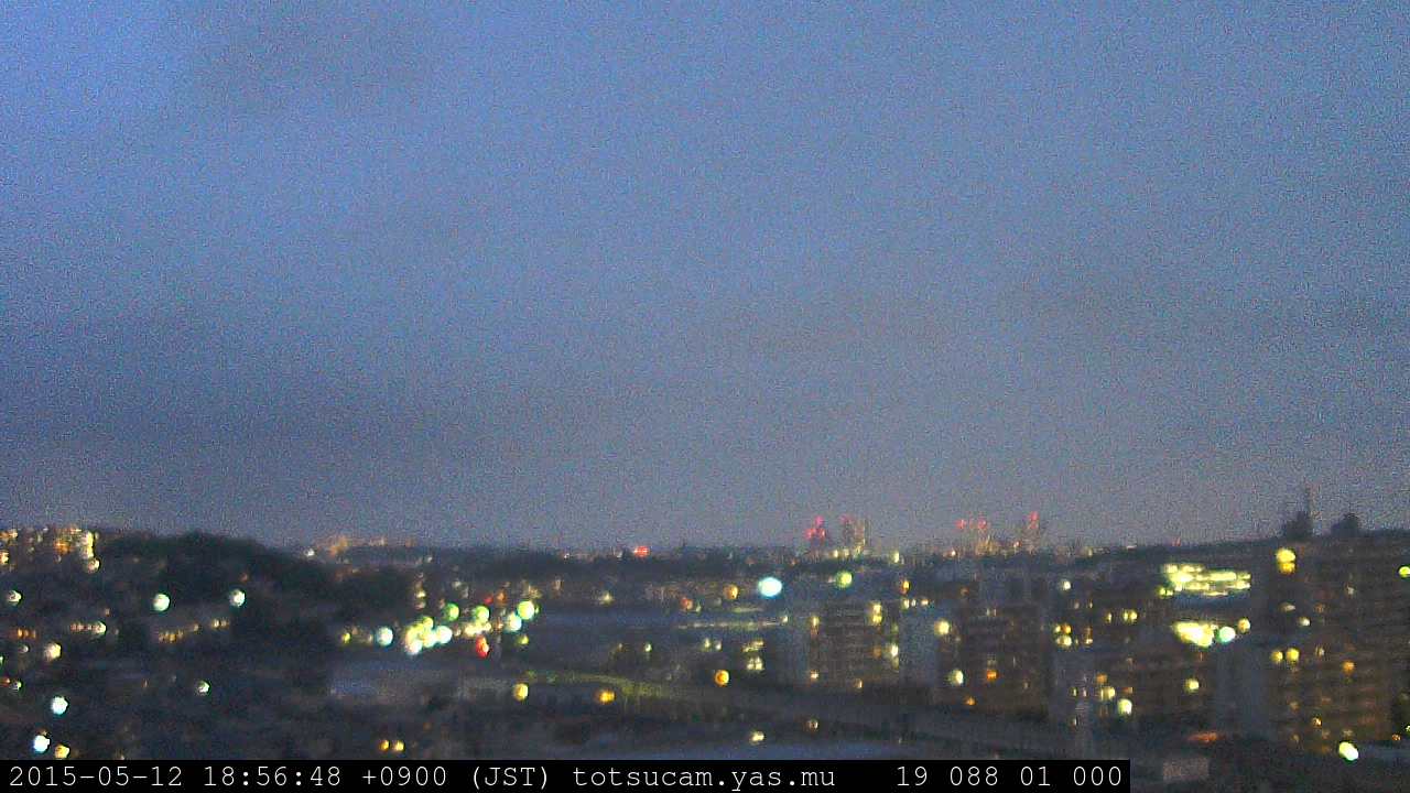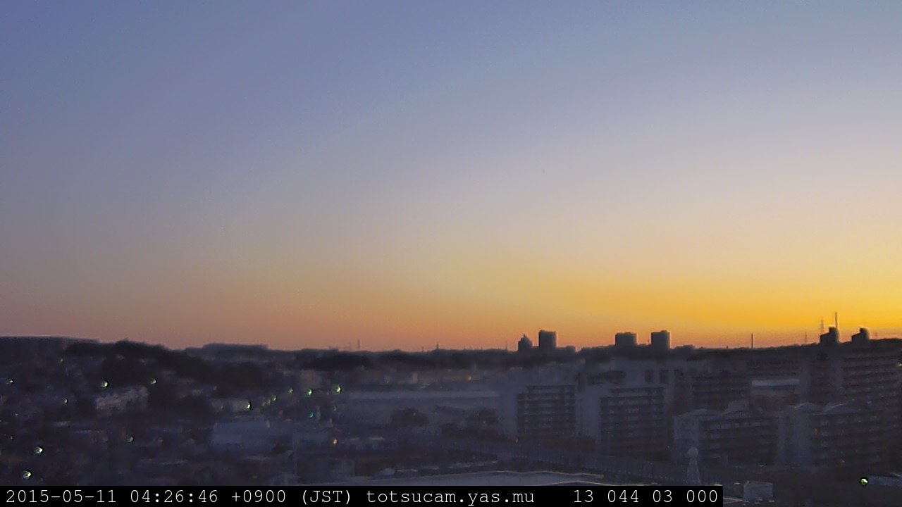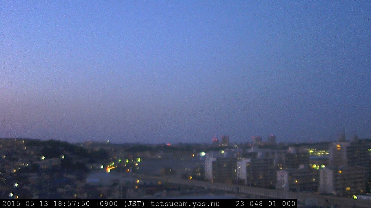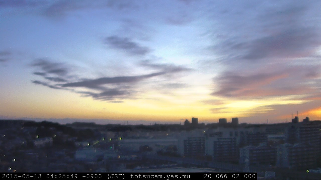 横浜市戸塚駅周辺から 東戸塚方面(北北東)を望む展望カメラの映像です。 左は現在の映像です。 下に並んでいるのは、 7日間に亘る日の出どき、昼間、夕暮れどきの写真(サムネイル)です。 それぞれ、日の出15分前、南中時、日没20分後の写真となっています。 各写真の下にはmpeg形式の動画へのリンクがあります。 それぞれ、日の出、南中、日没の前後1時間の画像です。 右欄にはその日24時間の動画へのリンクがあります。 この7日間以外は日付が一覧表示されています。 日付部分をクリックすると、 その日付から7日分が展開されて表示されます。