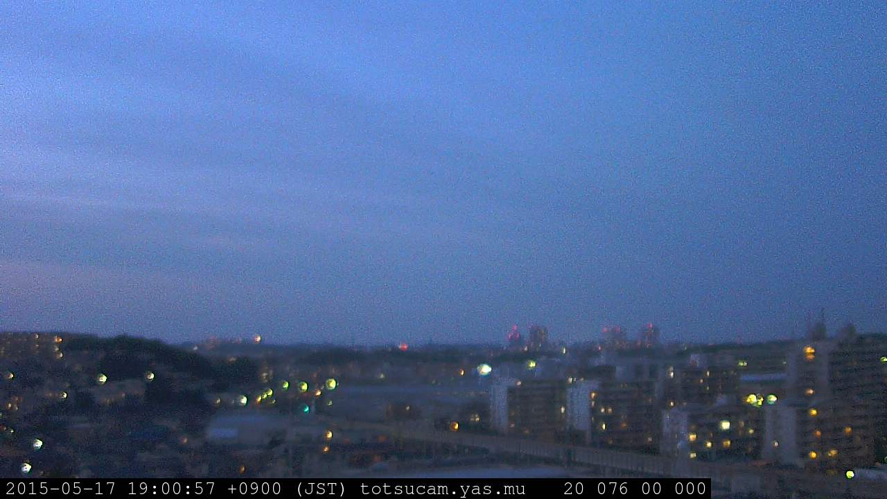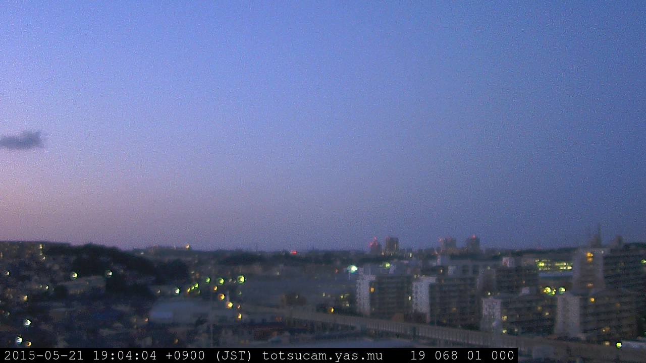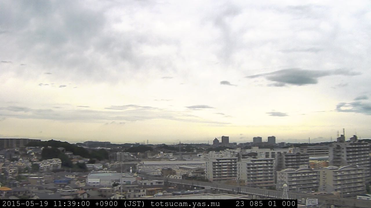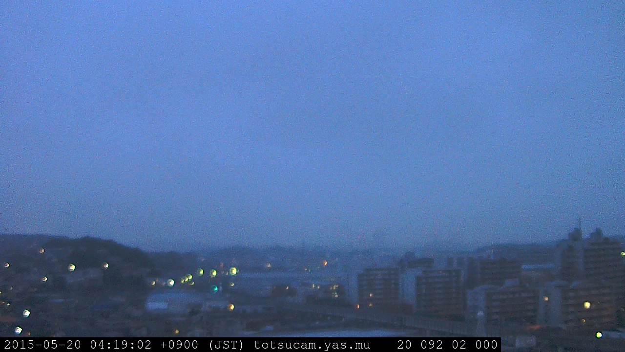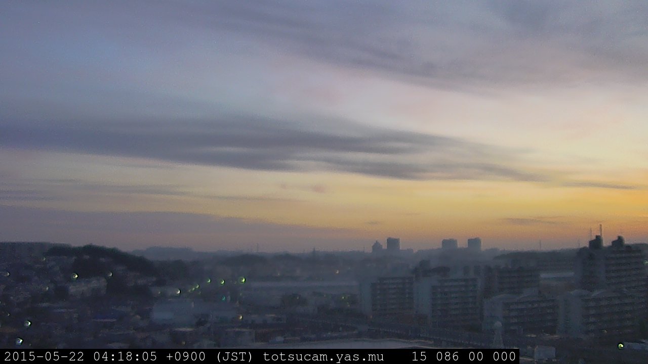 横浜市戸塚駅周辺から 東戸塚方面(北北東)を望む展望カメラの映像です。 左は現在の映像です。 下に並んでいるのは、 7日間に亘る日の出どき、昼間、夕暮れどきの写真(サムネイル)です。 それぞれ、日の出15分前、南中時、日没20分後の写真となっています。 各写真の下にはmpeg形式の動画へのリンクがあります。 それぞれ、日の出、南中、日没の前後1時間の画像です。 右欄にはその日24時間の動画へのリンクがあります。 この7日間以外は日付が一覧表示されています。 日付部分をクリックすると、 その日付から7日分が展開されて表示されます。