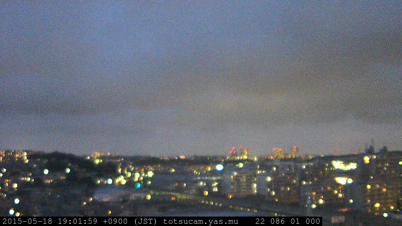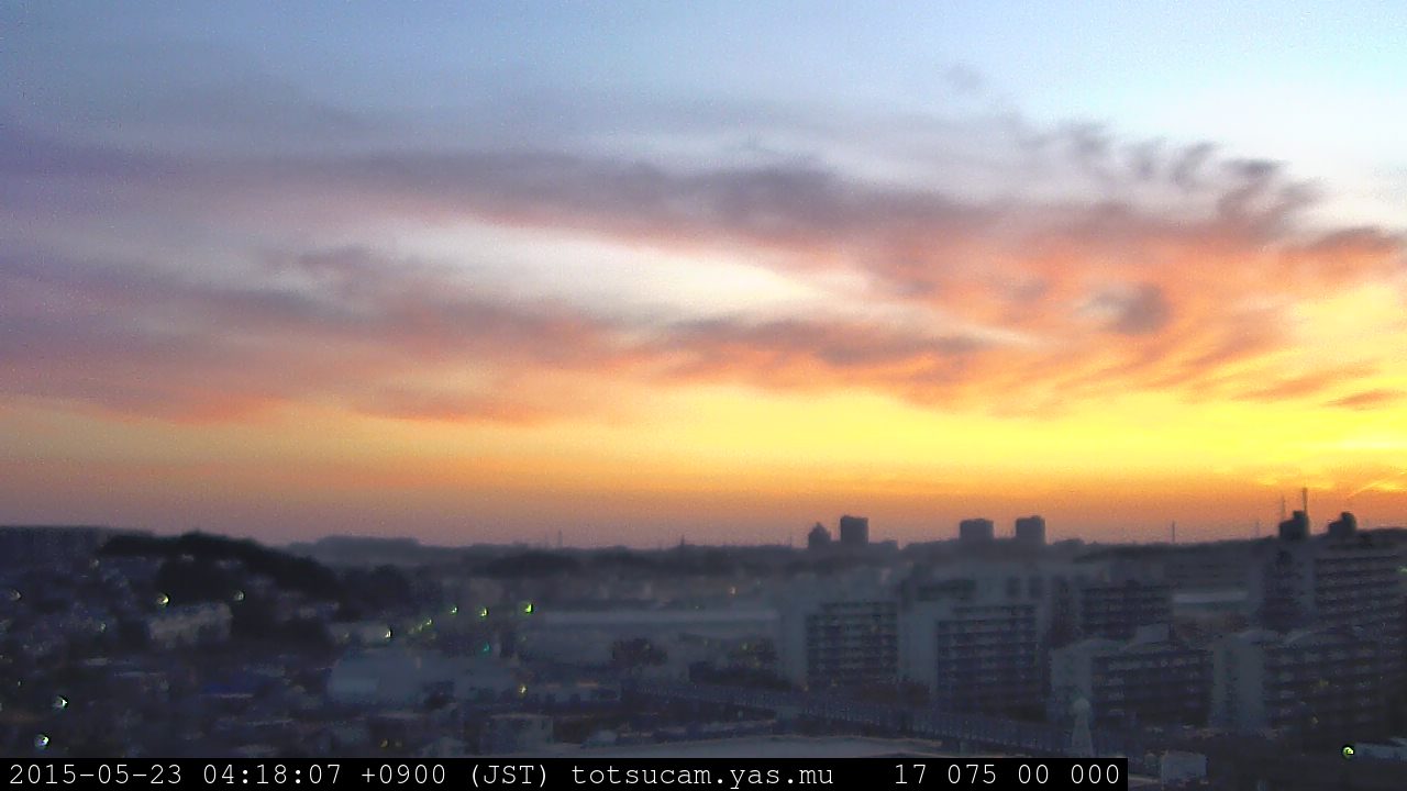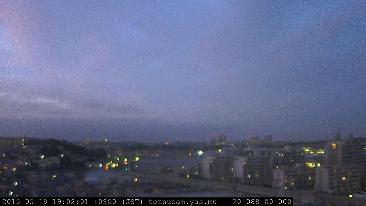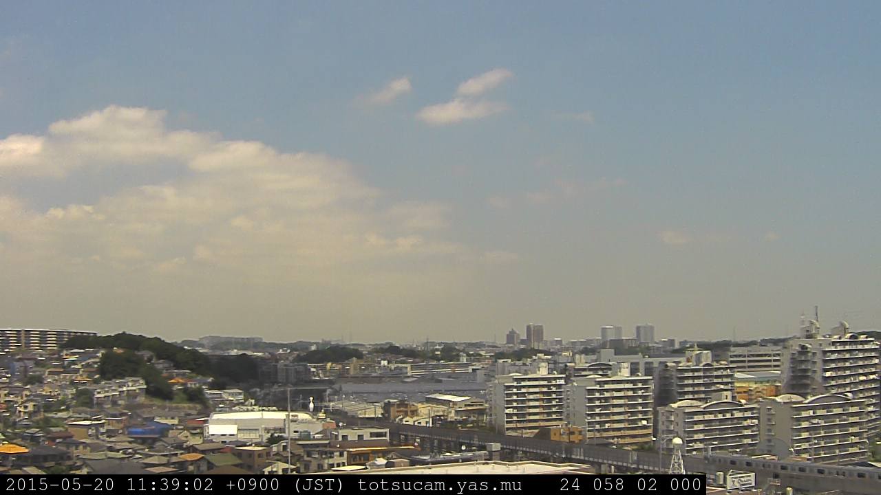 横浜市戸塚駅周辺から 東戸塚方面(北北東)を望む展望カメラの映像です。 左は現在の映像です。 下に並んでいるのは、 7日間に亘る日の出どき、昼間、夕暮れどきの写真(サムネイル)です。 それぞれ、日の出15分前、南中時、日没20分後の写真となっています。 各写真の下にはmpeg形式の動画へのリンクがあります。 それぞれ、日の出、南中、日没の前後1時間の画像です。 右欄にはその日24時間の動画へのリンクがあります。 この7日間以外は日付が一覧表示されています。 日付部分をクリックすると、 その日付から7日分が展開されて表示されます。