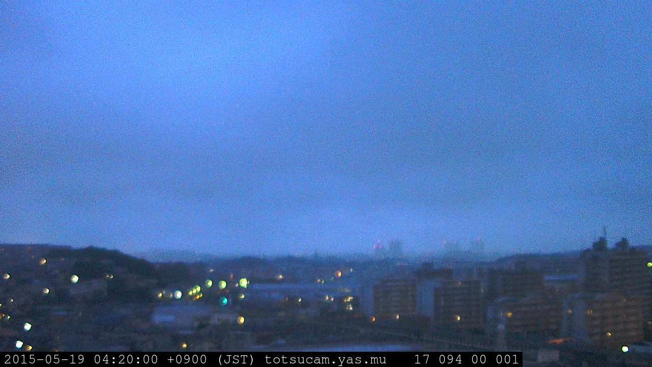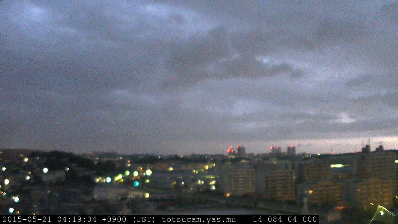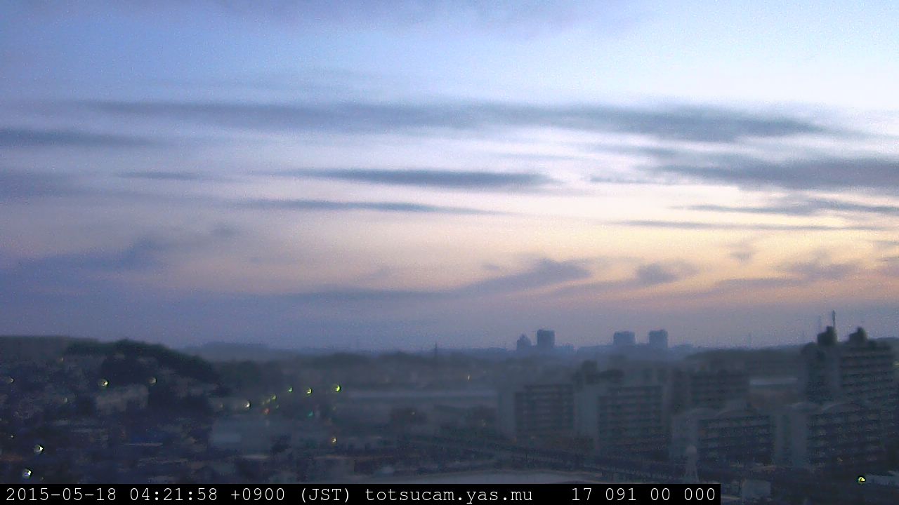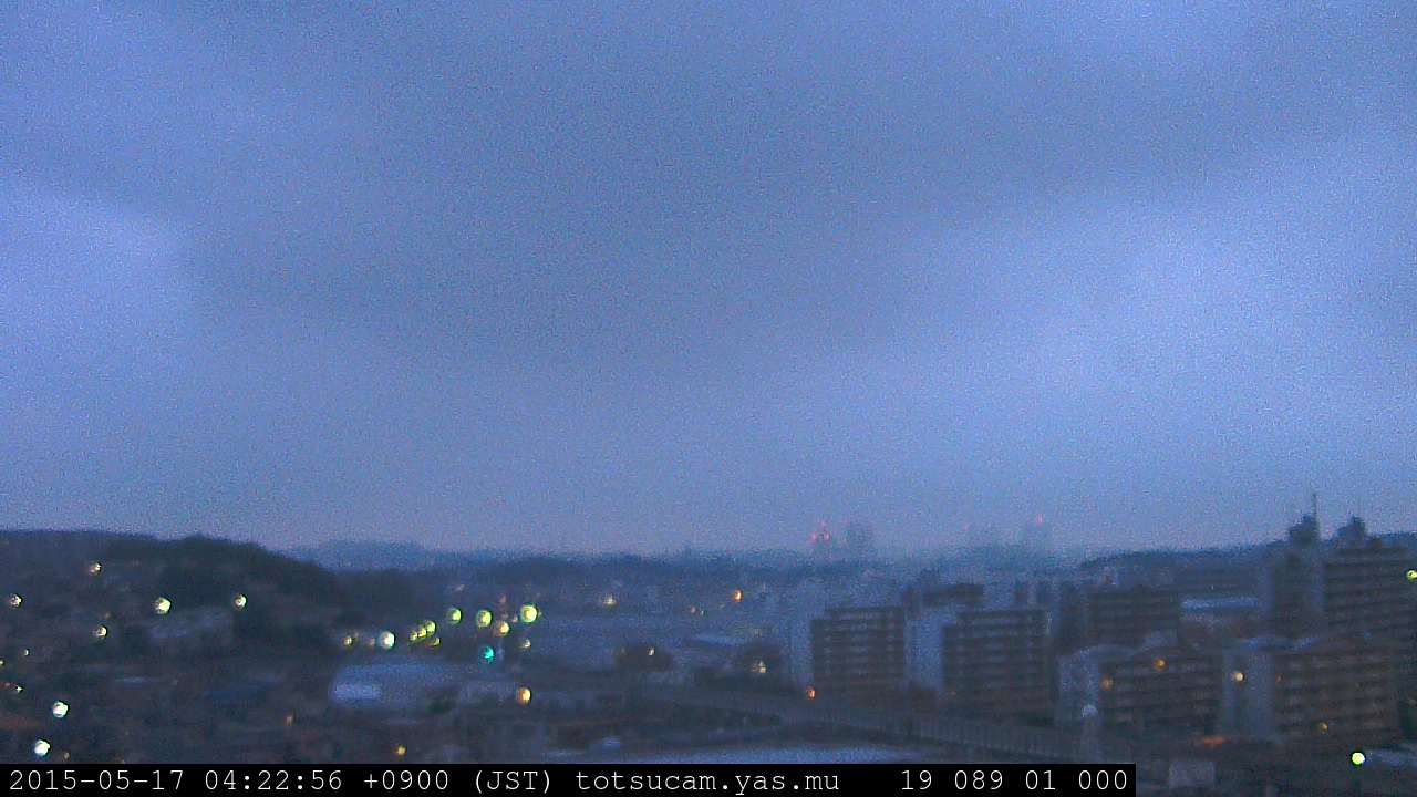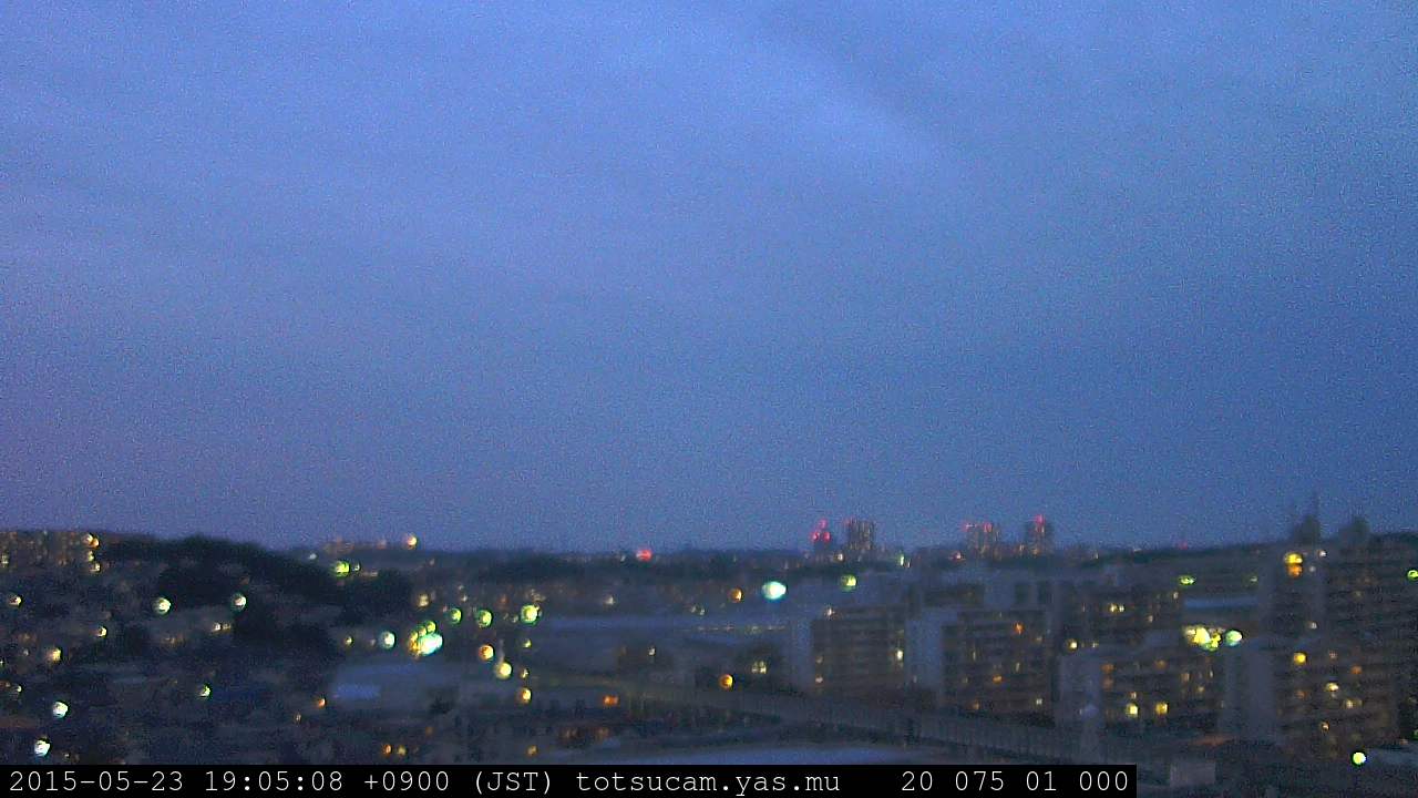横浜市戸塚駅周辺から 東戸塚方面(北北東)を望む展望カメラの映像です。 左は現在の映像です。 下に並んでいるのは、 7日間に亘る日の出どき、昼間、夕暮れどきの写真(サムネイル)です。 それぞれ、日の出15分前、南中時、日没20分後の写真となっています。 各写真の下にはmpeg形式の動画へのリンクがあります。 それぞれ、日の出、南中、日没の前後1時間の画像です。 右欄にはその日24時間の動画へのリンクがあります。 この7日間以外は日付が一覧表示されています。 日付部分をクリックすると、 その日付から7日分が展開されて表示されます。