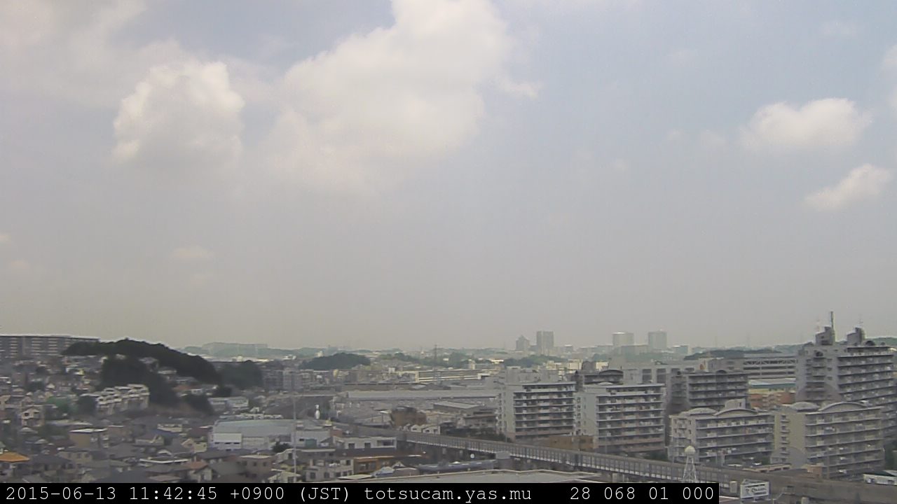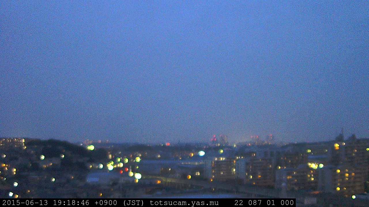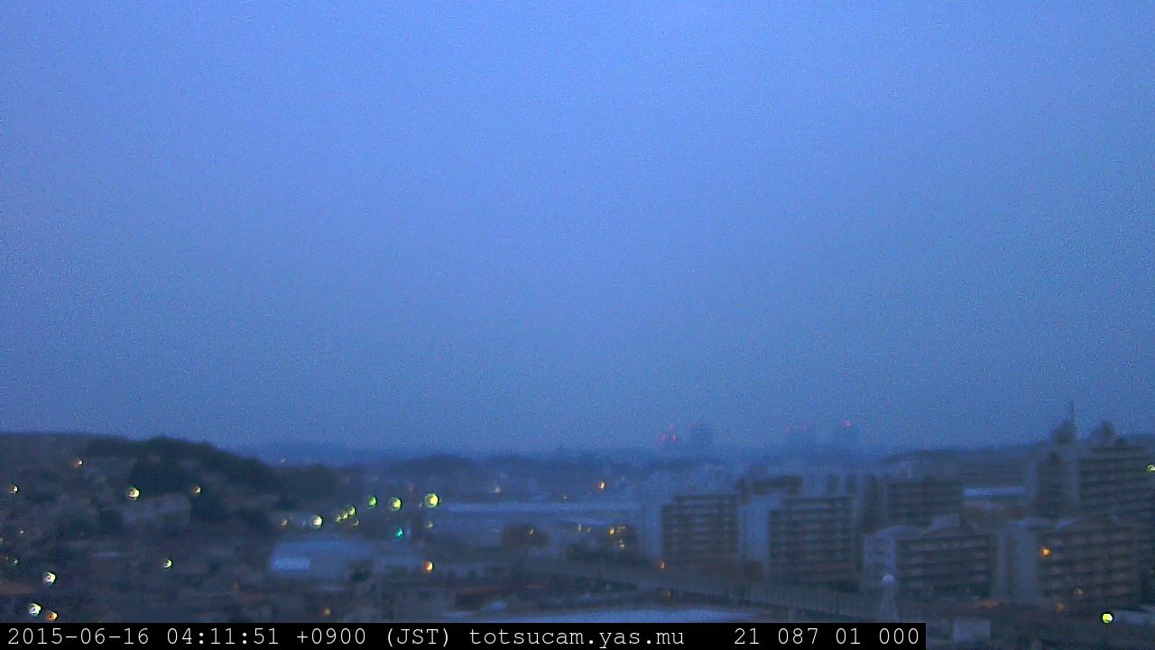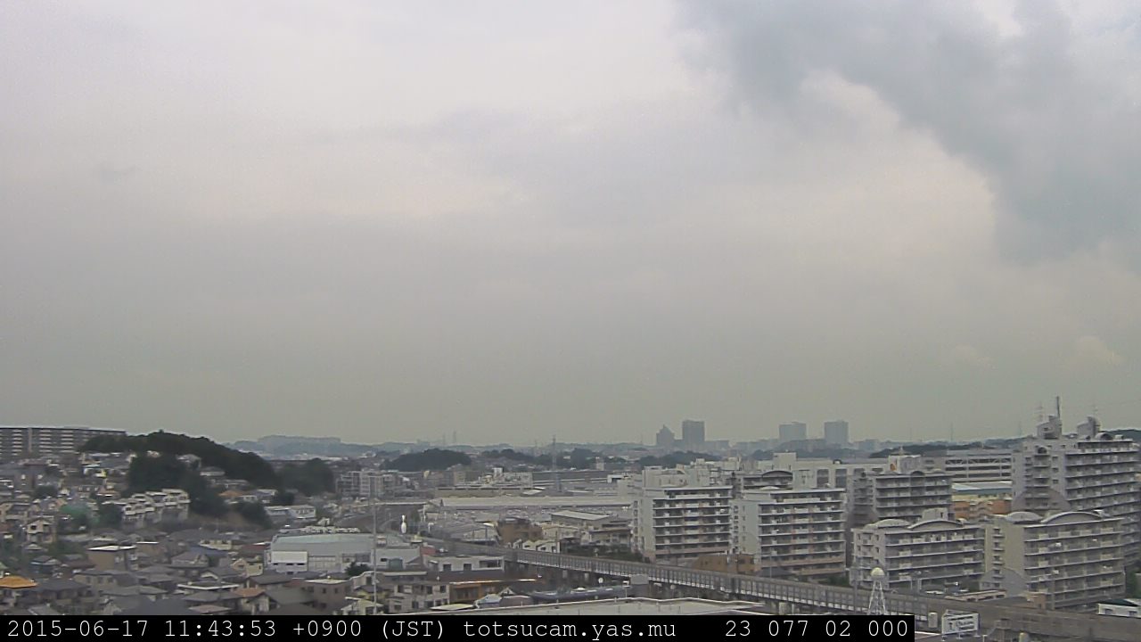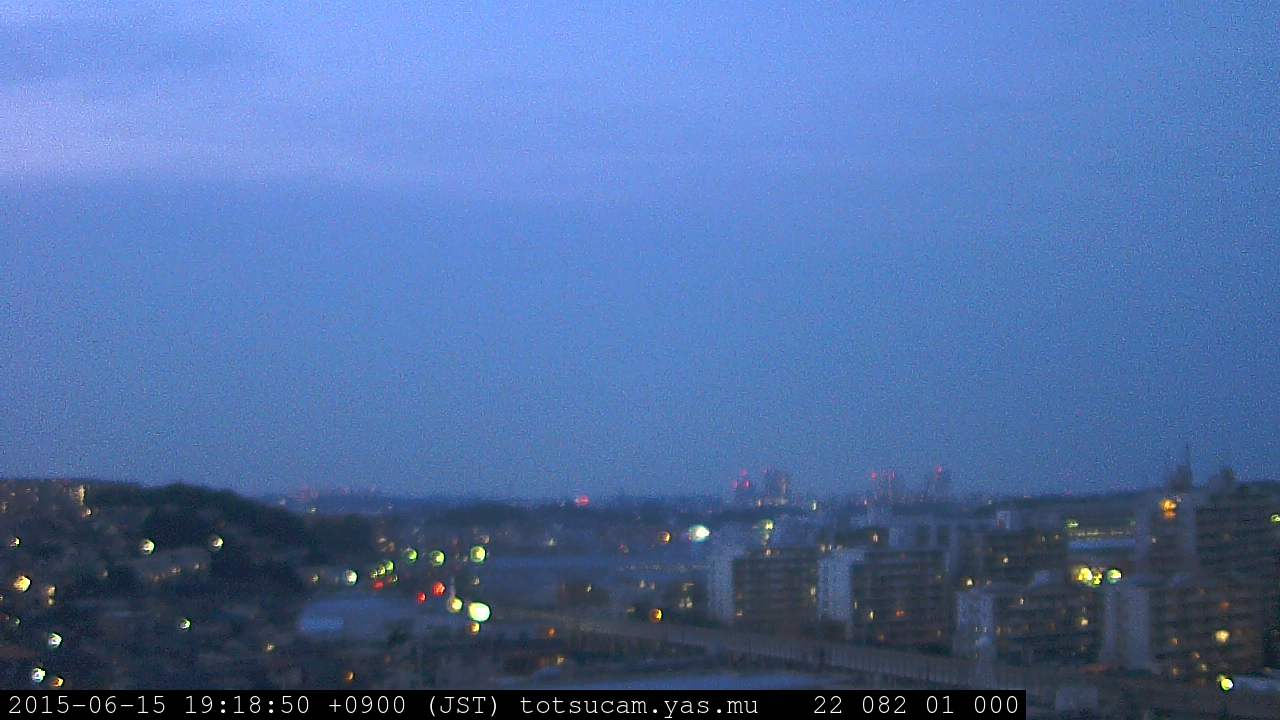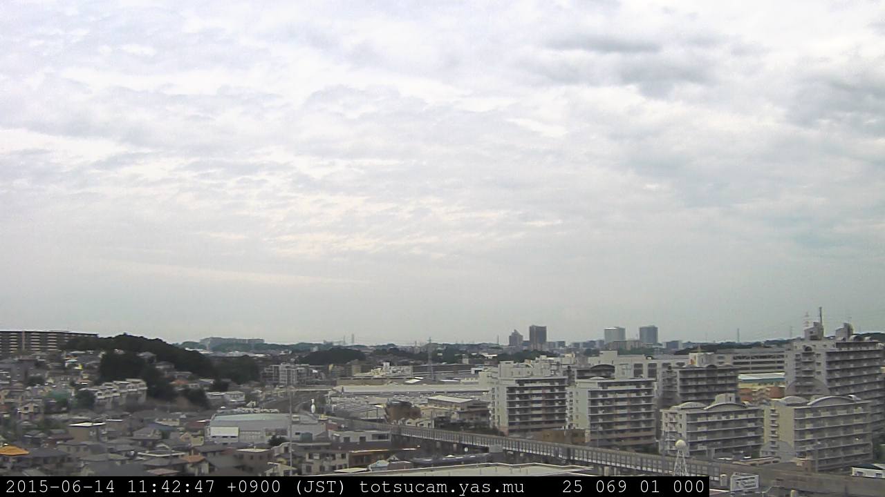 横浜市戸塚駅周辺から 東戸塚方面(北北東)を望む展望カメラの映像です。 左は現在の映像です。 下に並んでいるのは、 7日間に亘る日の出どき、昼間、夕暮れどきの写真(サムネイル)です。 それぞれ、日の出15分前、南中時、日没20分後の写真となっています。 各写真の下にはmpeg形式の動画へのリンクがあります。 それぞれ、日の出、南中、日没の前後1時間の画像です。 右欄にはその日24時間の動画へのリンクがあります。 この7日間以外は日付が一覧表示されています。 日付部分をクリックすると、 その日付から7日分が展開されて表示されます。