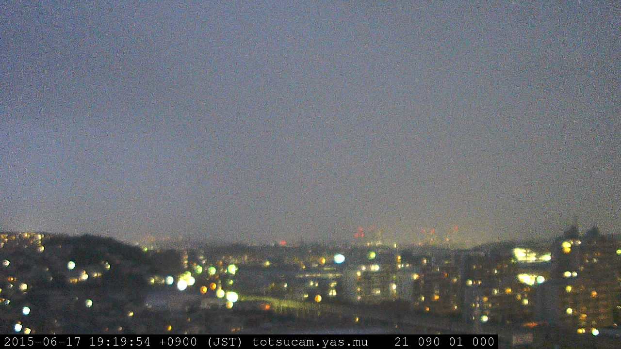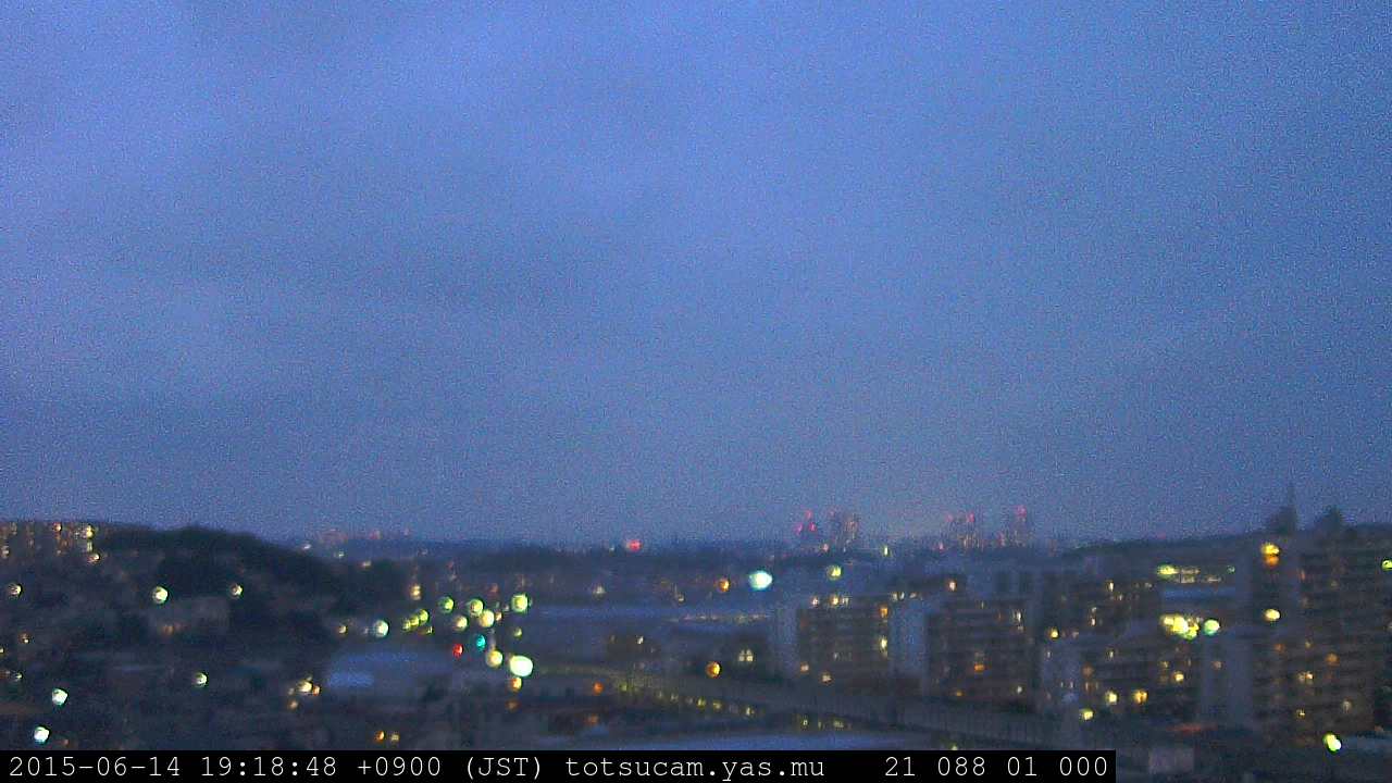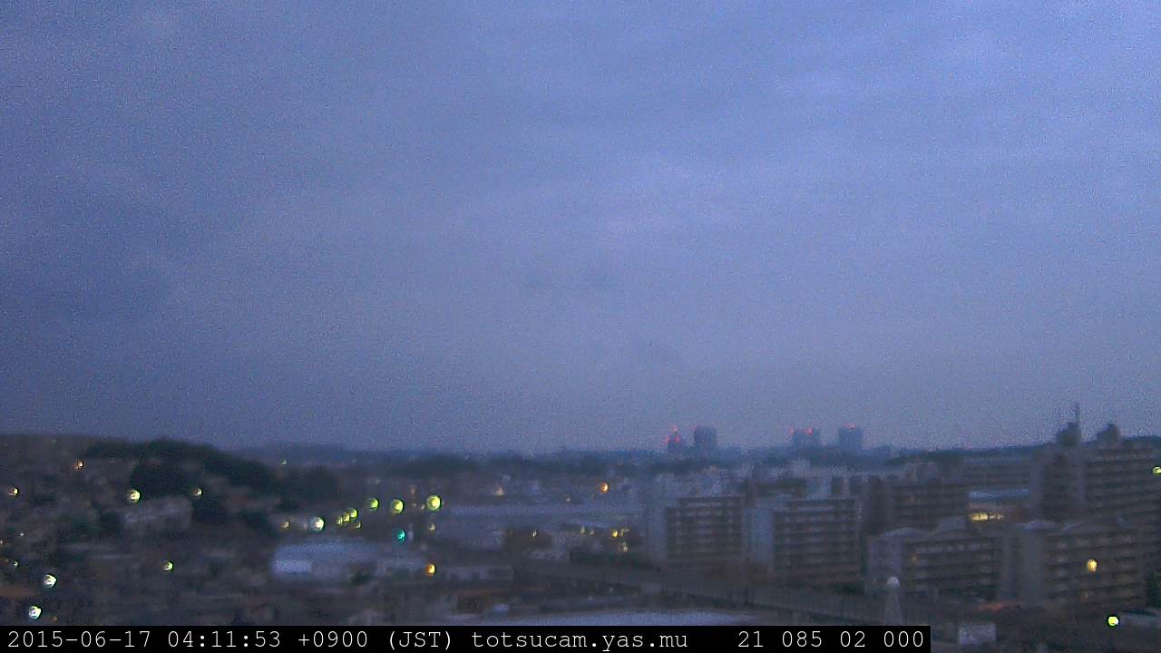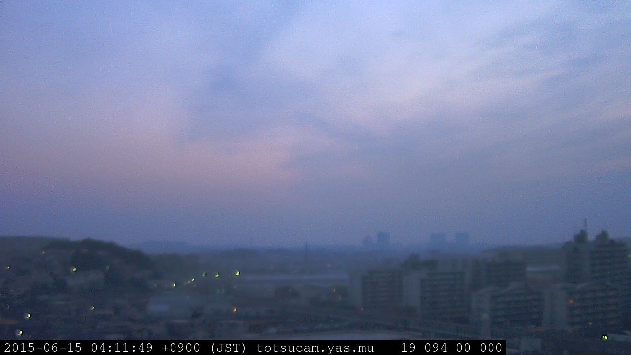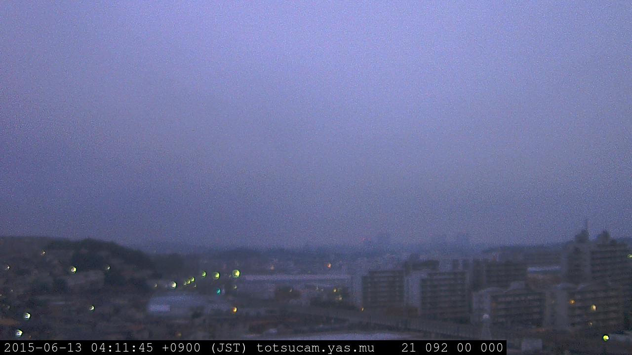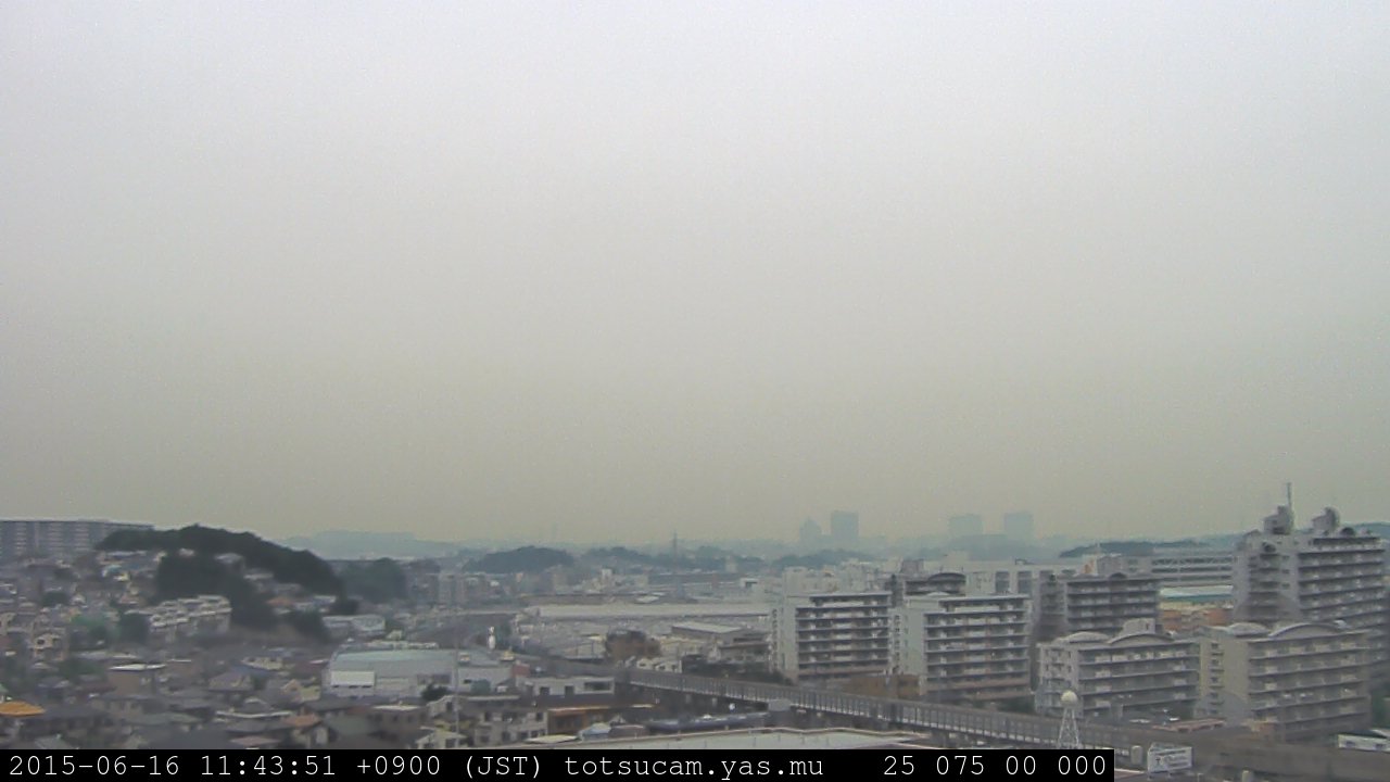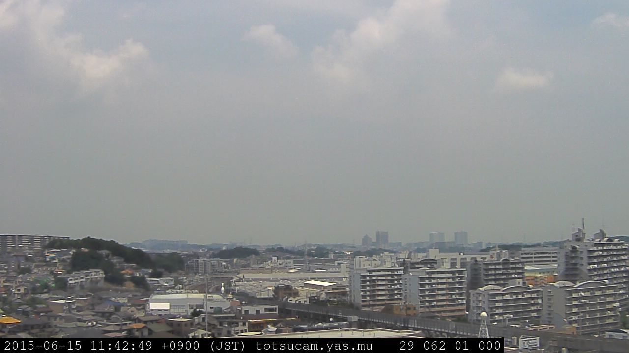 横浜市戸塚駅周辺から 東戸塚方面(北北東)を望む展望カメラの映像です。 左は現在の映像です。 下に並んでいるのは、 7日間に亘る日の出どき、昼間、夕暮れどきの写真(サムネイル)です。 それぞれ、日の出15分前、南中時、日没20分後の写真となっています。 各写真の下にはmpeg形式の動画へのリンクがあります。 それぞれ、日の出、南中、日没の前後1時間の画像です。 右欄にはその日24時間の動画へのリンクがあります。 この7日間以外は日付が一覧表示されています。 日付部分をクリックすると、 その日付から7日分が展開されて表示されます。