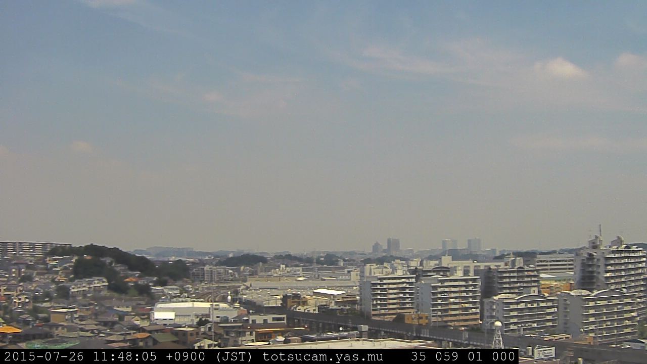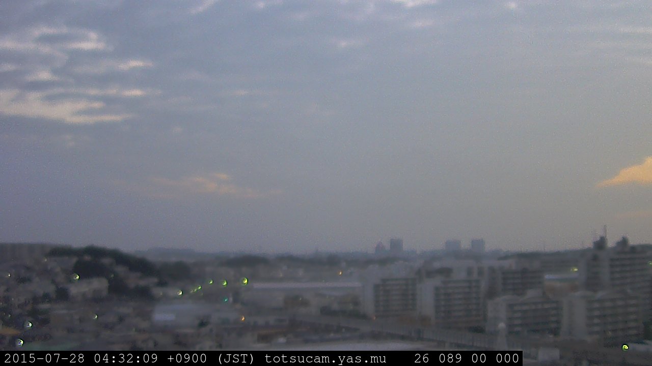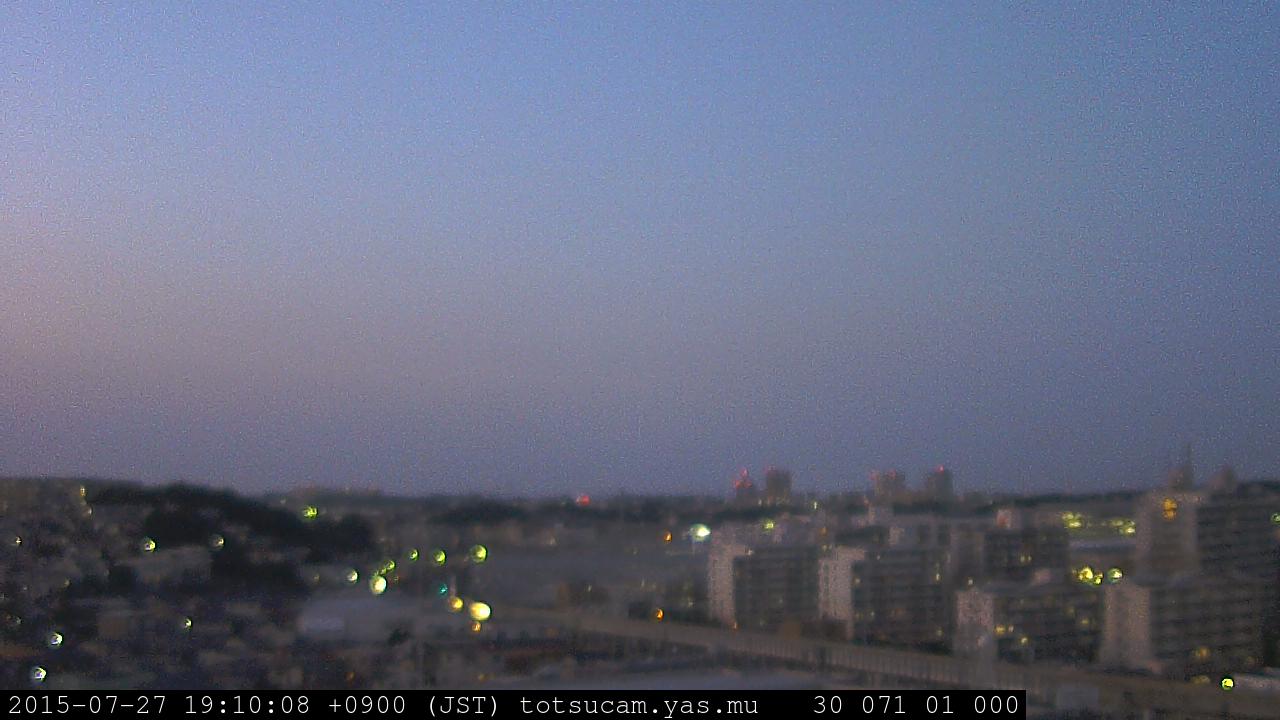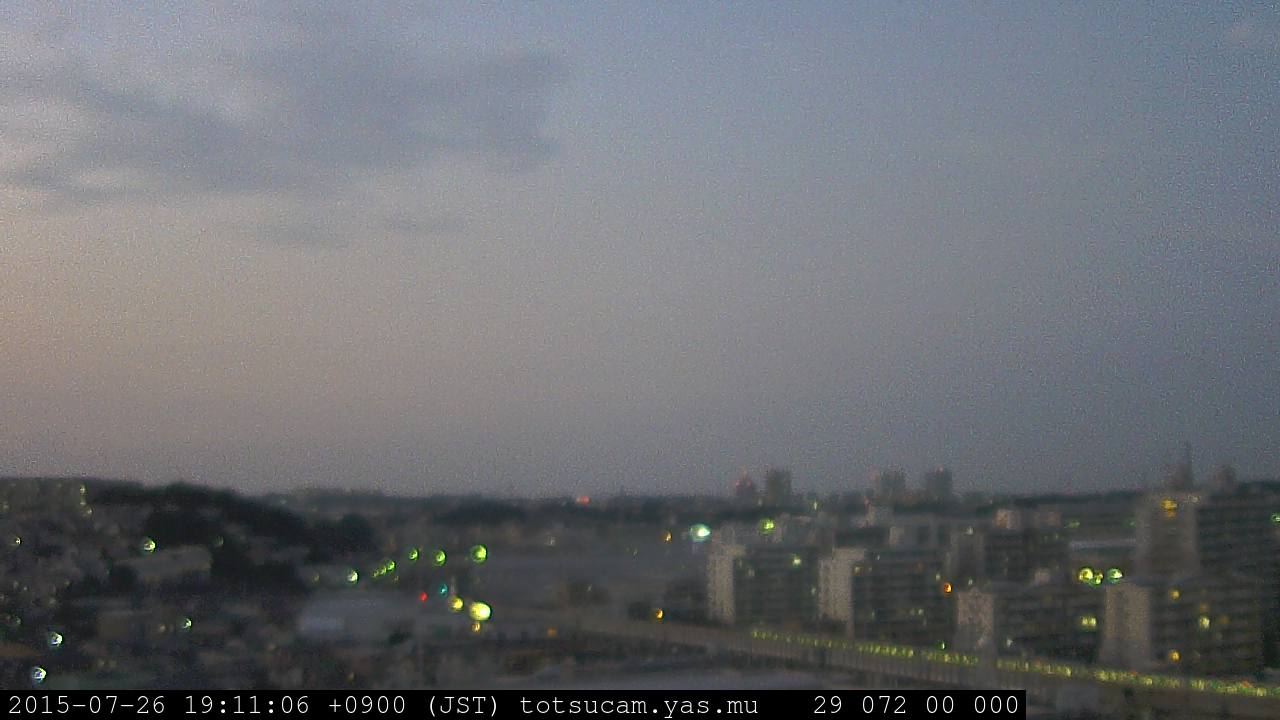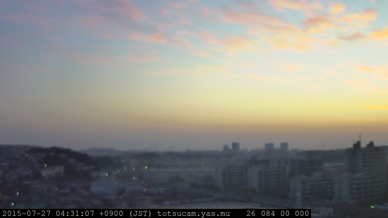 横浜市戸塚駅周辺から 東戸塚方面(北北東)を望む展望カメラの映像です。 左は現在の映像です。 下に並んでいるのは、 7日間に亘る日の出どき、昼間、夕暮れどきの写真(サムネイル)です。 それぞれ、日の出15分前、南中時、日没20分後の写真となっています。 各写真の下にはmpeg形式の動画へのリンクがあります。 それぞれ、日の出、南中、日没の前後1時間の画像です。 右欄にはその日24時間の動画へのリンクがあります。 この7日間以外は日付が一覧表示されています。 日付部分をクリックすると、 その日付から7日分が展開されて表示されます。