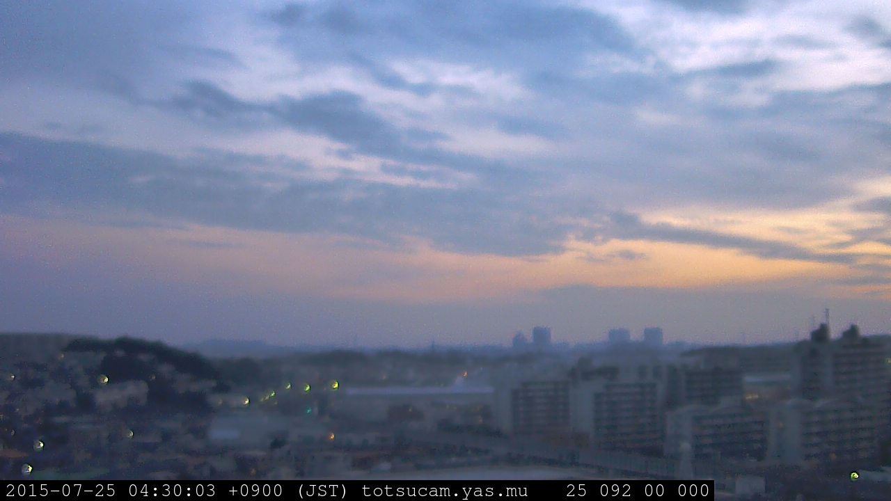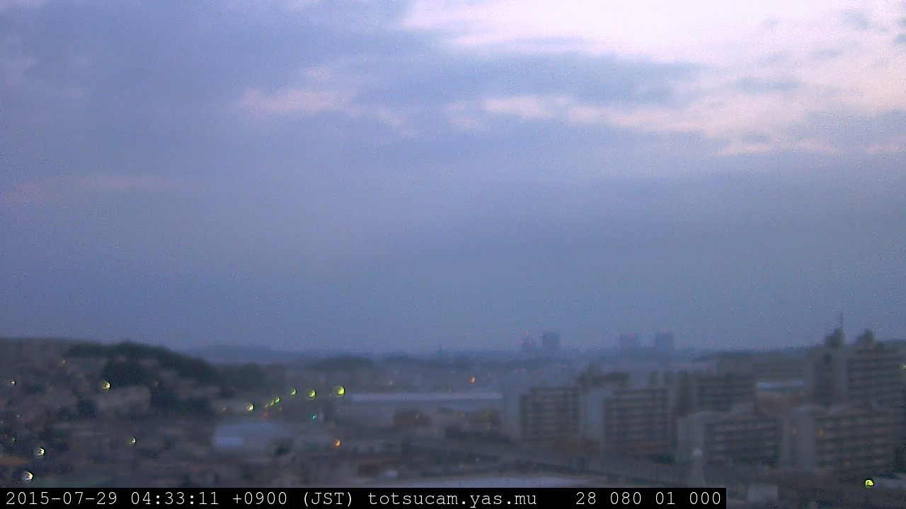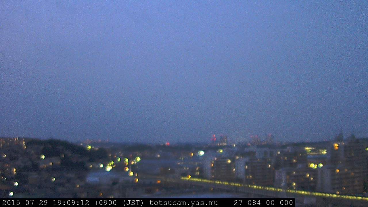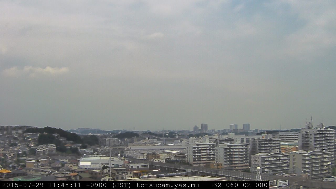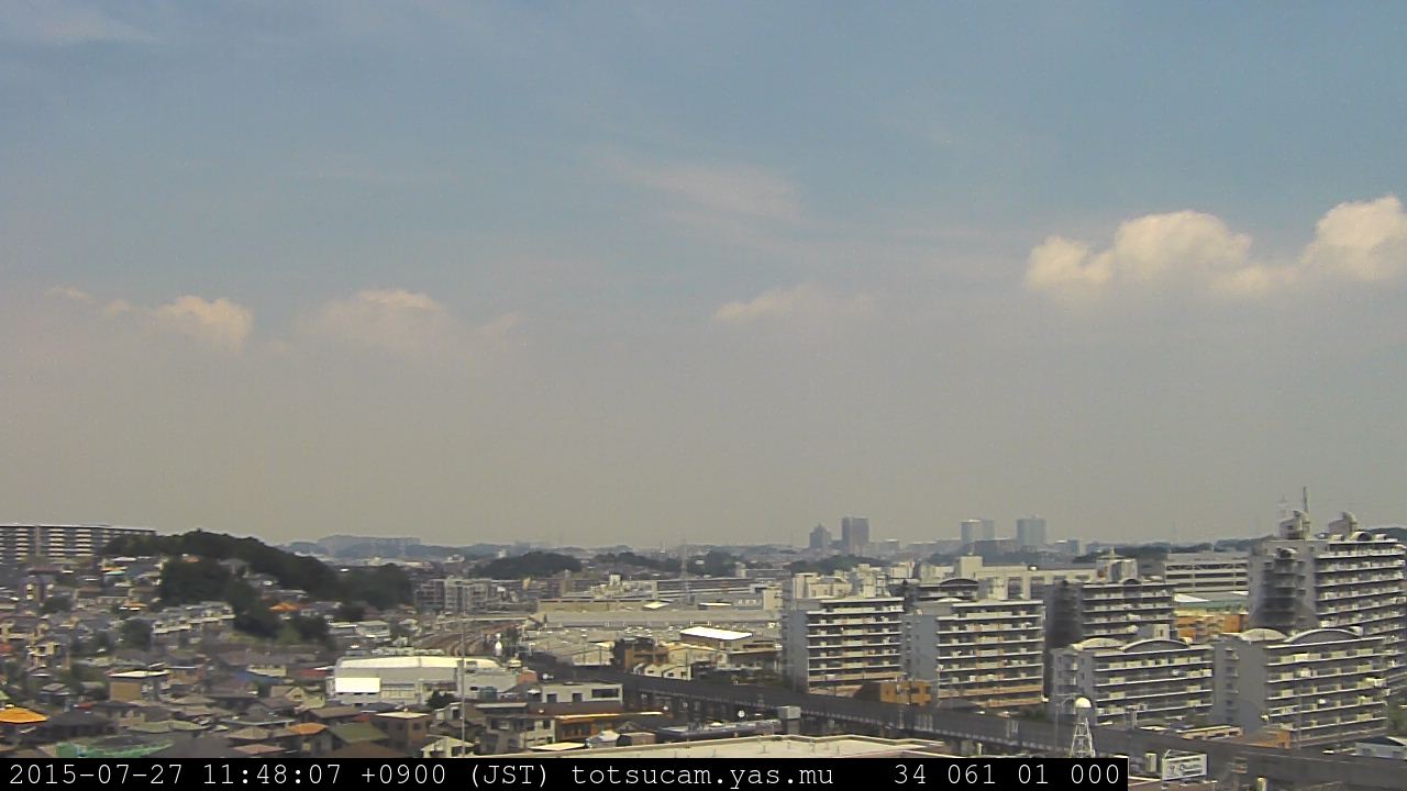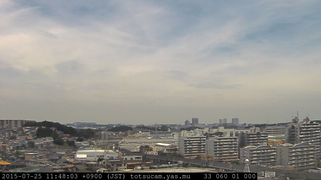 横浜市戸塚駅周辺から 東戸塚方面(北北東)を望む展望カメラの映像です。 左は現在の映像です。 下に並んでいるのは、 7日間に亘る日の出どき、昼間、夕暮れどきの写真(サムネイル)です。 それぞれ、日の出15分前、南中時、日没20分後の写真となっています。 各写真の下にはmpeg形式の動画へのリンクがあります。 それぞれ、日の出、南中、日没の前後1時間の画像です。 右欄にはその日24時間の動画へのリンクがあります。 この7日間以外は日付が一覧表示されています。 日付部分をクリックすると、 その日付から7日分が展開されて表示されます。