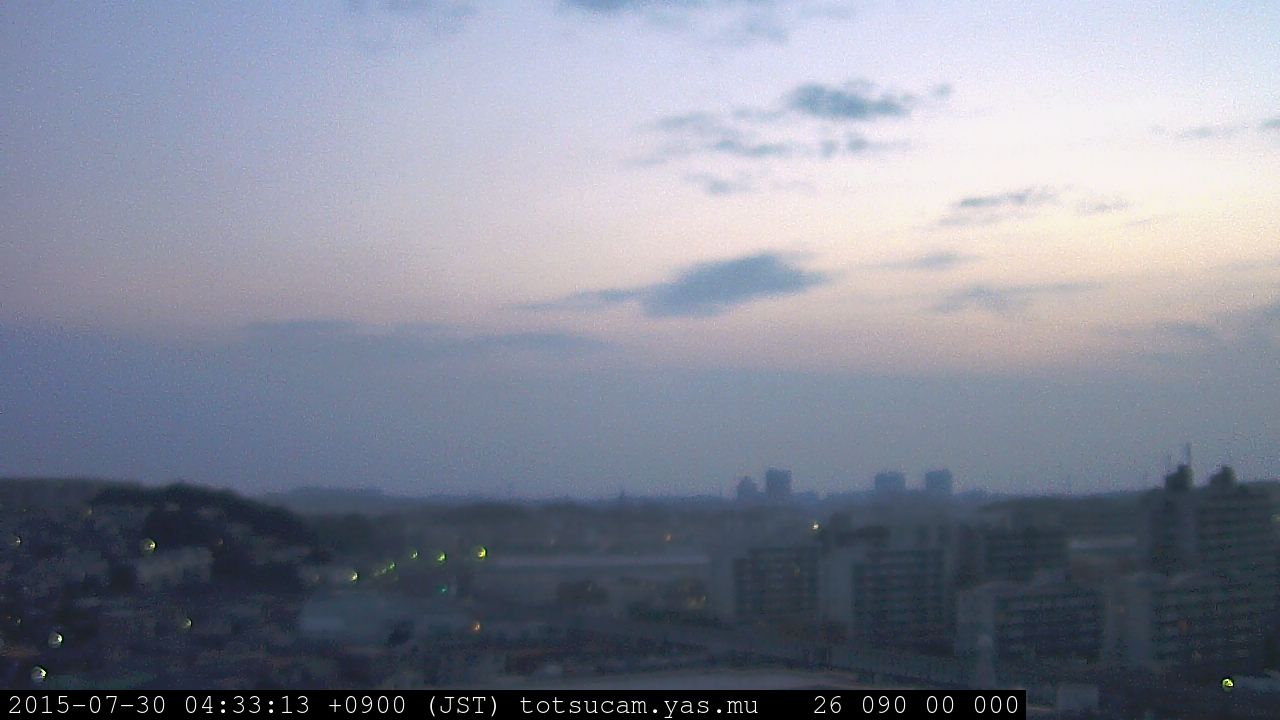 横浜市戸塚駅周辺から 東戸塚方面(北北東)を望む展望カメラの映像です。 左は現在の映像です。 下に並んでいるのは、 7日間に亘る日の出どき、昼間、夕暮れどきの写真(サムネイル)です。 それぞれ、日の出15分前、南中時、日没20分後の写真となっています。 各写真の下にはmpeg形式の動画へのリンクがあります。 それぞれ、日の出、南中、日没の前後1時間の画像です。 右欄にはその日24時間の動画へのリンクがあります。 この7日間以外は日付が一覧表示されています。 日付部分をクリックすると、 その日付から7日分が展開されて表示されます。