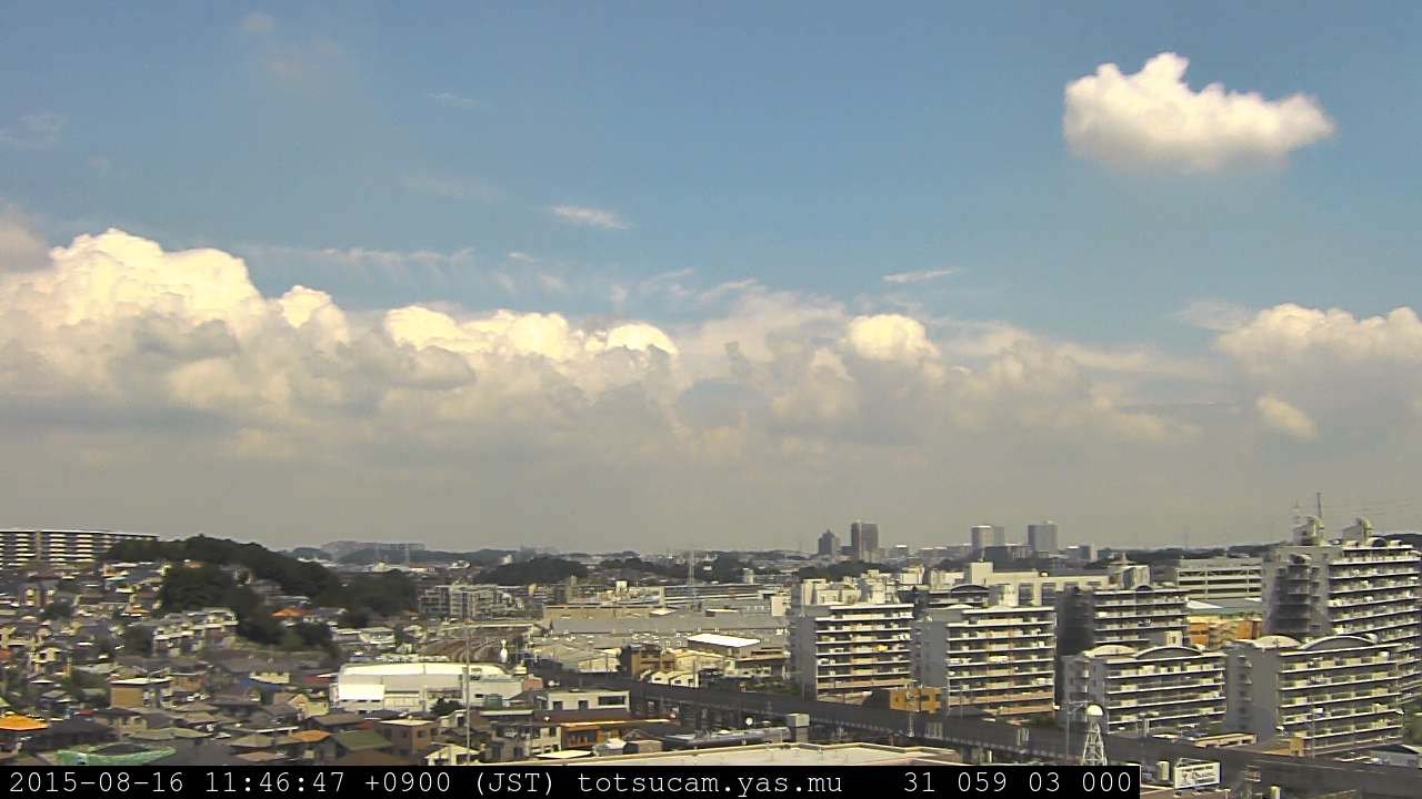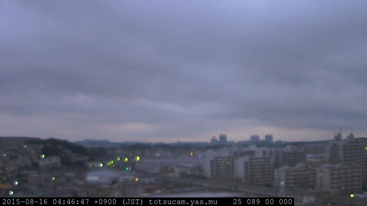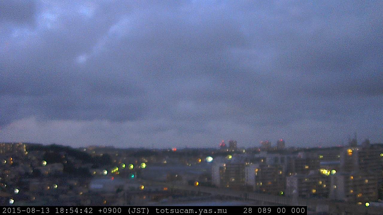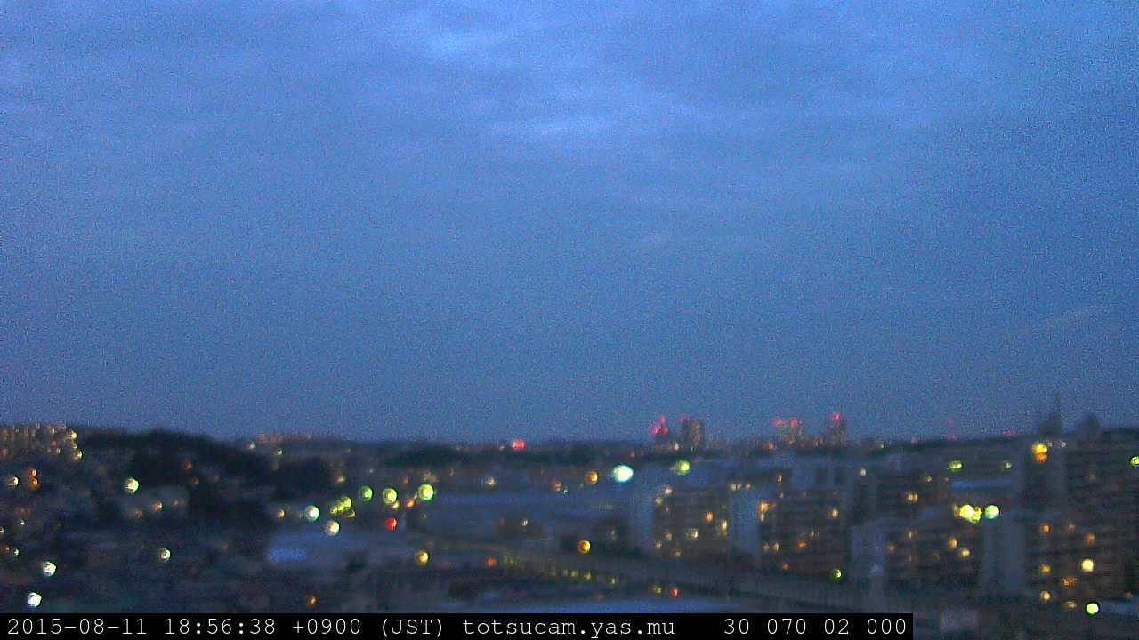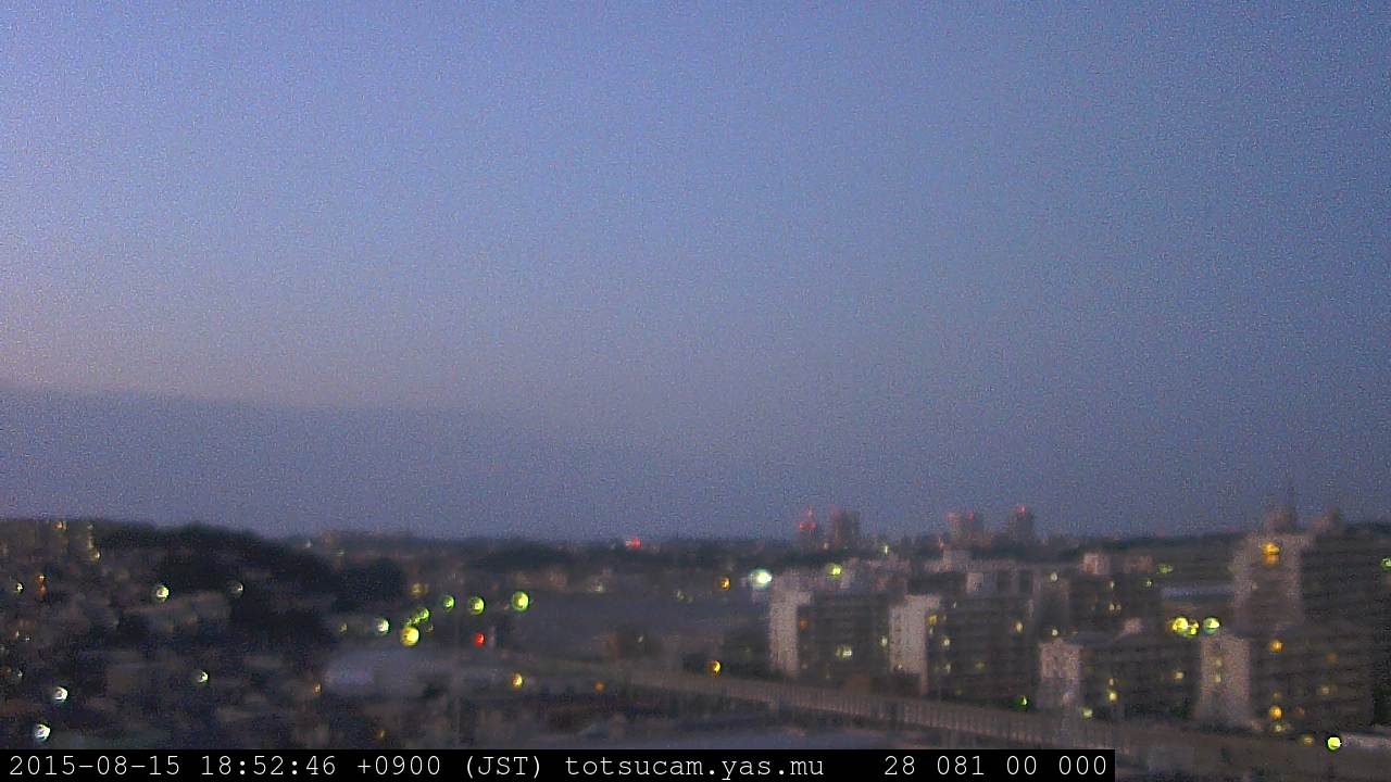 横浜市戸塚駅周辺から 東戸塚方面(北北東)を望む展望カメラの映像です。 左は現在の映像です。 下に並んでいるのは、 7日間に亘る日の出どき、昼間、夕暮れどきの写真(サムネイル)です。 それぞれ、日の出15分前、南中時、日没20分後の写真となっています。 各写真の下にはmpeg形式の動画へのリンクがあります。 それぞれ、日の出、南中、日没の前後1時間の画像です。 右欄にはその日24時間の動画へのリンクがあります。 この7日間以外は日付が一覧表示されています。 日付部分をクリックすると、 その日付から7日分が展開されて表示されます。