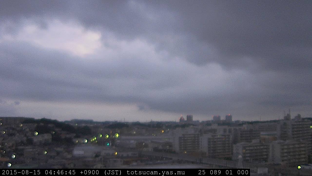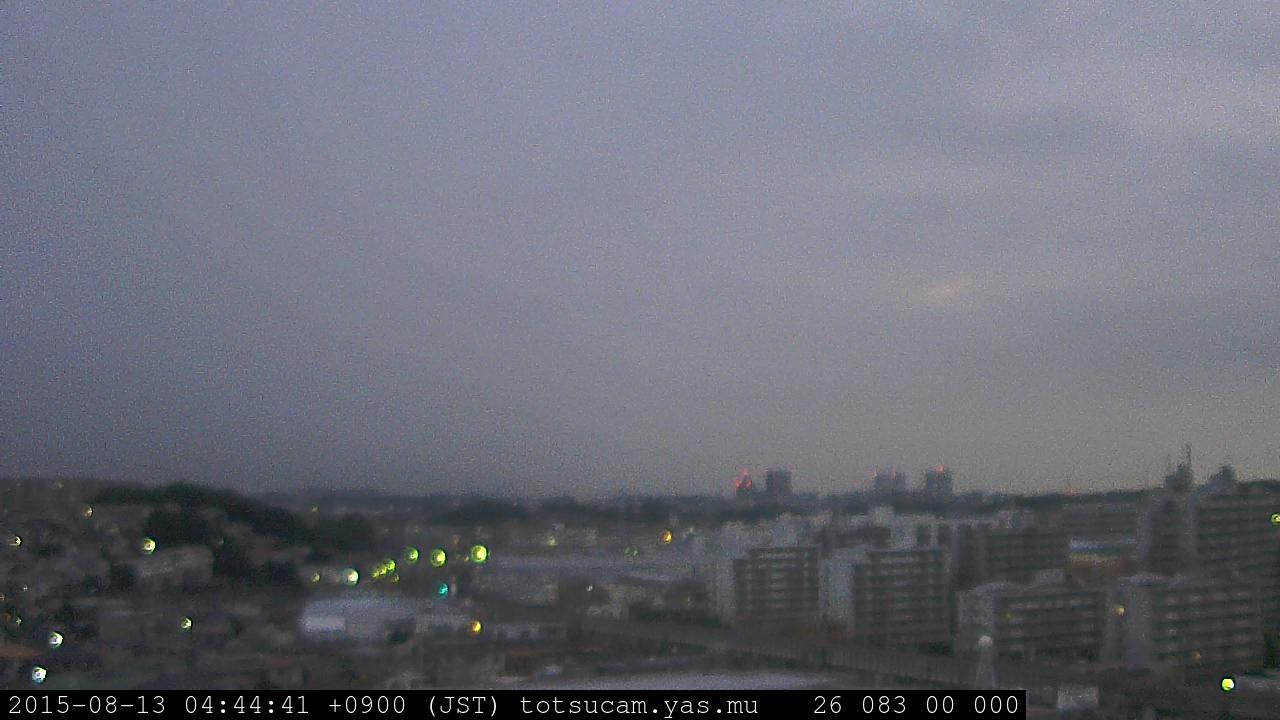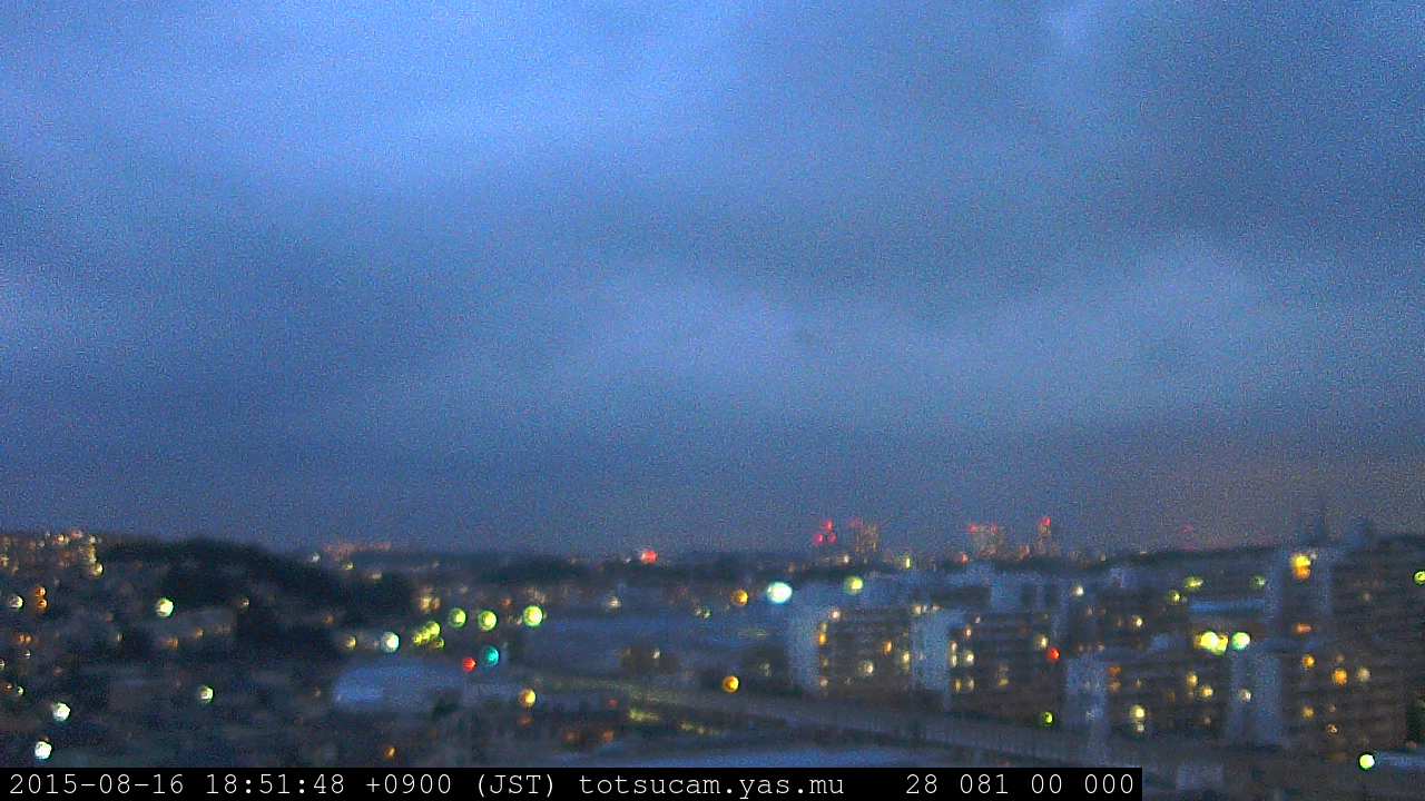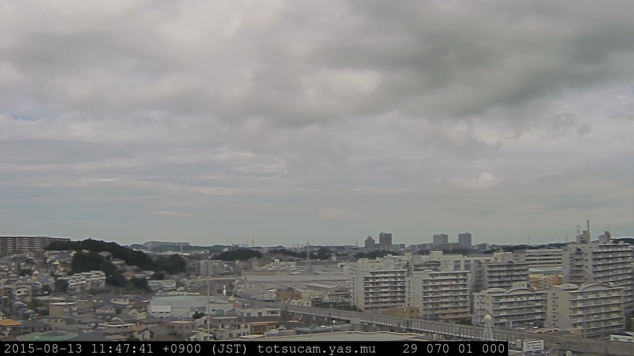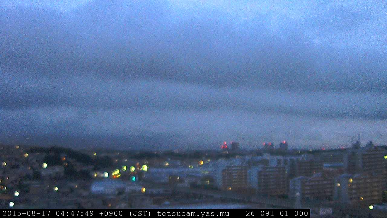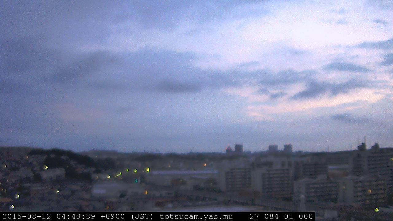 横浜市戸塚駅周辺から 東戸塚方面(北北東)を望む展望カメラの映像です。 左は現在の映像です。 下に並んでいるのは、 7日間に亘る日の出どき、昼間、夕暮れどきの写真(サムネイル)です。 それぞれ、日の出15分前、南中時、日没20分後の写真となっています。 各写真の下にはmpeg形式の動画へのリンクがあります。 それぞれ、日の出、南中、日没の前後1時間の画像です。 右欄にはその日24時間の動画へのリンクがあります。 この7日間以外は日付が一覧表示されています。 日付部分をクリックすると、 その日付から7日分が展開されて表示されます。