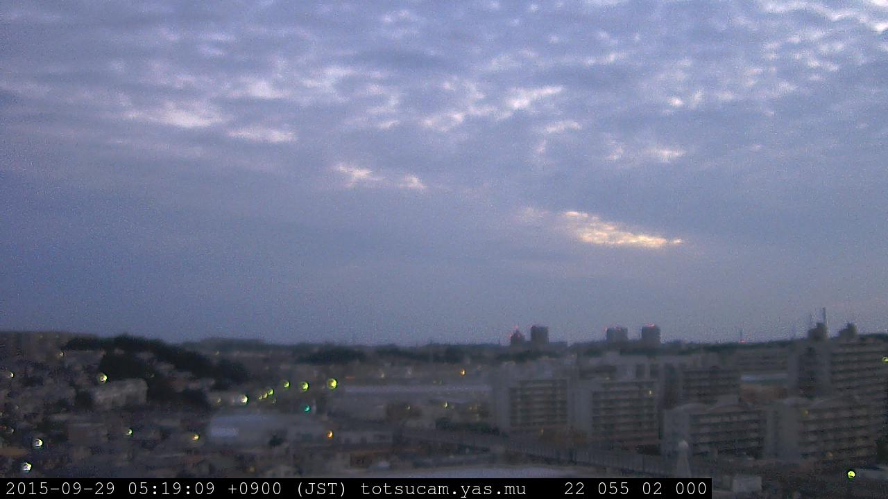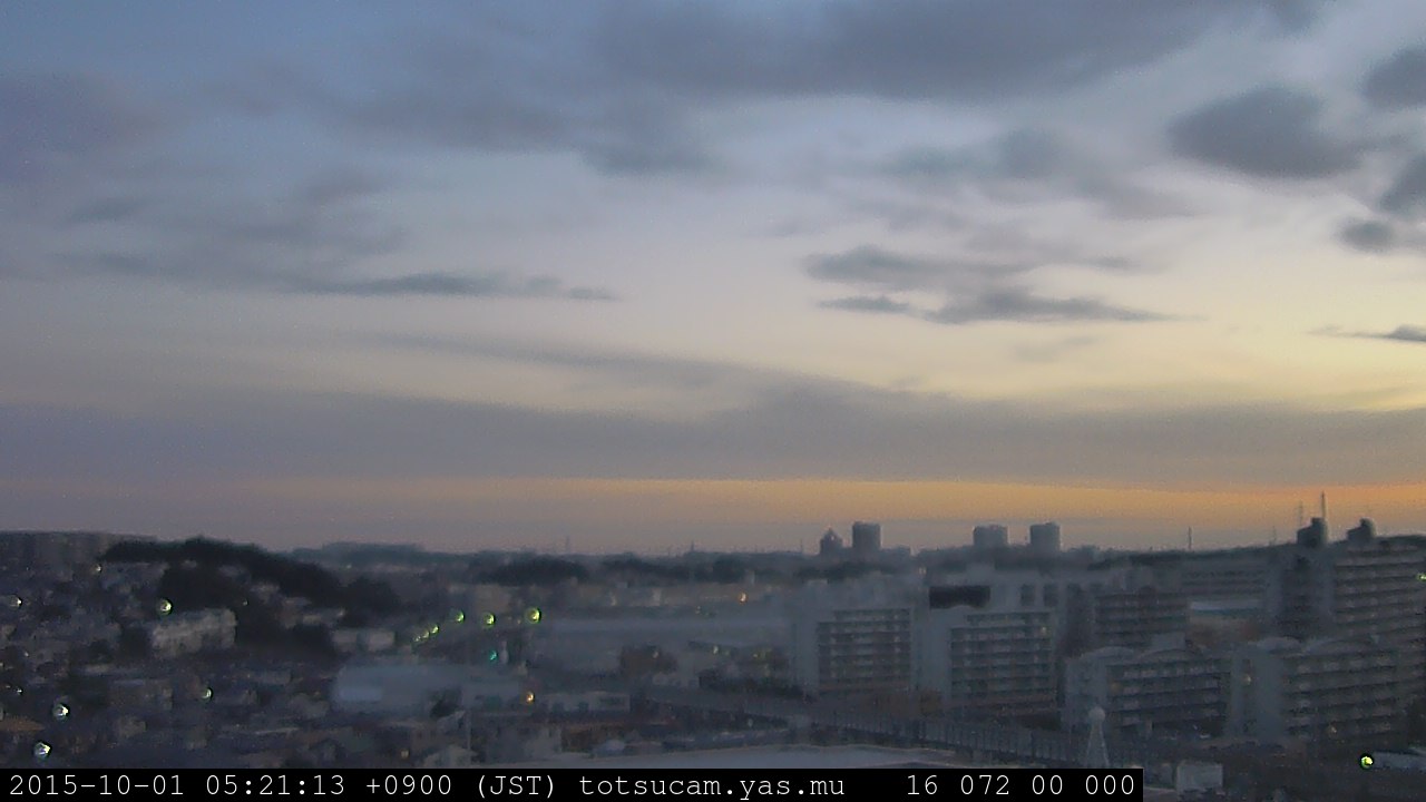 横浜市戸塚駅周辺から 東戸塚方面(北北東)を望む展望カメラの映像です。 左は現在の映像です。 下に並んでいるのは、 7日間に亘る日の出どき、昼間、夕暮れどきの写真(サムネイル)です。 それぞれ、日の出15分前、南中時、日没20分後の写真となっています。 各写真の下にはmpeg形式の動画へのリンクがあります。 それぞれ、日の出、南中、日没の前後1時間の画像です。 右欄にはその日24時間の動画へのリンクがあります。 この7日間以外は日付が一覧表示されています。 日付部分をクリックすると、 その日付から7日分が展開されて表示されます。