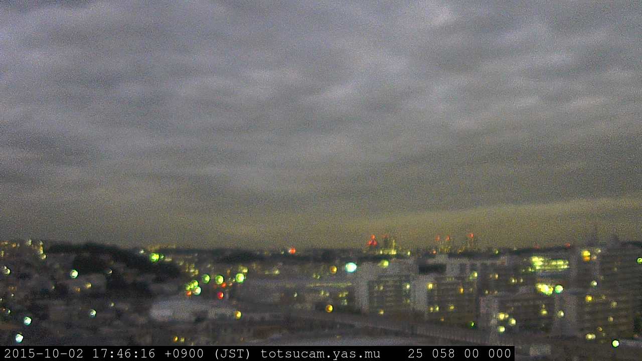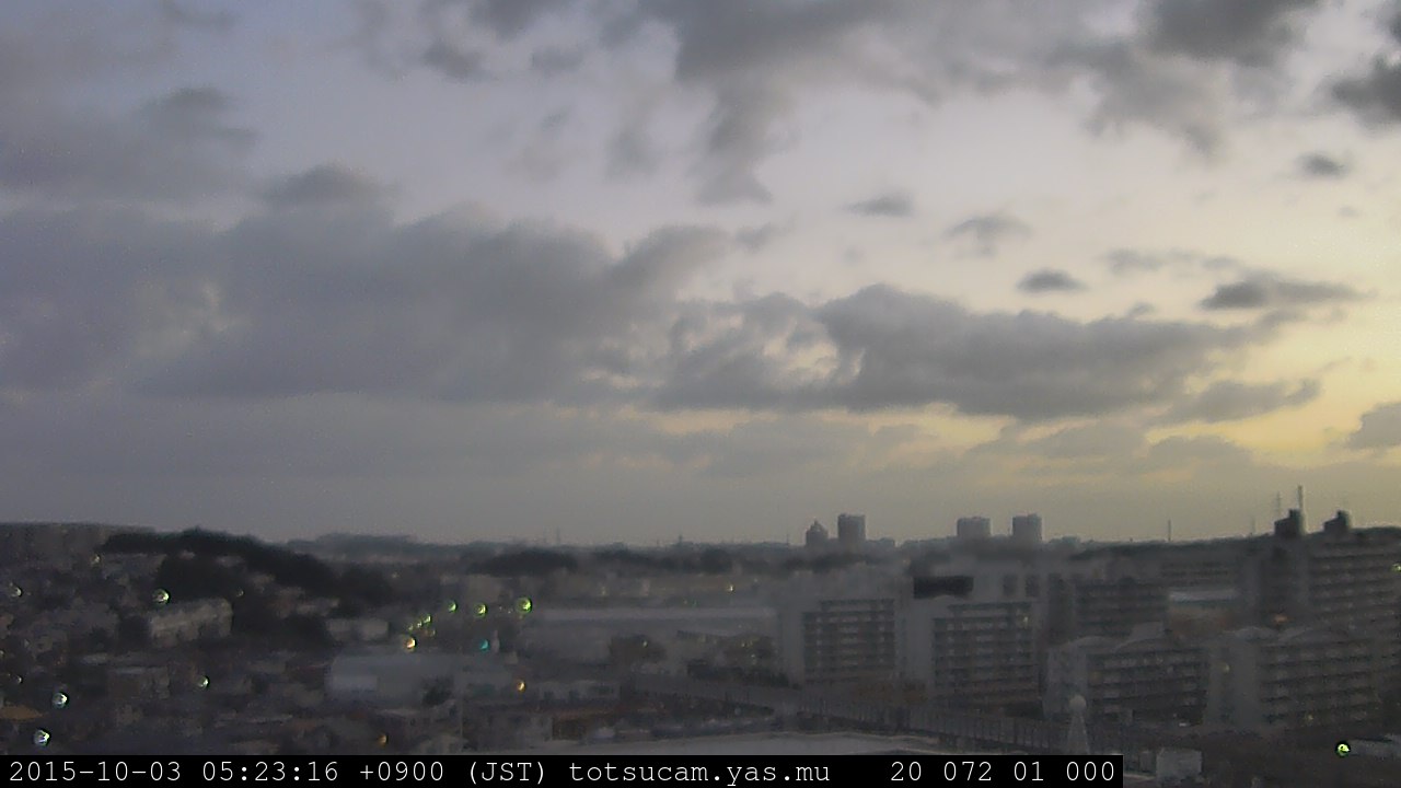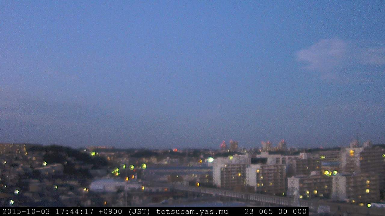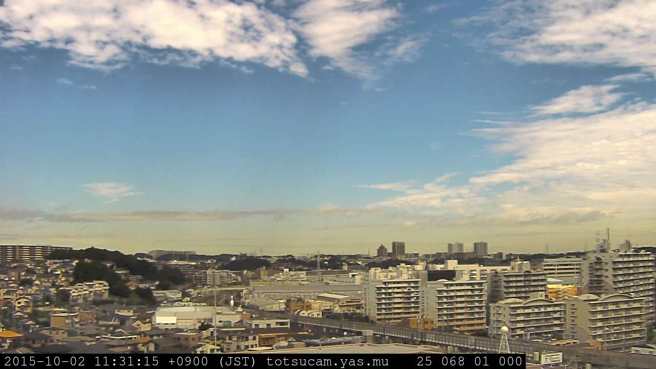 横浜市戸塚駅周辺から 東戸塚方面(北北東)を望む展望カメラの映像です。 左は現在の映像です。 下に並んでいるのは、 7日間に亘る日の出どき、昼間、夕暮れどきの写真(サムネイル)です。 それぞれ、日の出15分前、南中時、日没20分後の写真となっています。 各写真の下にはmpeg形式の動画へのリンクがあります。 それぞれ、日の出、南中、日没の前後1時間の画像です。 右欄にはその日24時間の動画へのリンクがあります。 この7日間以外は日付が一覧表示されています。 日付部分をクリックすると、 その日付から7日分が展開されて表示されます。