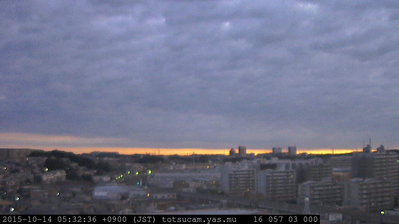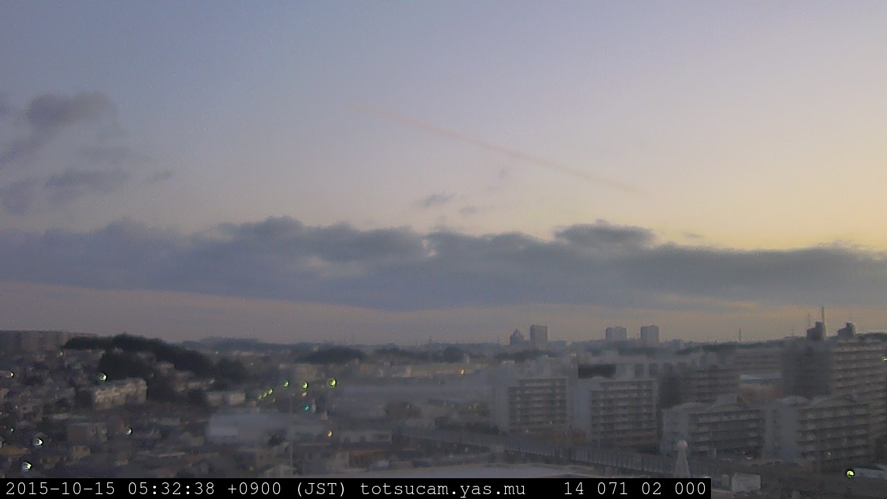 横浜市戸塚駅周辺から 東戸塚方面(北北東)を望む展望カメラの映像です。 左は現在の映像です。 下に並んでいるのは、 7日間に亘る日の出どき、昼間、夕暮れどきの写真(サムネイル)です。 それぞれ、日の出15分前、南中時、日没20分後の写真となっています。 各写真の下にはmpeg形式の動画へのリンクがあります。 それぞれ、日の出、南中、日没の前後1時間の画像です。 右欄にはその日24時間の動画へのリンクがあります。 この7日間以外は日付が一覧表示されています。 日付部分をクリックすると、 その日付から7日分が展開されて表示されます。
