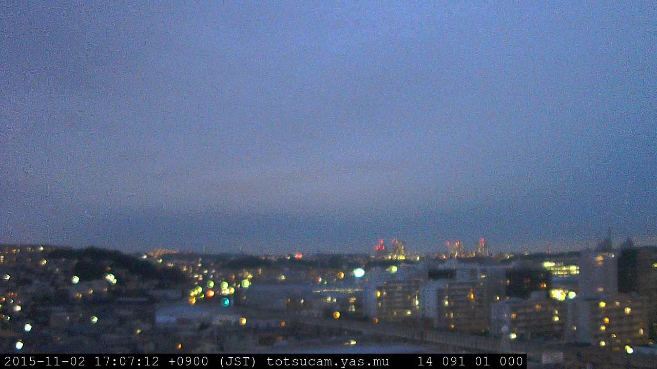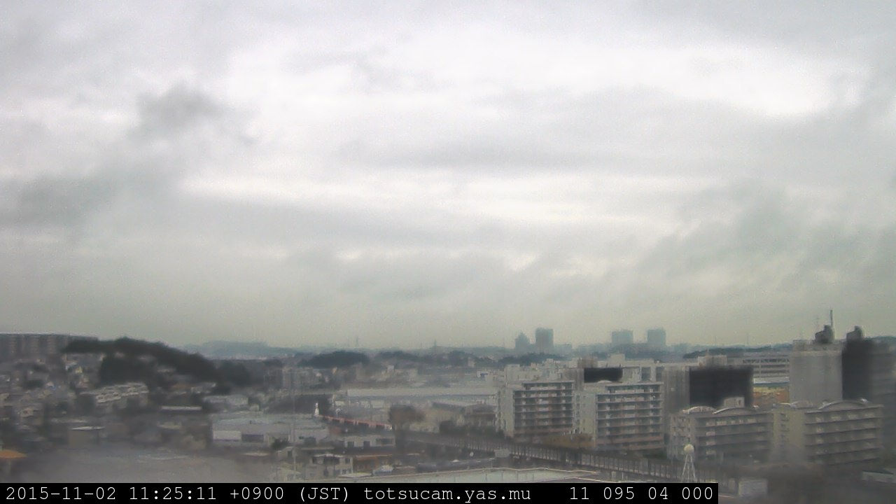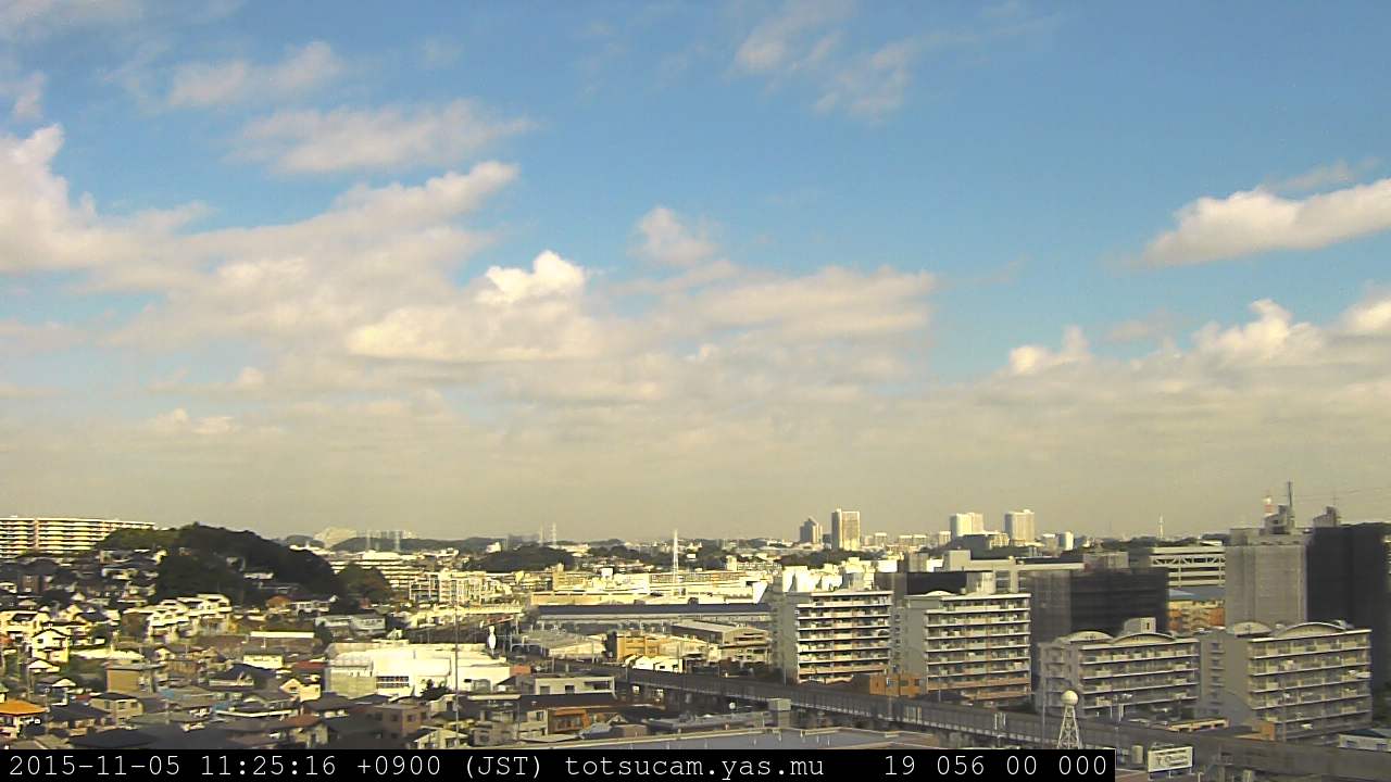 適度に曇った日の雲の動き (例: 2005-10-24) がとても楽しめます。 正面を横切っている高架は横須賀線下りです。 その下に横須賀線上り、東海道線、同貨物線が走っていますが、 高架に隠れていてよく見えません。 夜間は特に中央左寄りの車の動きがよく見えます。