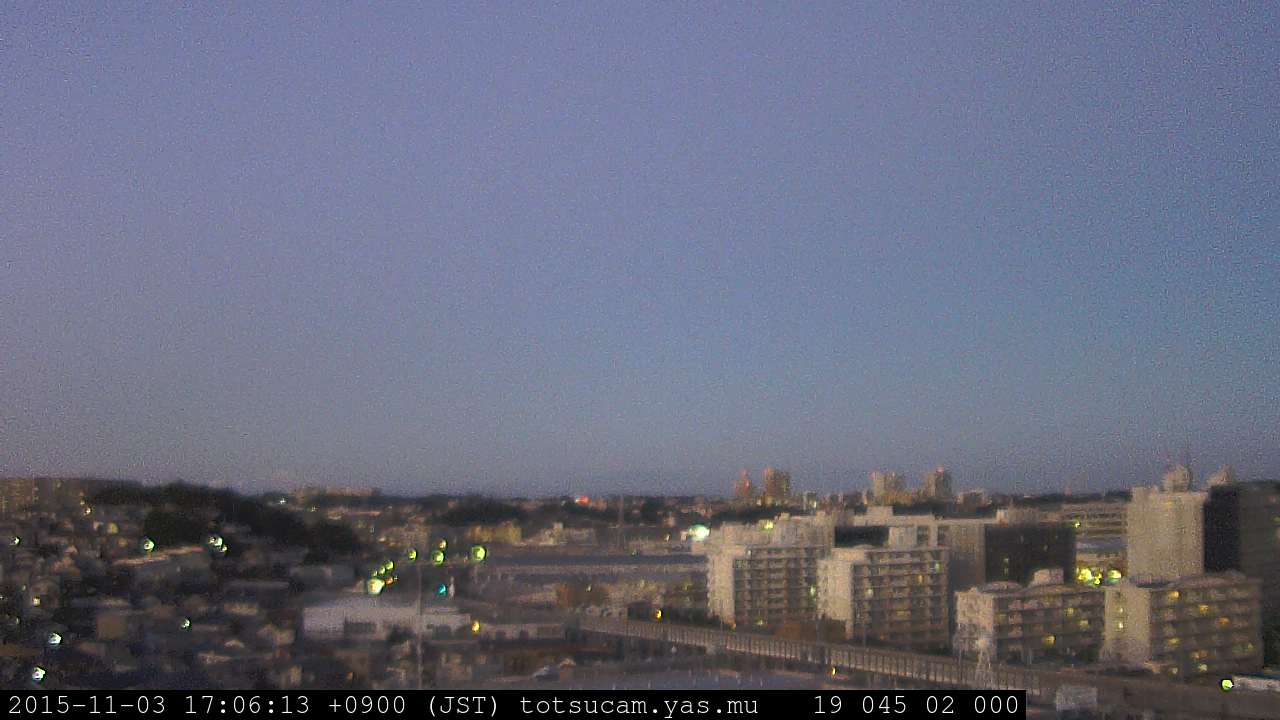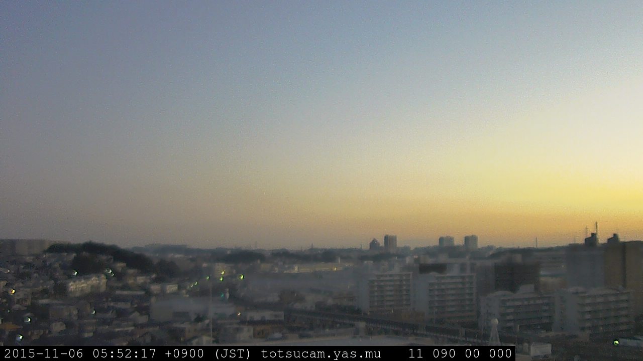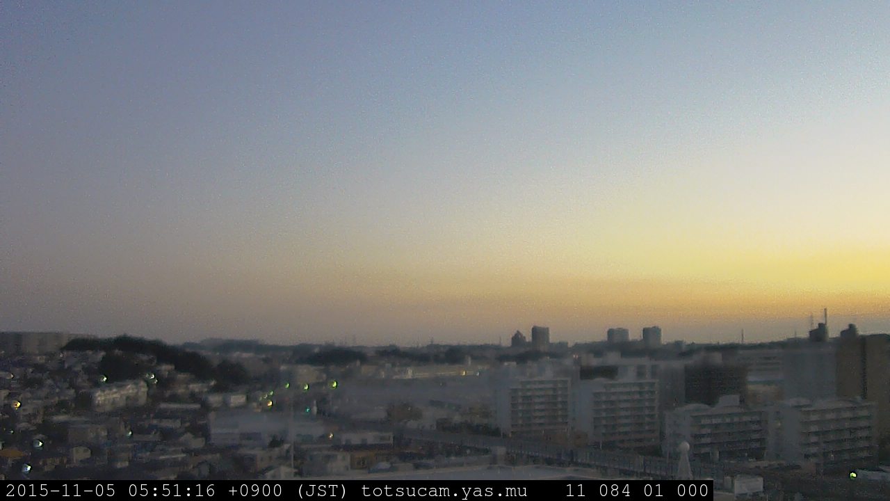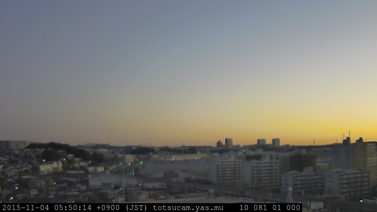 横浜市戸塚駅周辺から 東戸塚方面(北北東)を望む展望カメラの映像です。 左は現在の映像です。 下に並んでいるのは、 7日間に亘る日の出どき、昼間、夕暮れどきの写真(サムネイル)です。 それぞれ、日の出15分前、南中時、日没20分後の写真となっています。 各写真の下にはmpeg形式の動画へのリンクがあります。 それぞれ、日の出、南中、日没の前後1時間の画像です。 右欄にはその日24時間の動画へのリンクがあります。 この7日間以外は日付が一覧表示されています。 日付部分をクリックすると、 その日付から7日分が展開されて表示されます。