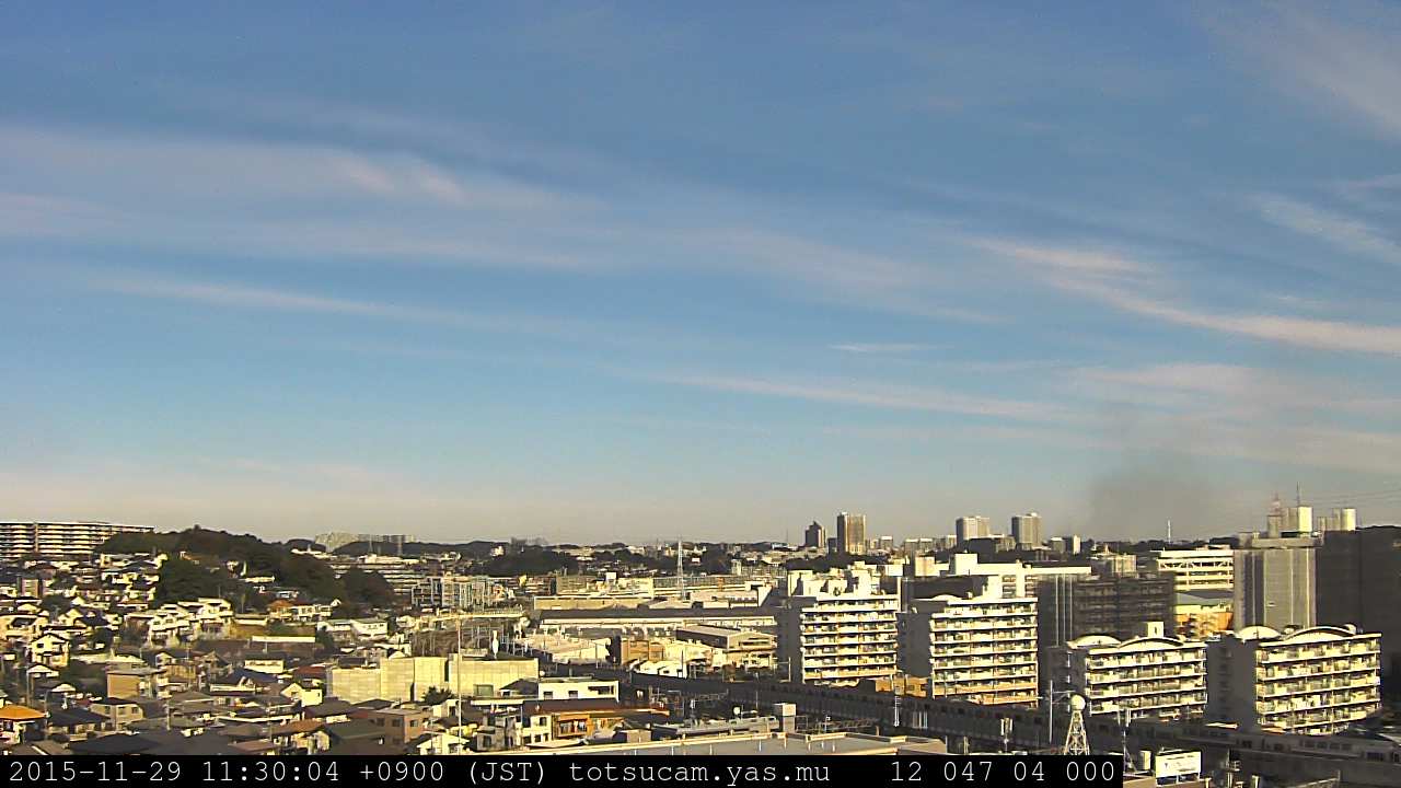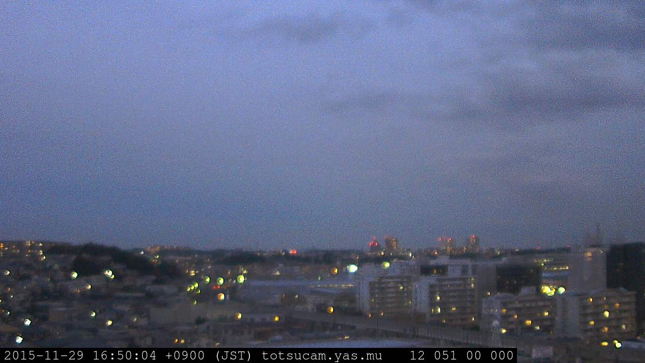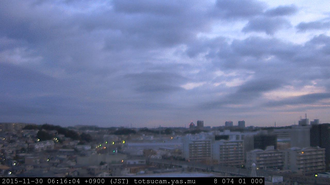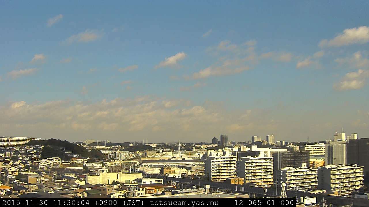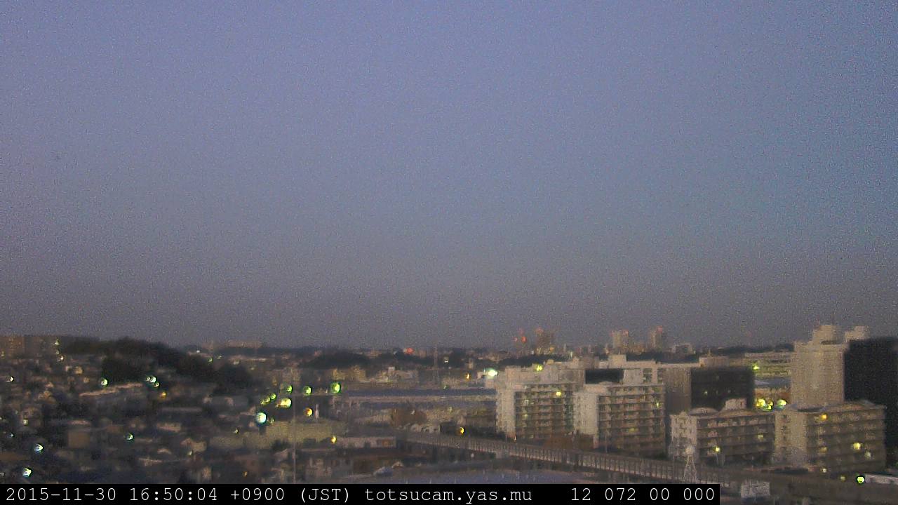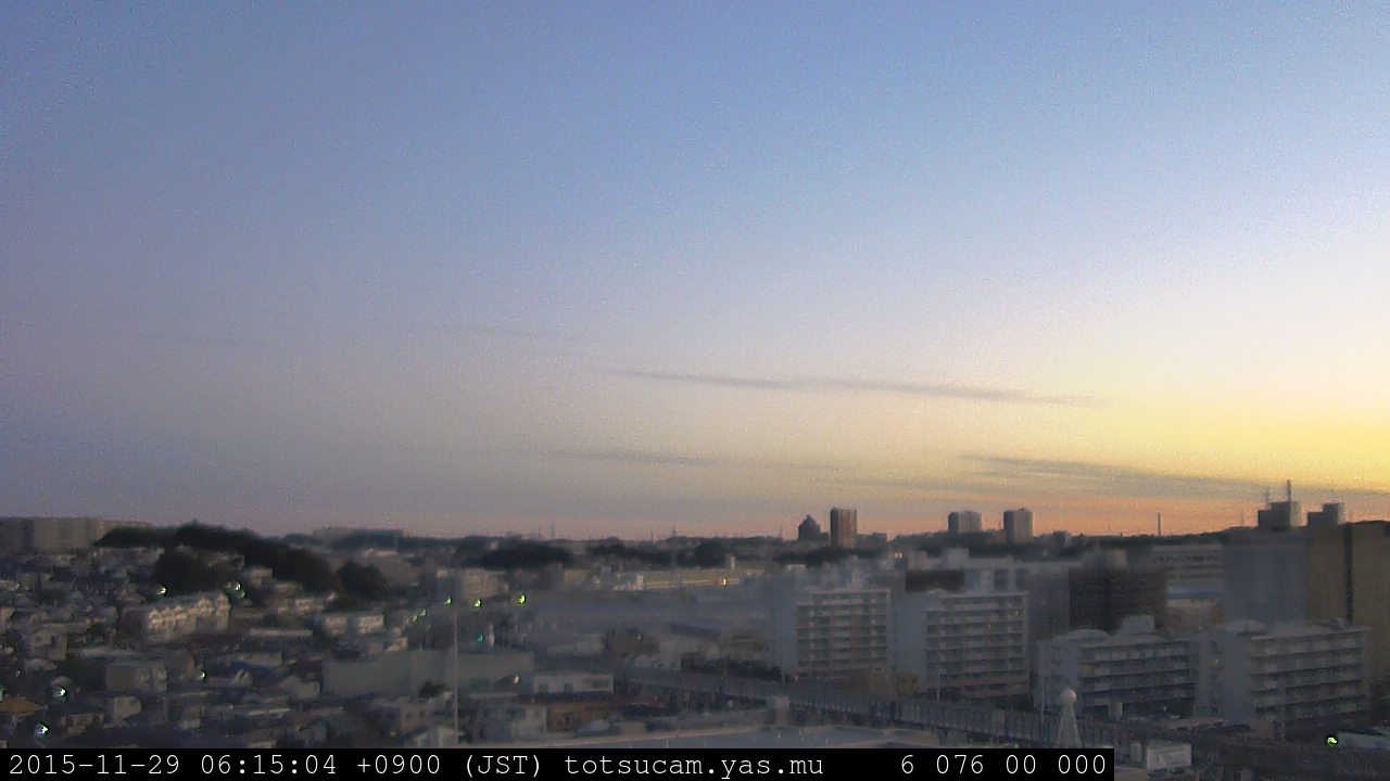 横浜市戸塚駅周辺から 東戸塚方面(北北東)を望む展望カメラの映像です。 左は現在の映像です。 下に並んでいるのは、 7日間に亘る日の出どき、昼間、夕暮れどきの写真(サムネイル)です。 それぞれ、日の出15分前、南中時、日没20分後の写真となっています。 各写真の下にはmpeg形式の動画へのリンクがあります。 それぞれ、日の出、南中、日没の前後1時間の画像です。 右欄にはその日24時間の動画へのリンクがあります。 この7日間以外は日付が一覧表示されています。 日付部分をクリックすると、 その日付から7日分が展開されて表示されます。