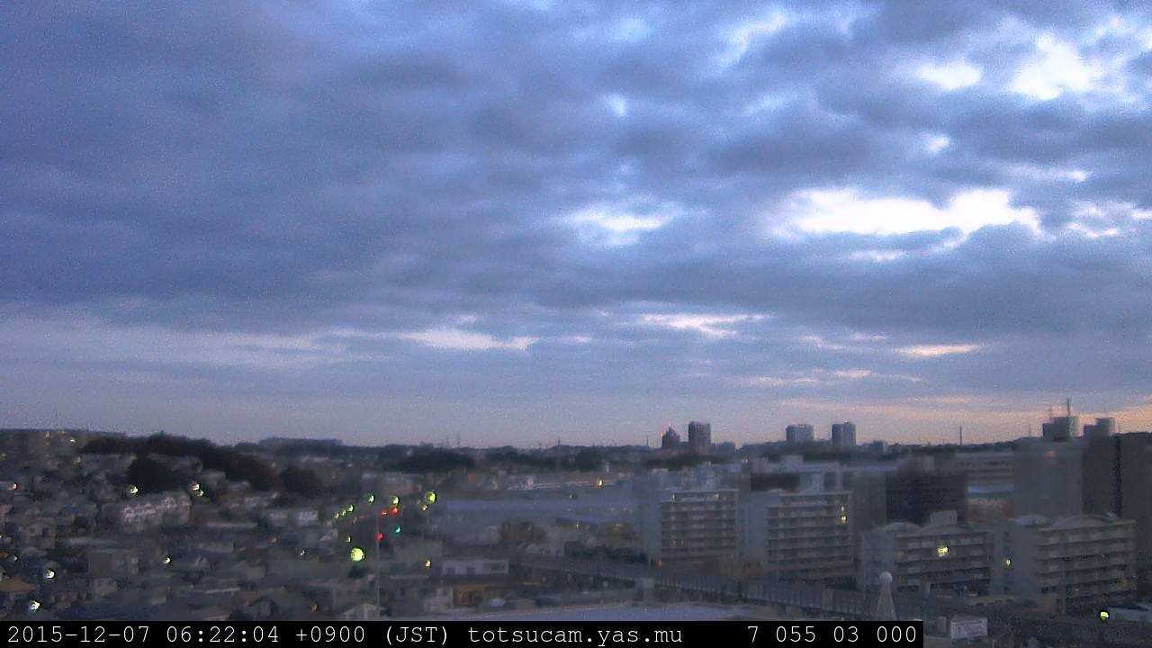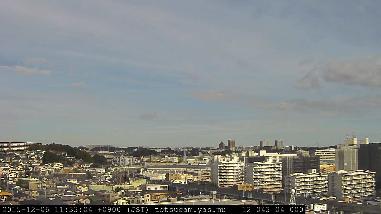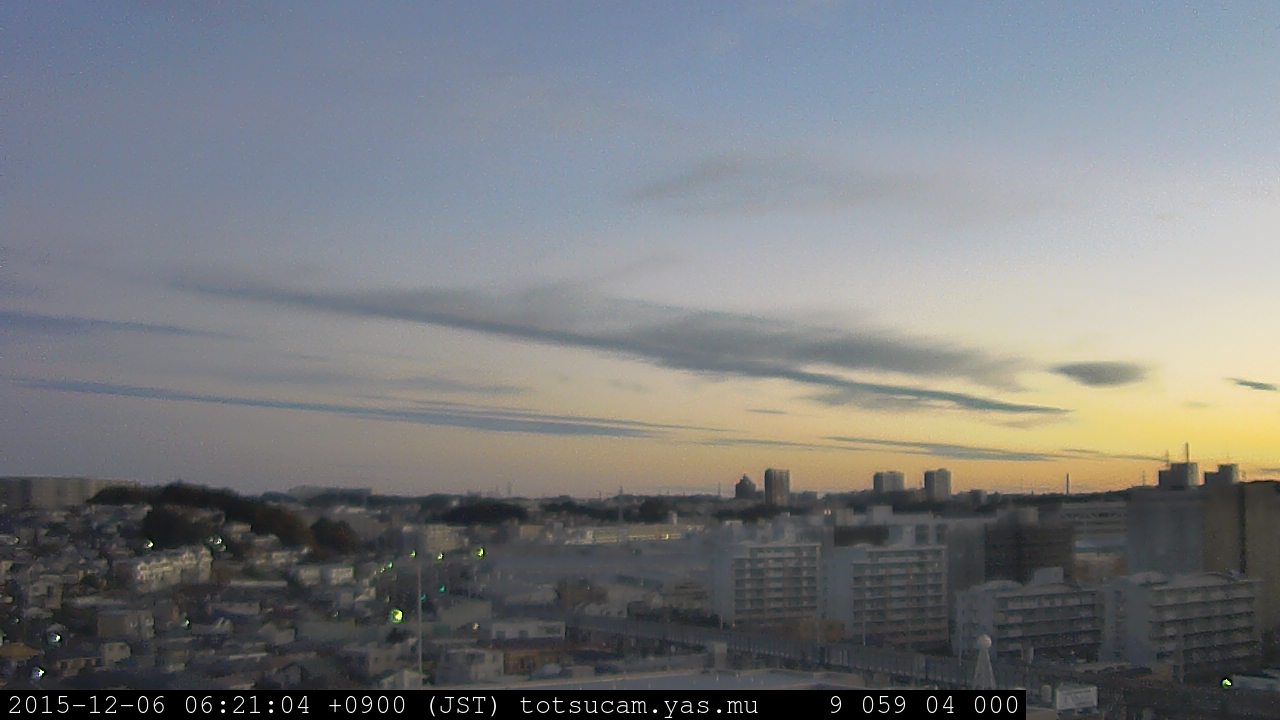 横浜市戸塚駅周辺から 東戸塚方面(北北東)を望む展望カメラの映像です。 左は現在の映像です。 下に並んでいるのは、 7日間に亘る日の出どき、昼間、夕暮れどきの写真(サムネイル)です。 それぞれ、日の出15分前、南中時、日没20分後の写真となっています。 各写真の下にはmpeg形式の動画へのリンクがあります。 それぞれ、日の出、南中、日没の前後1時間の画像です。 右欄にはその日24時間の動画へのリンクがあります。 この7日間以外は日付が一覧表示されています。 日付部分をクリックすると、 その日付から7日分が展開されて表示されます。