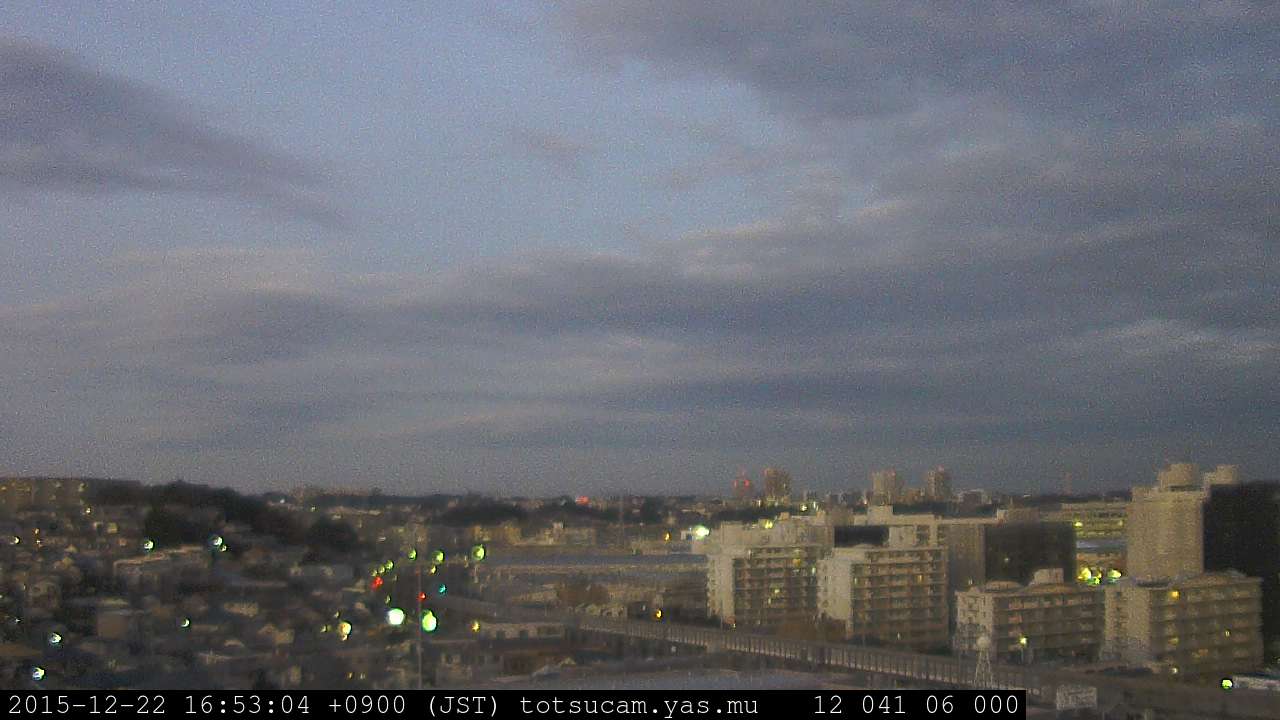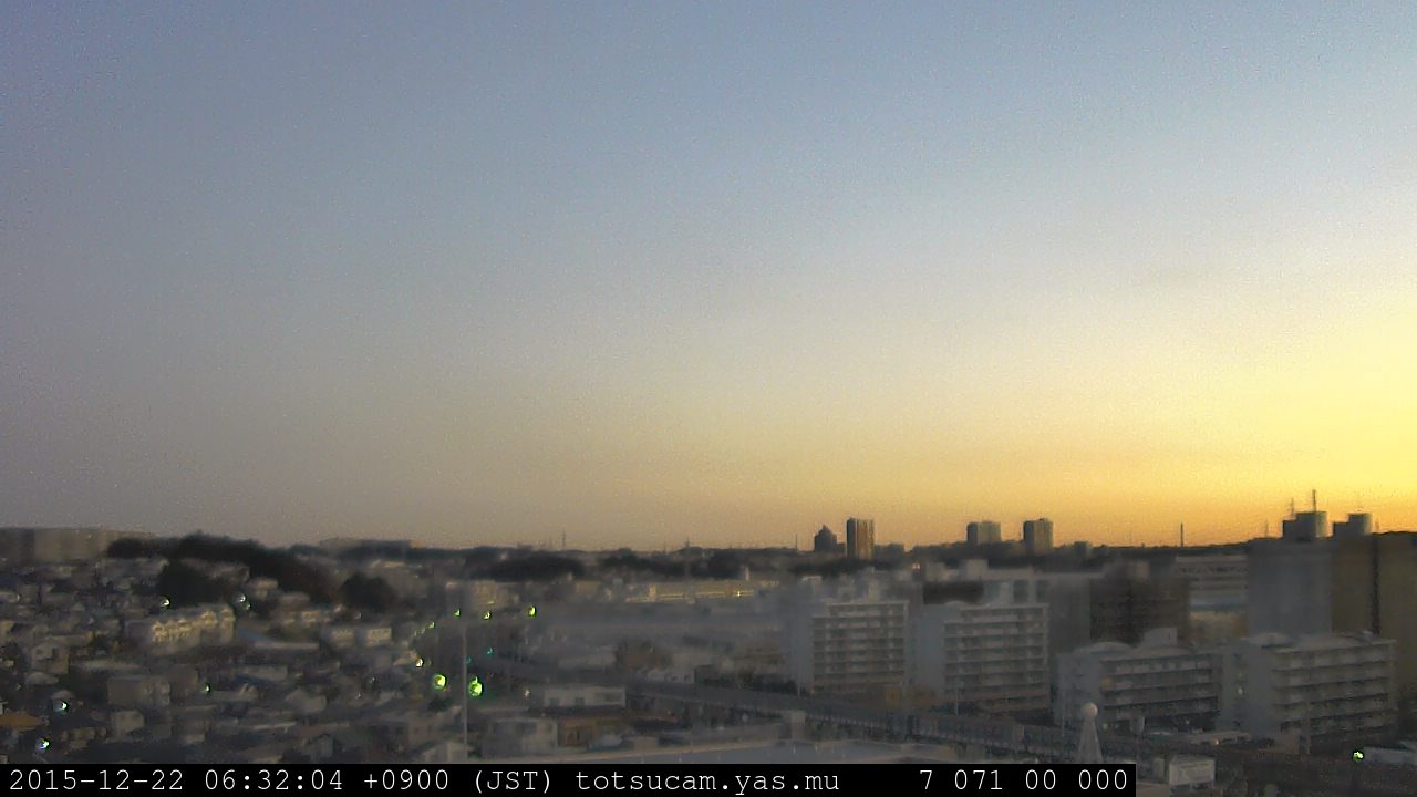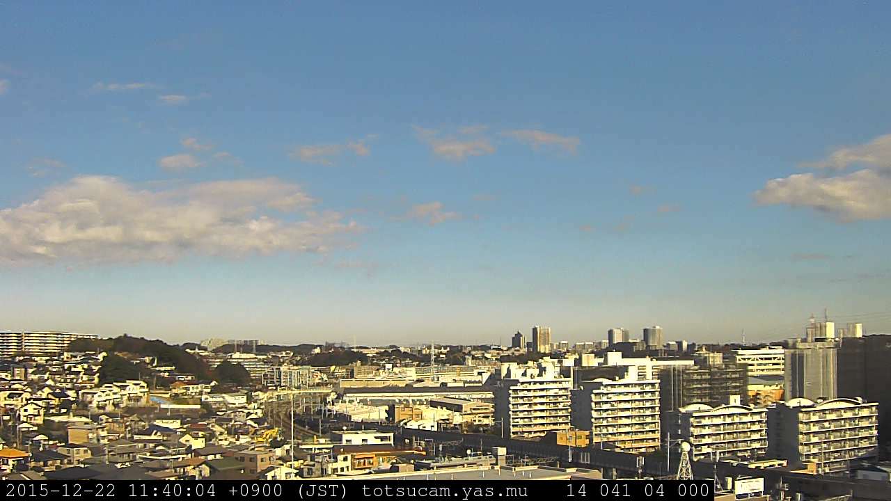 横浜市戸塚駅周辺から 東戸塚方面(北北東)を望む展望カメラの映像です。 左は現在の映像です。 下に並んでいるのは、 7日間に亘る日の出どき、昼間、夕暮れどきの写真(サムネイル)です。 それぞれ、日の出15分前、南中時、日没20分後の写真となっています。 各写真の下にはmpeg形式の動画へのリンクがあります。 それぞれ、日の出、南中、日没の前後1時間の画像です。 右欄にはその日24時間の動画へのリンクがあります。 この7日間以外は日付が一覧表示されています。 日付部分をクリックすると、 その日付から7日分が展開されて表示されます。