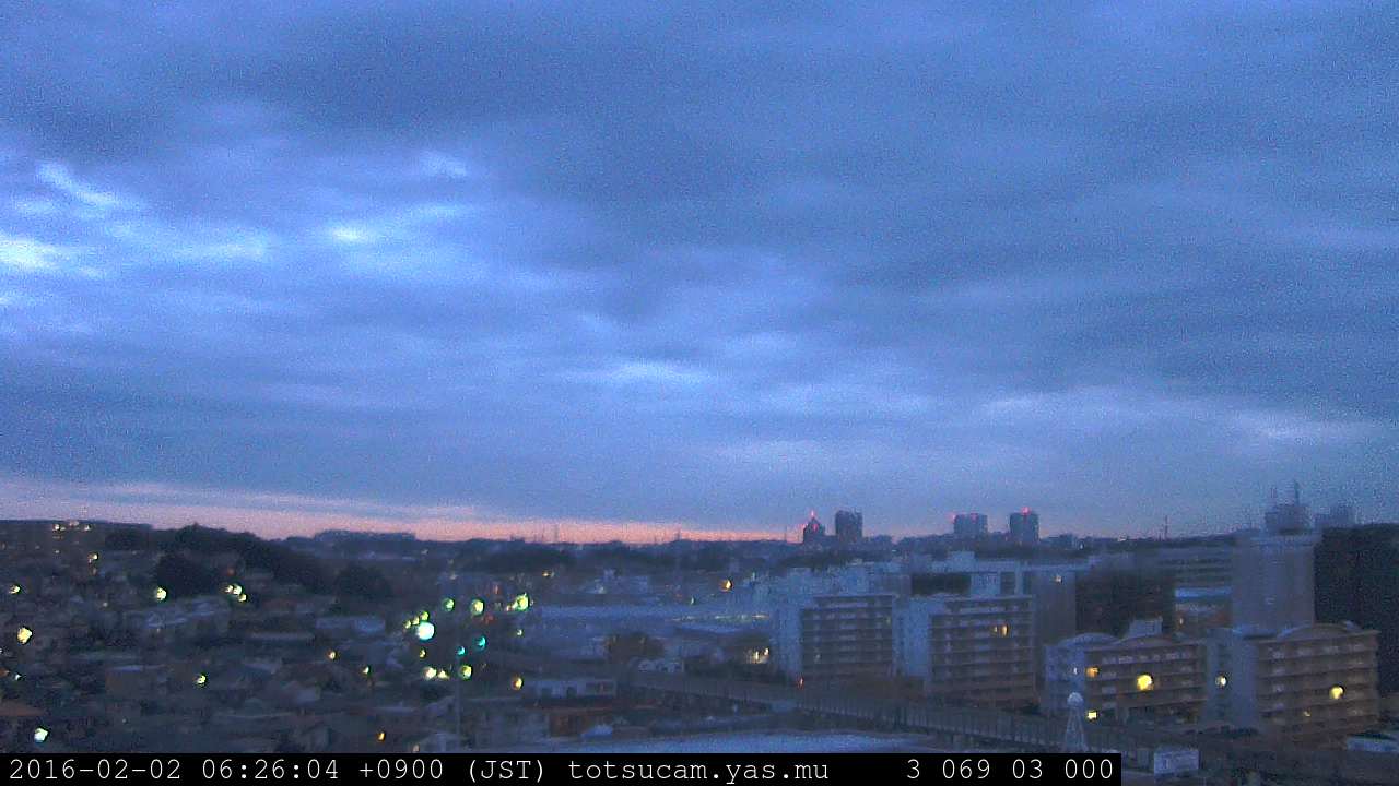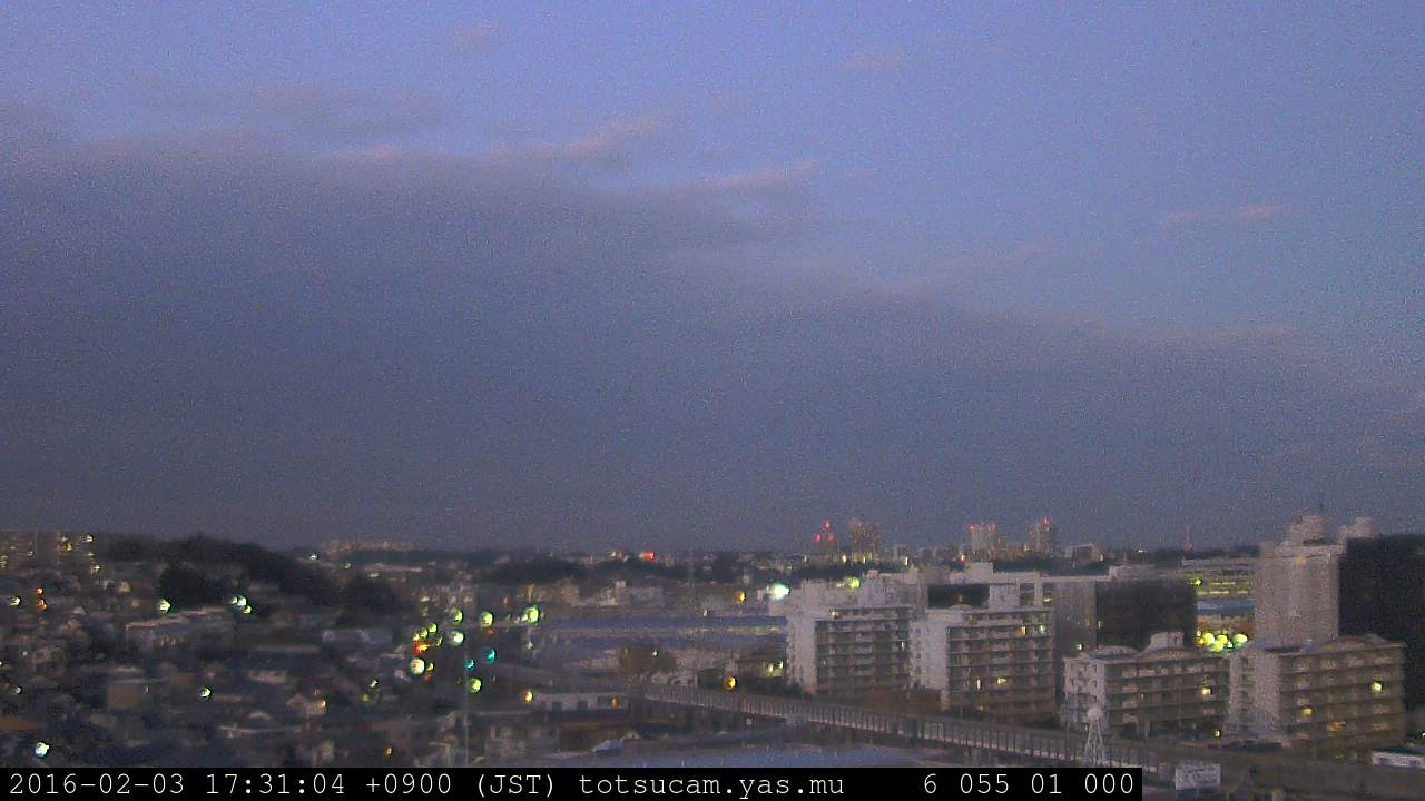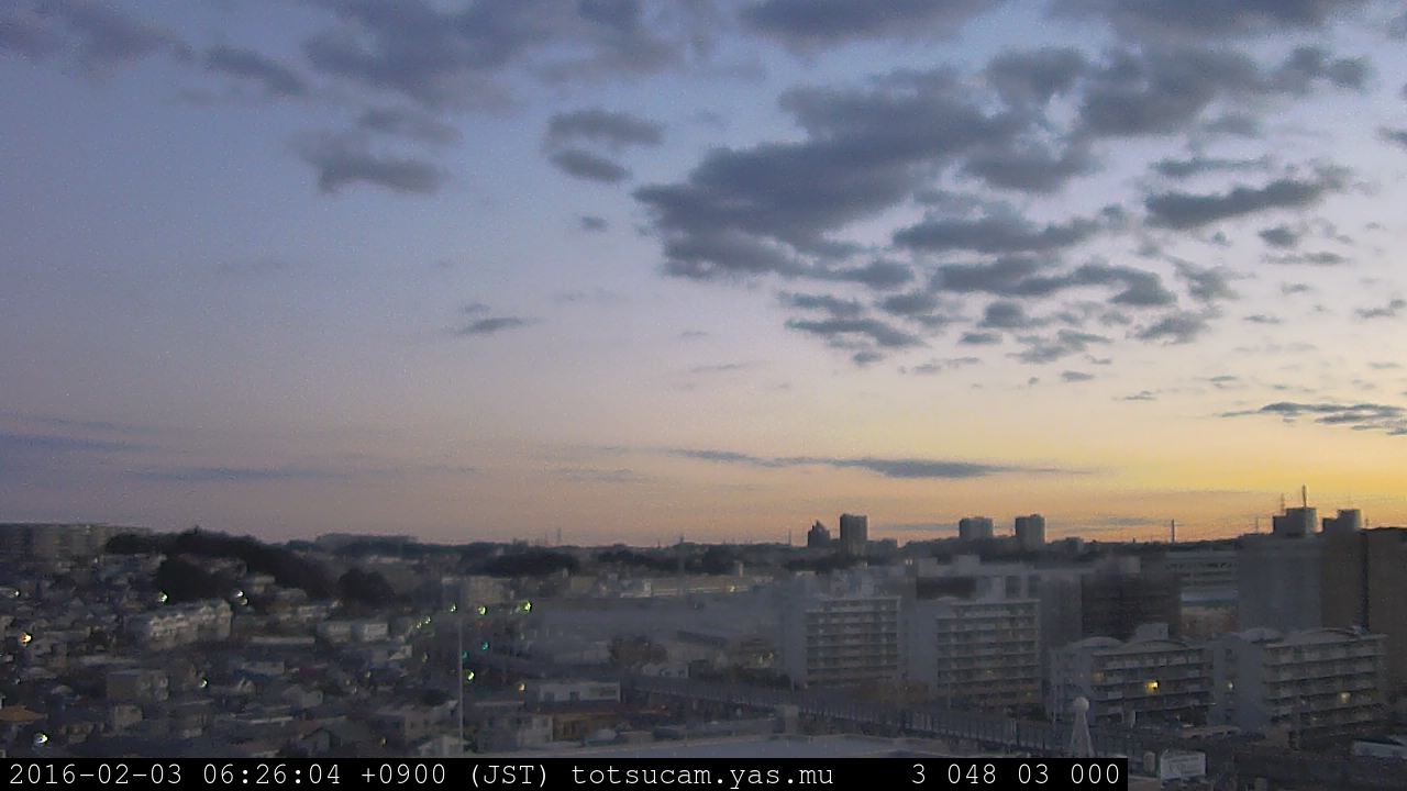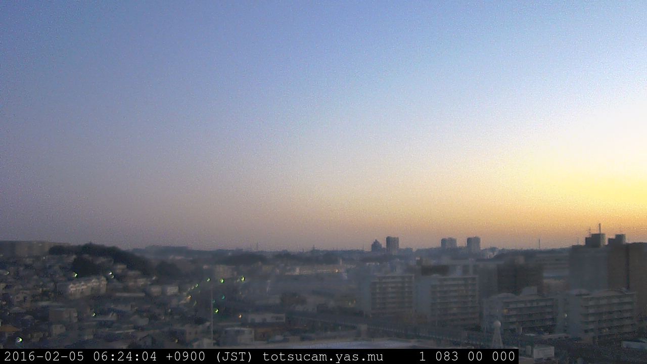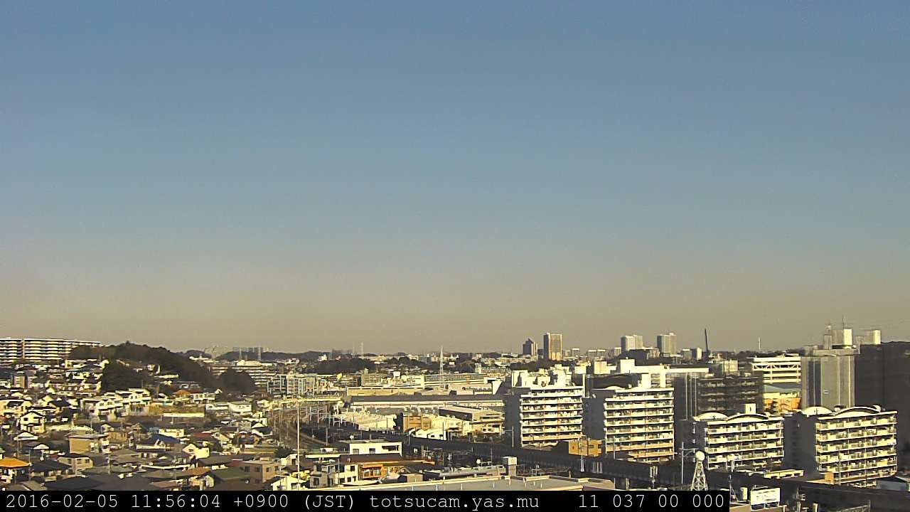 横浜市戸塚駅周辺から 東戸塚方面(北北東)を望む展望カメラの映像です。 左は現在の映像です。 下に並んでいるのは、 7日間に亘る日の出どき、昼間、夕暮れどきの写真(サムネイル)です。 それぞれ、日の出15分前、南中時、日没20分後の写真となっています。 各写真の下にはmpeg形式の動画へのリンクがあります。 それぞれ、日の出、南中、日没の前後1時間の画像です。 右欄にはその日24時間の動画へのリンクがあります。 この7日間以外は日付が一覧表示されています。 日付部分をクリックすると、 その日付から7日分が展開されて表示されます。