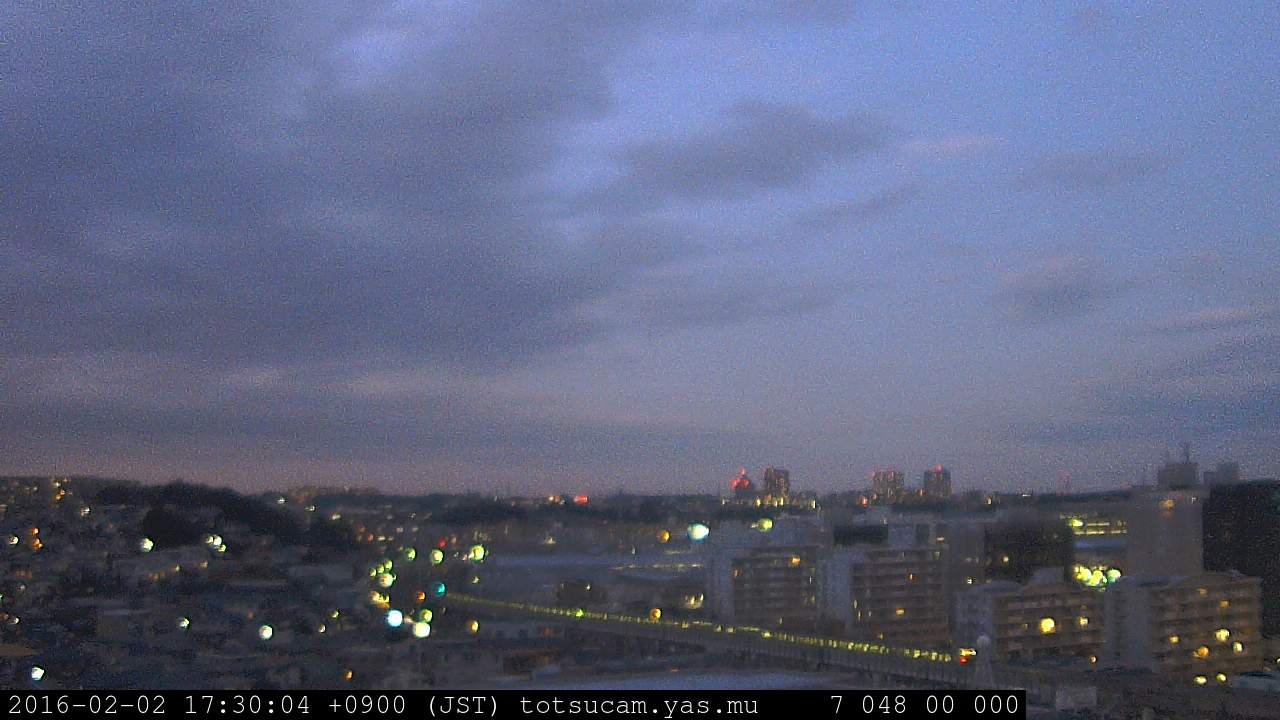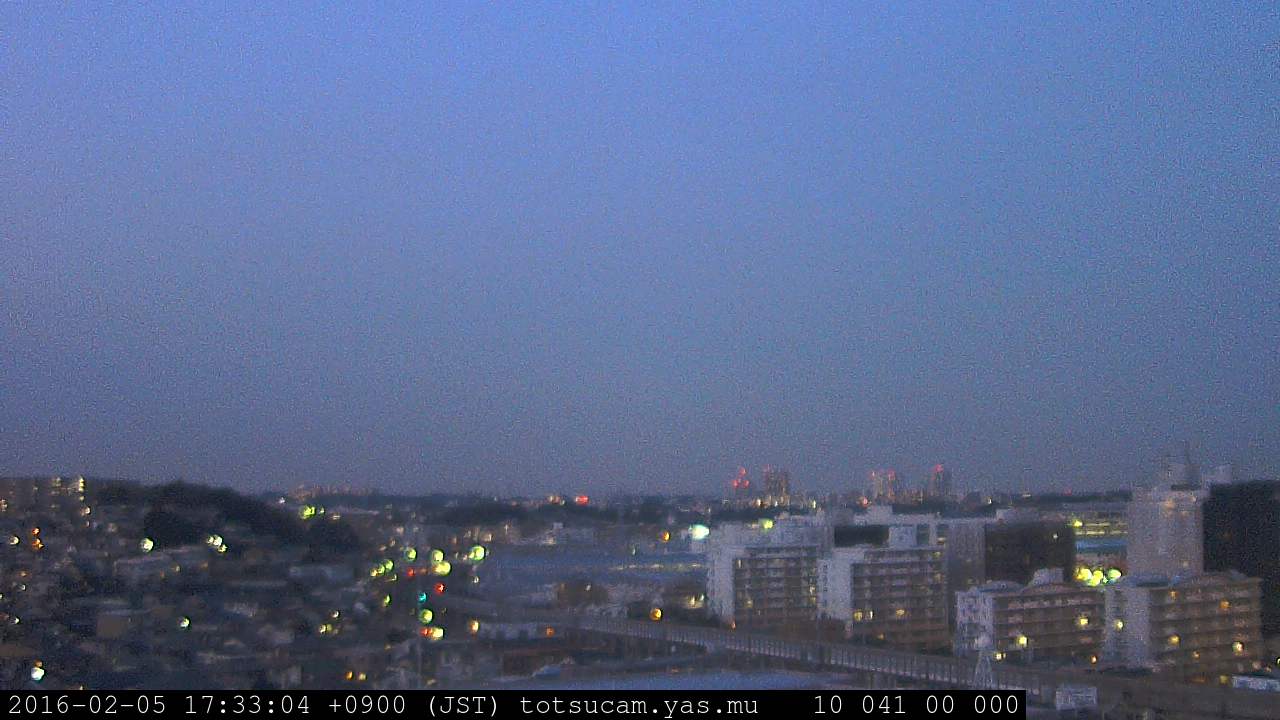適度に曇った日の雲の動き (例: 2005-10-24) がとても楽しめます。 正面を横切っている高架は横須賀線下りです。 その下に横須賀線上り、東海道線、同貨物線が走っていますが、 高架に隠れていてよく見えません。 夜間は特に中央左寄りの車の動きがよく見えます。