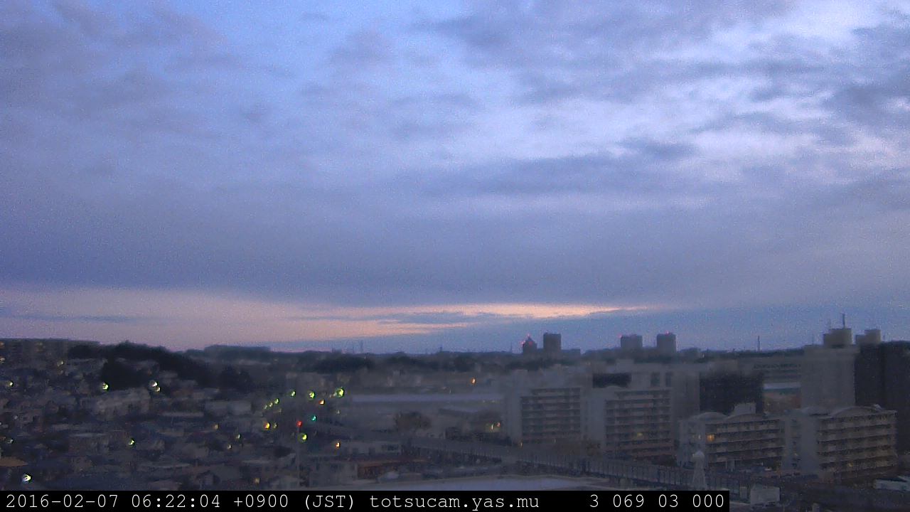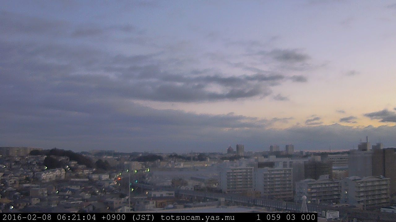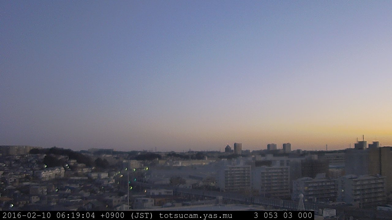 横浜市戸塚駅周辺から 東戸塚方面(北北東)を望む展望カメラの映像です。 左は現在の映像です。 下に並んでいるのは、 7日間に亘る日の出どき、昼間、夕暮れどきの写真(サムネイル)です。 それぞれ、日の出15分前、南中時、日没20分後の写真となっています。 各写真の下にはmpeg形式の動画へのリンクがあります。 それぞれ、日の出、南中、日没の前後1時間の画像です。 右欄にはその日24時間の動画へのリンクがあります。 この7日間以外は日付が一覧表示されています。 日付部分をクリックすると、 その日付から7日分が展開されて表示されます。