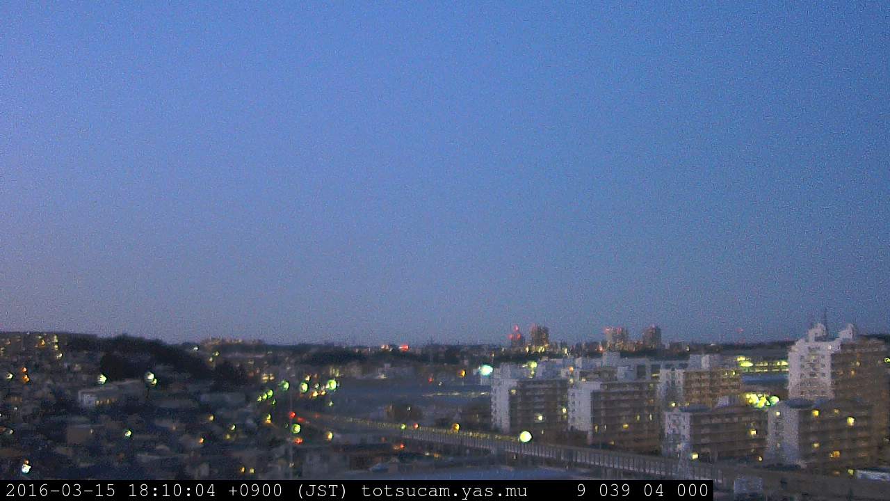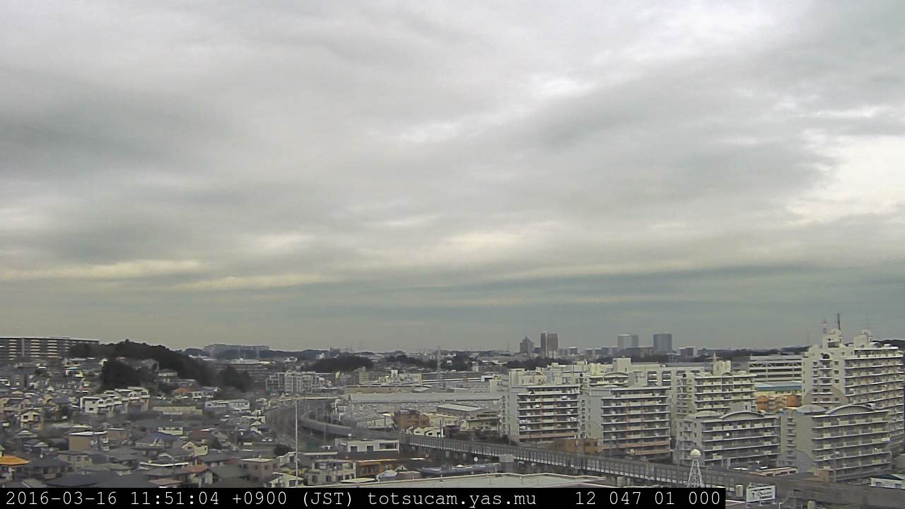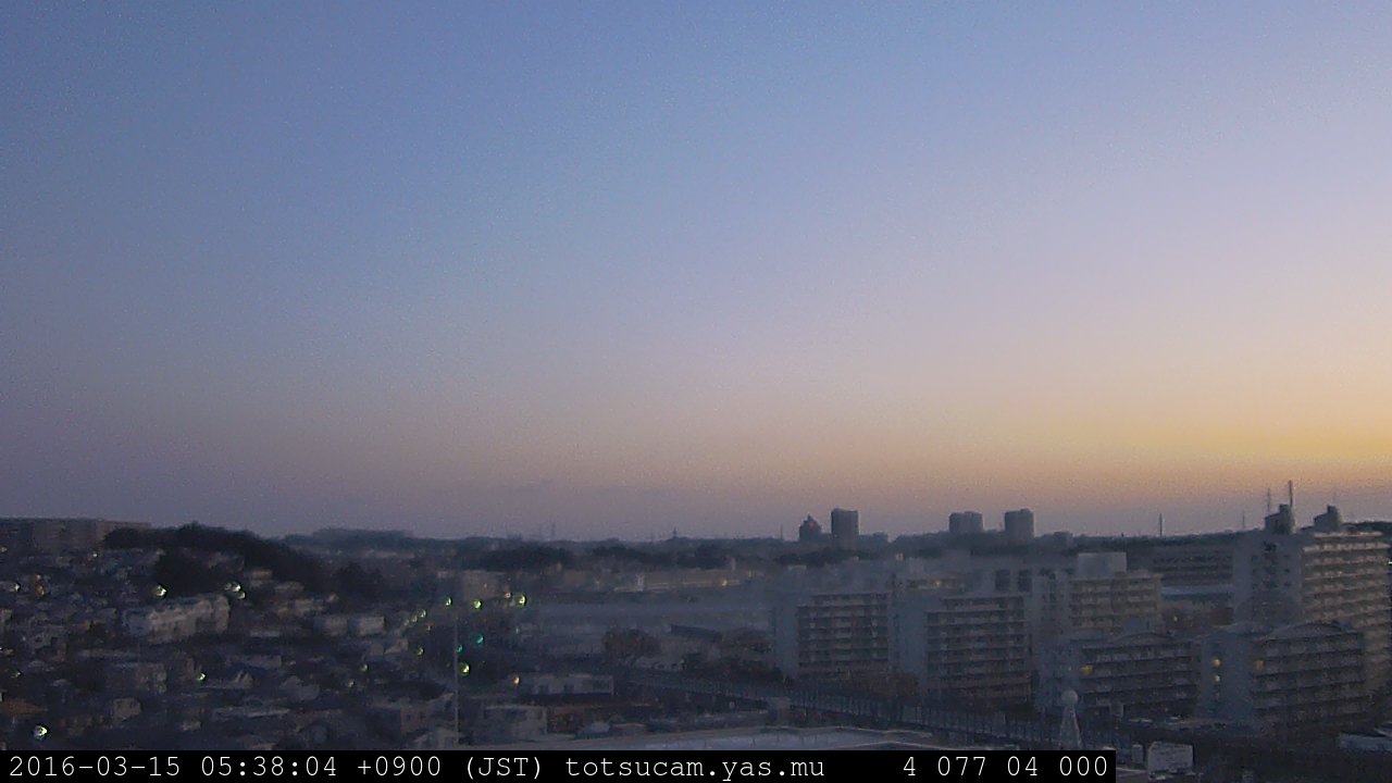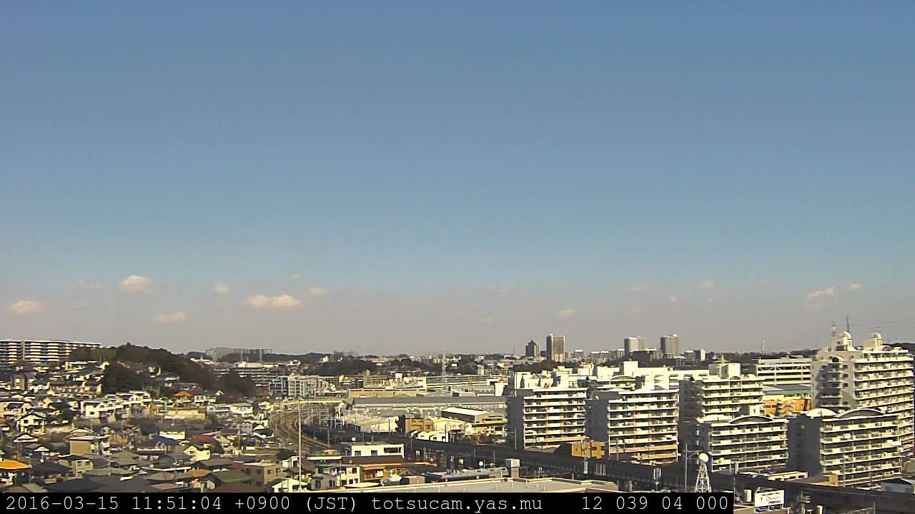 横浜市戸塚駅周辺から 東戸塚方面(北北東)を望む展望カメラの映像です。 左は現在の映像です。 下に並んでいるのは、 7日間に亘る日の出どき、昼間、夕暮れどきの写真(サムネイル)です。 それぞれ、日の出15分前、南中時、日没20分後の写真となっています。 各写真の下にはmpeg形式の動画へのリンクがあります。 それぞれ、日の出、南中、日没の前後1時間の画像です。 右欄にはその日24時間の動画へのリンクがあります。 この7日間以外は日付が一覧表示されています。 日付部分をクリックすると、 その日付から7日分が展開されて表示されます。