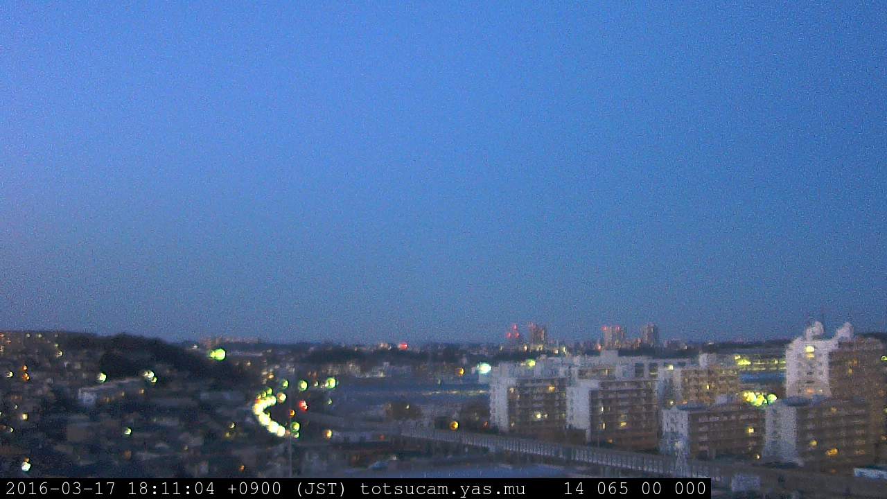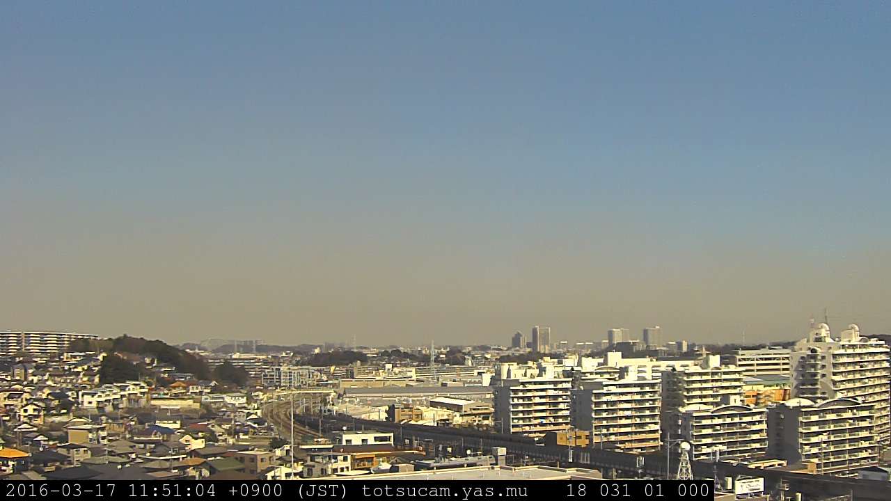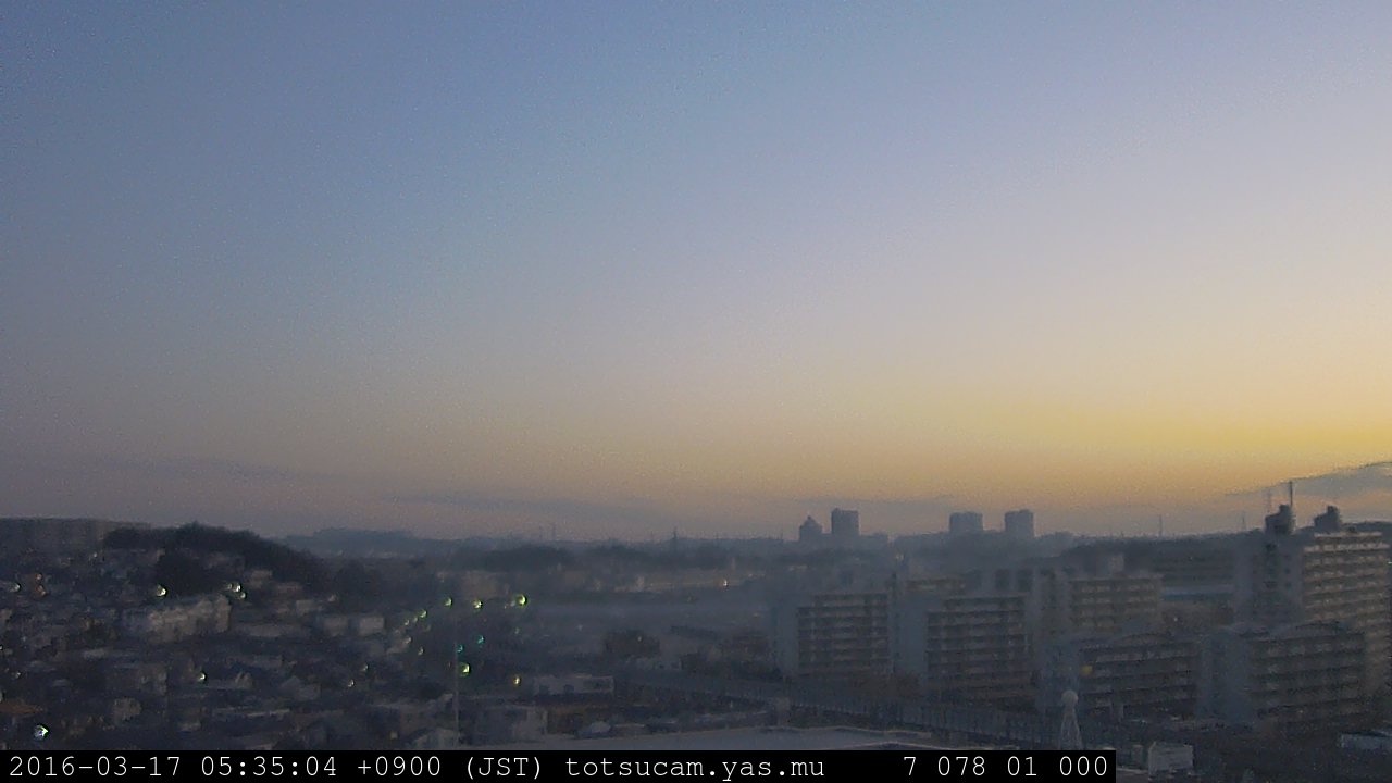 横浜市戸塚駅周辺から 東戸塚方面(北北東)を望む展望カメラの映像です。 左は現在の映像です。 下に並んでいるのは、 7日間に亘る日の出どき、昼間、夕暮れどきの写真(サムネイル)です。 それぞれ、日の出15分前、南中時、日没20分後の写真となっています。 各写真の下にはmpeg形式の動画へのリンクがあります。 それぞれ、日の出、南中、日没の前後1時間の画像です。 右欄にはその日24時間の動画へのリンクがあります。 この7日間以外は日付が一覧表示されています。 日付部分をクリックすると、 その日付から7日分が展開されて表示されます。
