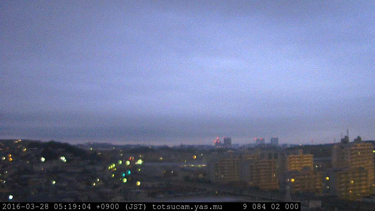 横浜市戸塚駅周辺から 東戸塚方面(北北東)を望む展望カメラの映像です。 左は現在の映像です。 下に並んでいるのは、 7日間に亘る日の出どき、昼間、夕暮れどきの写真(サムネイル)です。 それぞれ、日の出15分前、南中時、日没20分後の写真となっています。 各写真の下にはmpeg形式の動画へのリンクがあります。 それぞれ、日の出、南中、日没の前後1時間の画像です。 右欄にはその日24時間の動画へのリンクがあります。 この7日間以外は日付が一覧表示されています。 日付部分をクリックすると、 その日付から7日分が展開されて表示されます。