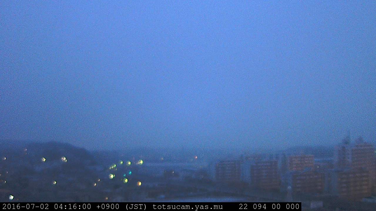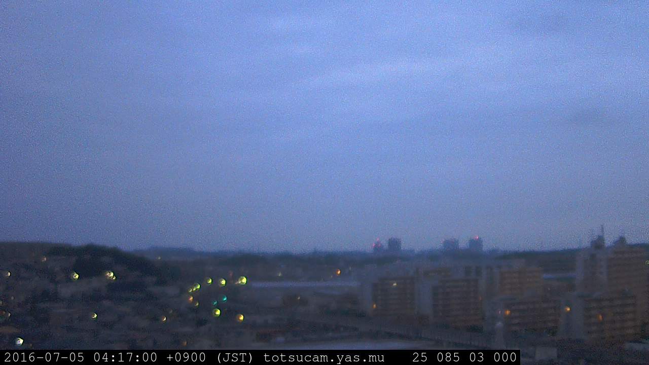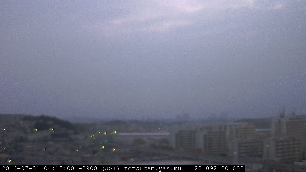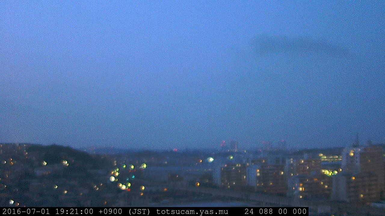 横浜市戸塚駅周辺から 東戸塚方面(北北東)を望む展望カメラの映像です。 左は現在の映像です。 下に並んでいるのは、 7日間に亘る日の出どき、昼間、夕暮れどきの写真(サムネイル)です。 それぞれ、日の出15分前、南中時、日没20分後の写真となっています。 各写真の下にはmpeg形式の動画へのリンクがあります。 それぞれ、日の出、南中、日没の前後1時間の画像です。 右欄にはその日24時間の動画へのリンクがあります。 この7日間以外は日付が一覧表示されています。 日付部分をクリックすると、 その日付から7日分が展開されて表示されます。