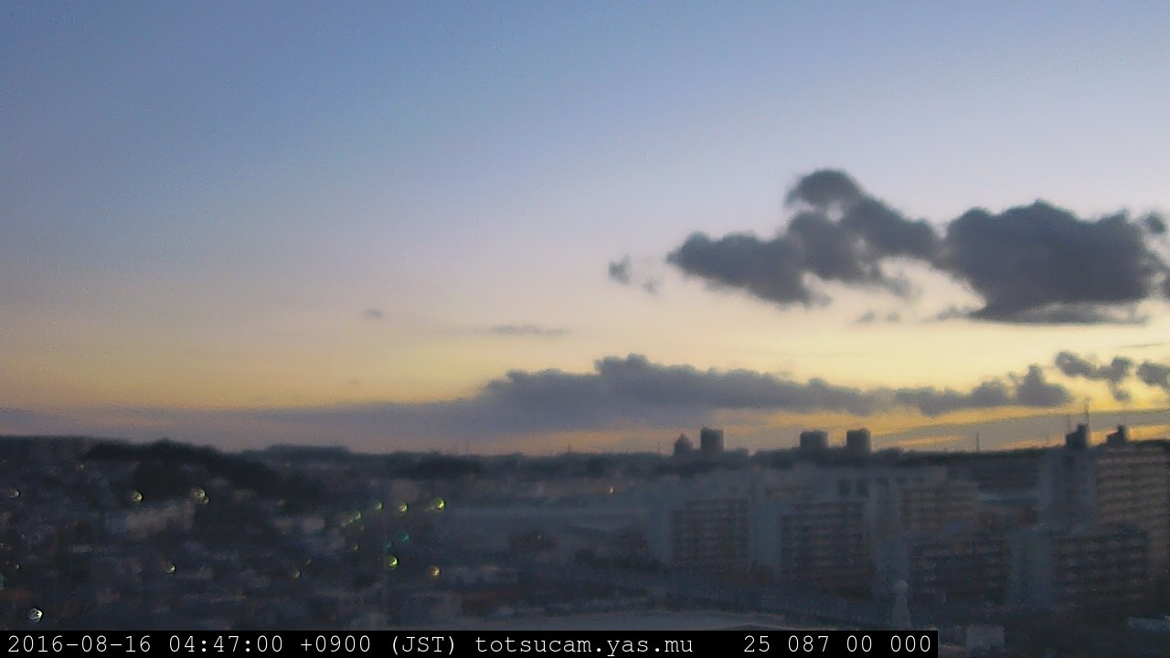 横浜市戸塚駅周辺から 東戸塚方面(北北東)を望む展望カメラの映像です。 左は現在の映像です。 下に並んでいるのは、 7日間に亘る日の出どき、昼間、夕暮れどきの写真(サムネイル)です。 それぞれ、日の出15分前、南中時、日没20分後の写真となっています。 各写真の下にはmpeg形式の動画へのリンクがあります。 それぞれ、日の出、南中、日没の前後1時間の画像です。 右欄にはその日24時間の動画へのリンクがあります。 この7日間以外は日付が一覧表示されています。 日付部分をクリックすると、 その日付から7日分が展開されて表示されます。