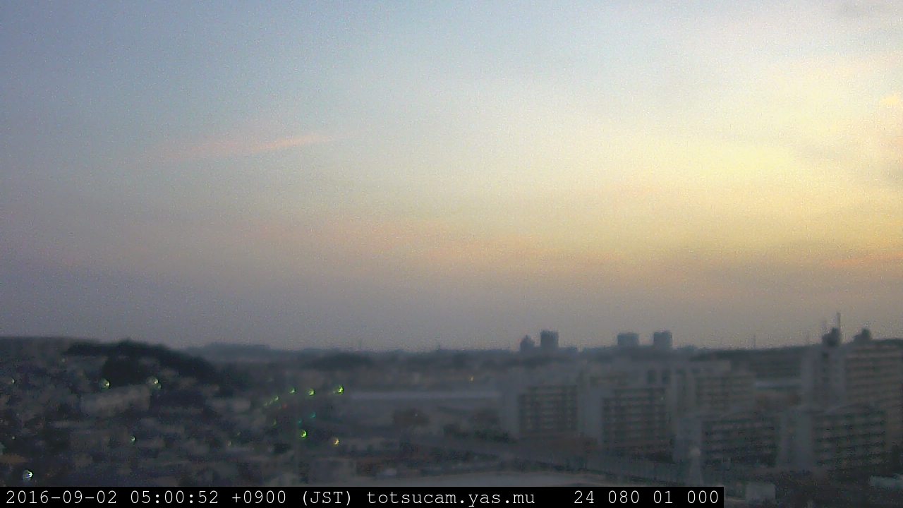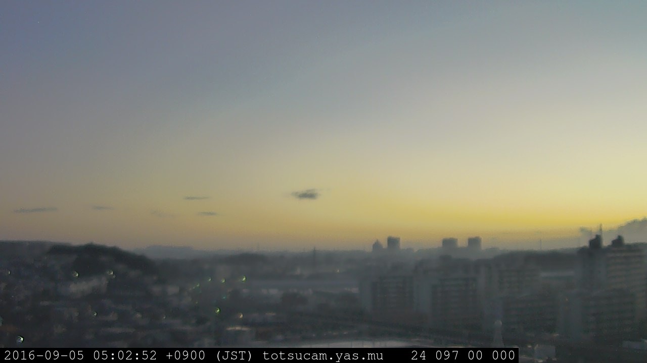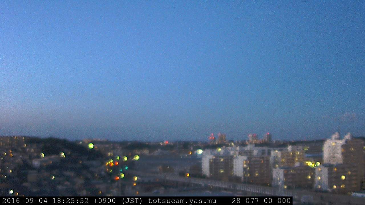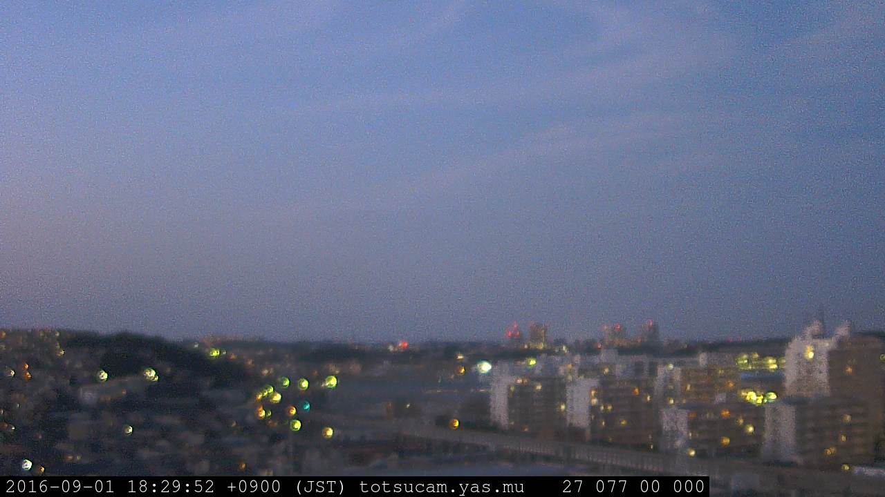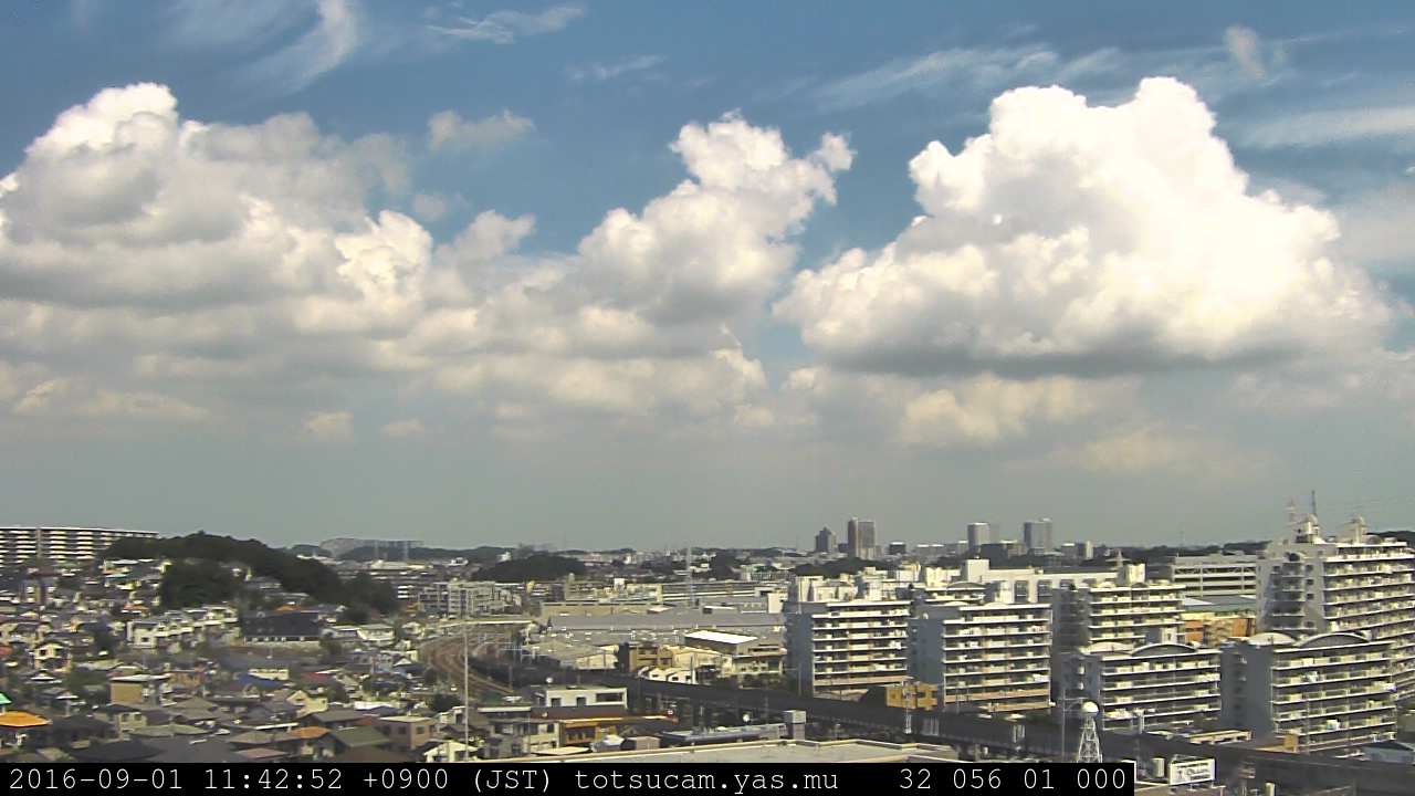 横浜市戸塚駅周辺から 東戸塚方面(北北東)を望む展望カメラの映像です。 左は現在の映像です。 下に並んでいるのは、 7日間に亘る日の出どき、昼間、夕暮れどきの写真(サムネイル)です。 それぞれ、日の出15分前、南中時、日没20分後の写真となっています。 各写真の下にはmpeg形式の動画へのリンクがあります。 それぞれ、日の出、南中、日没の前後1時間の画像です。 右欄にはその日24時間の動画へのリンクがあります。 この7日間以外は日付が一覧表示されています。 日付部分をクリックすると、 その日付から7日分が展開されて表示されます。