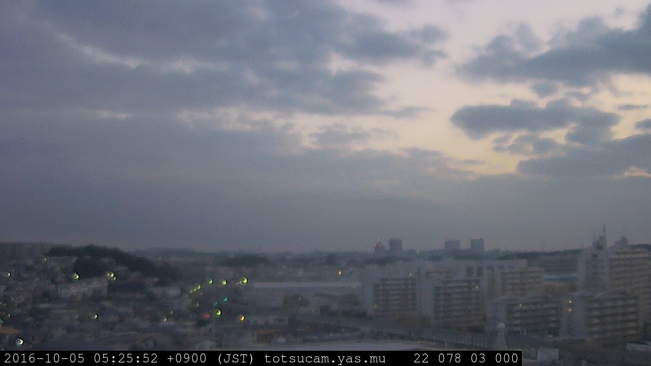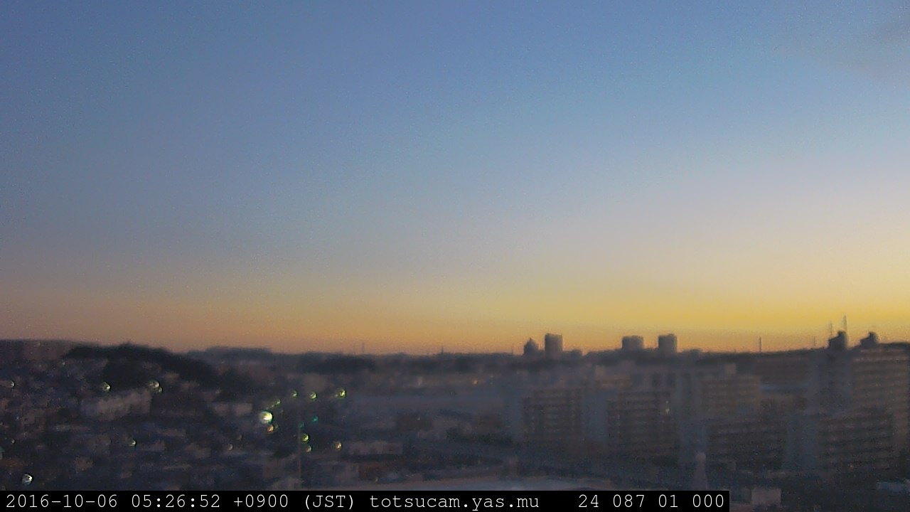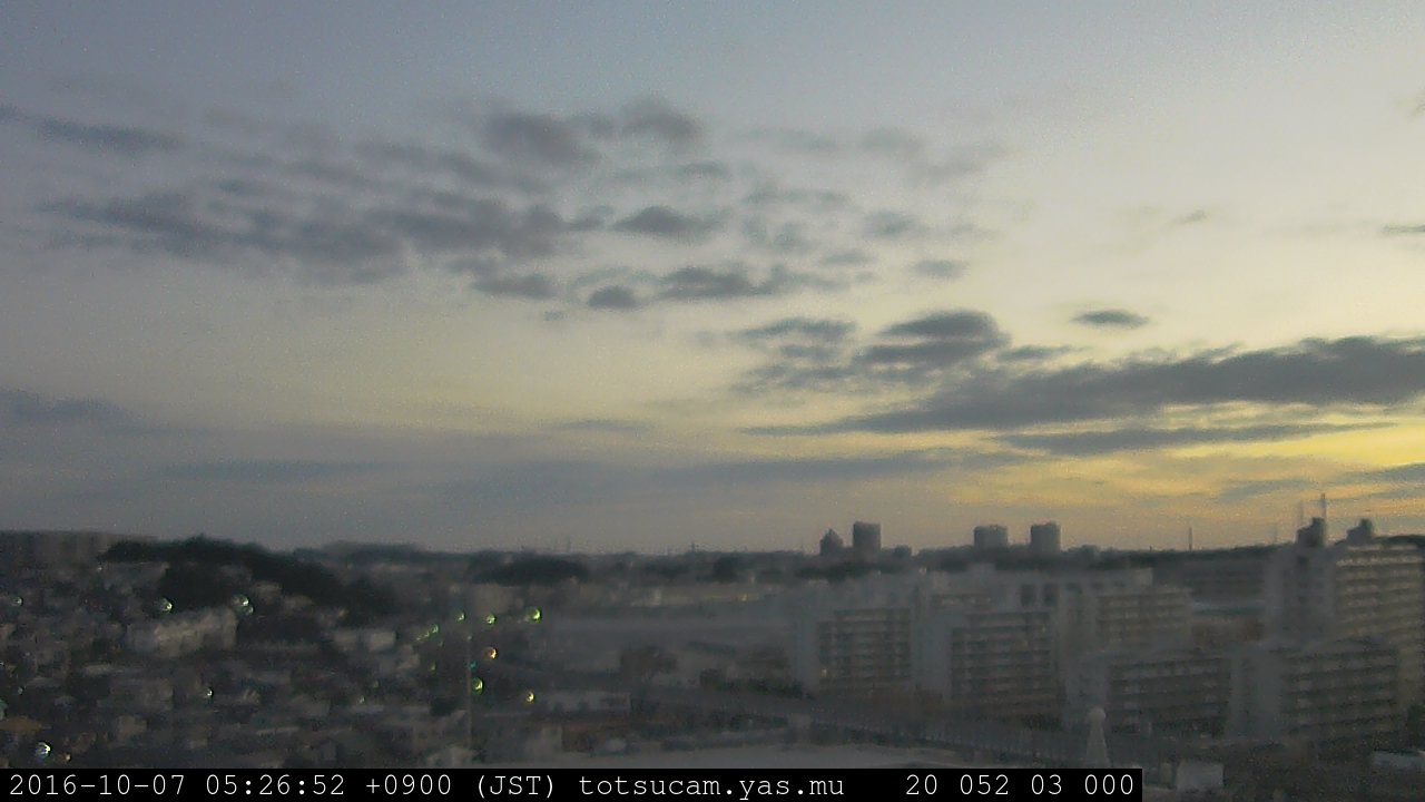 横浜市戸塚駅周辺から 東戸塚方面(北北東)を望む展望カメラの映像です。 左は現在の映像です。 下に並んでいるのは、 7日間に亘る日の出どき、昼間、夕暮れどきの写真(サムネイル)です。 それぞれ、日の出15分前、南中時、日没20分後の写真となっています。 各写真の下にはmpeg形式の動画へのリンクがあります。 それぞれ、日の出、南中、日没の前後1時間の画像です。 右欄にはその日24時間の動画へのリンクがあります。 この7日間以外は日付が一覧表示されています。 日付部分をクリックすると、 その日付から7日分が展開されて表示されます。
