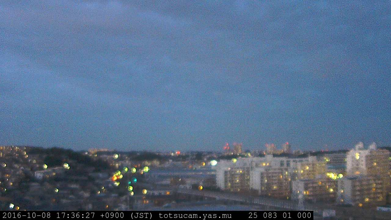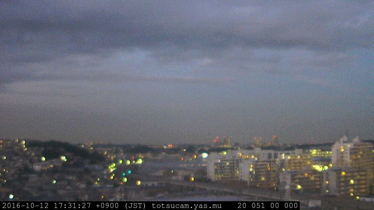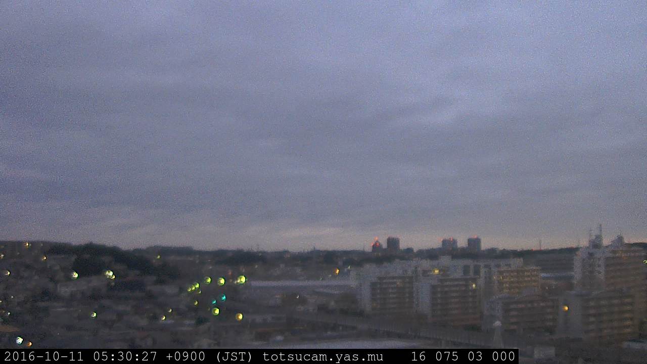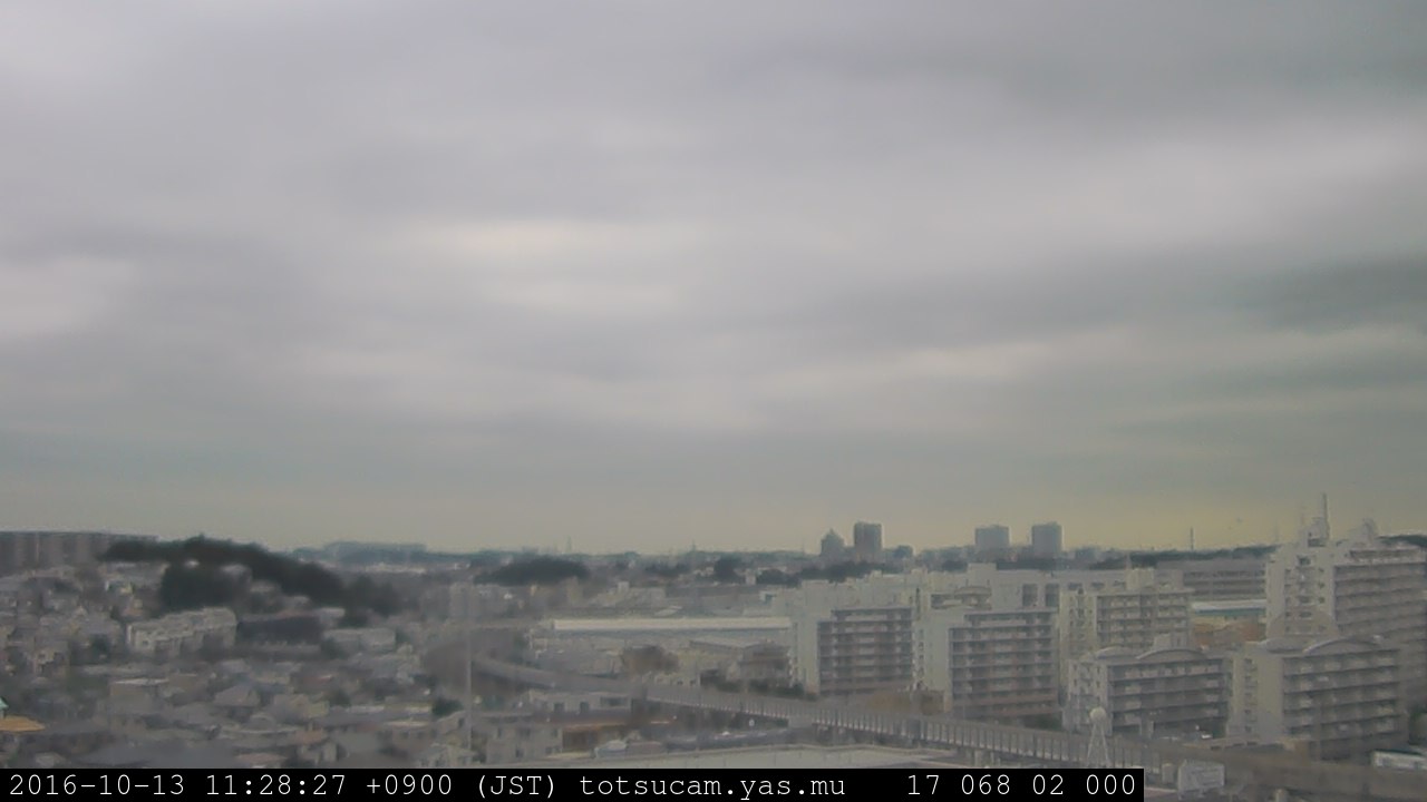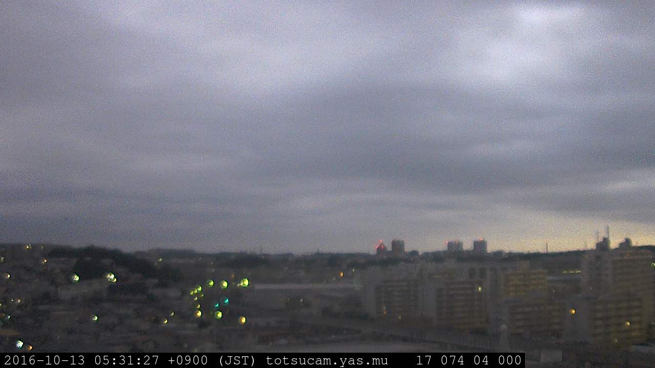 横浜市戸塚駅周辺から 東戸塚方面(北北東)を望む展望カメラの映像です。 左は現在の映像です。 下に並んでいるのは、 7日間に亘る日の出どき、昼間、夕暮れどきの写真(サムネイル)です。 それぞれ、日の出15分前、南中時、日没20分後の写真となっています。 各写真の下にはmpeg形式の動画へのリンクがあります。 それぞれ、日の出、南中、日没の前後1時間の画像です。 右欄にはその日24時間の動画へのリンクがあります。 この7日間以外は日付が一覧表示されています。 日付部分をクリックすると、 その日付から7日分が展開されて表示されます。