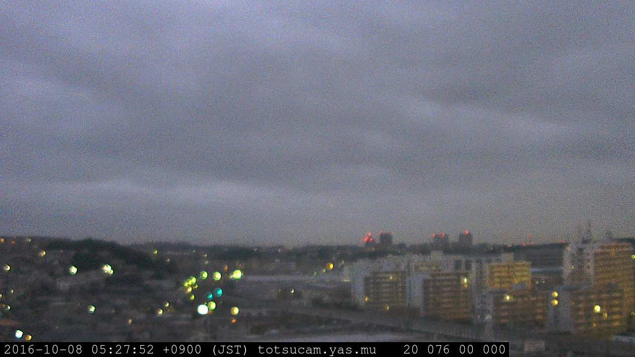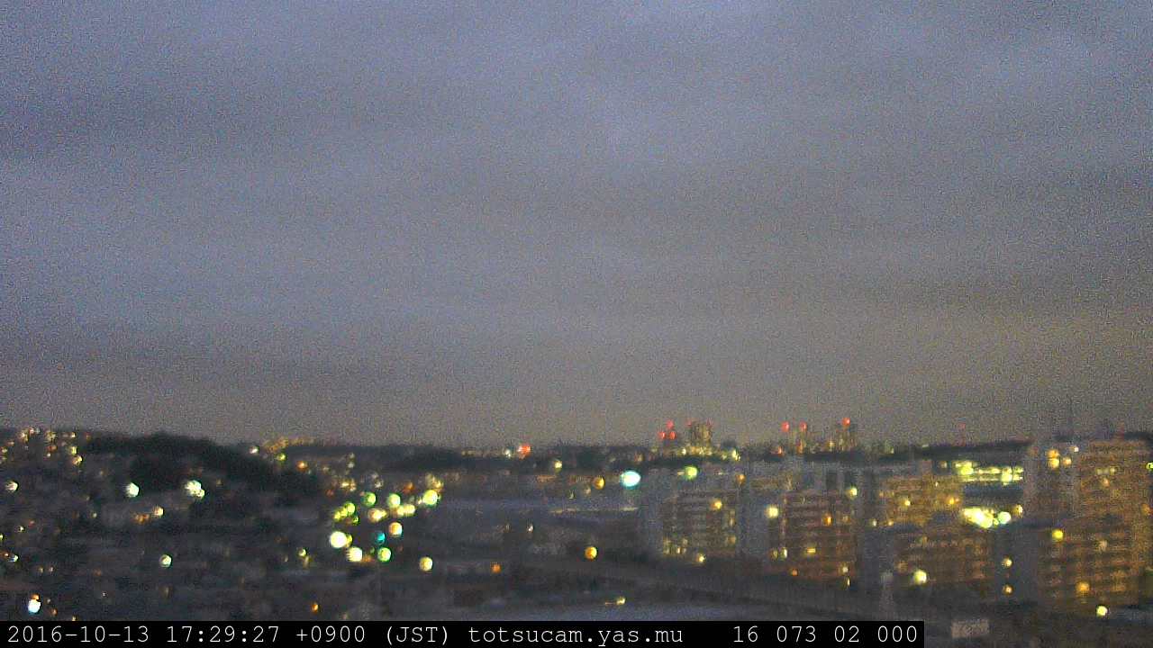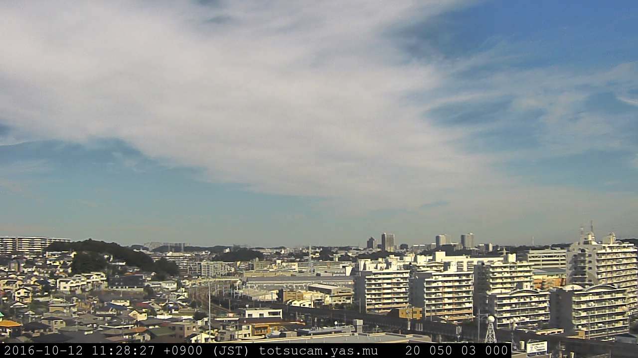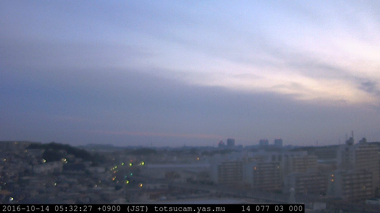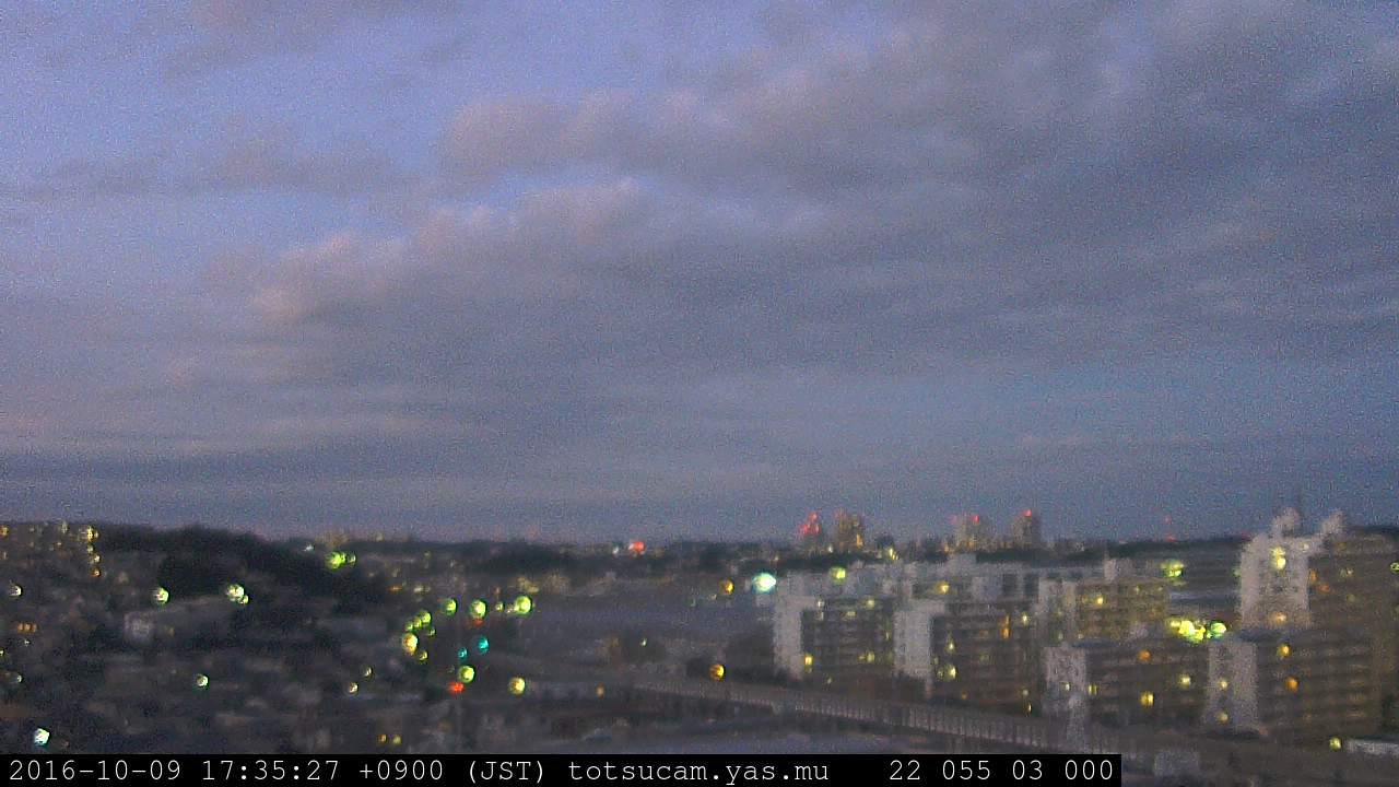 横浜市戸塚駅周辺から 東戸塚方面(北北東)を望む展望カメラの映像です。 左は現在の映像です。 下に並んでいるのは、 7日間に亘る日の出どき、昼間、夕暮れどきの写真(サムネイル)です。 それぞれ、日の出15分前、南中時、日没20分後の写真となっています。 各写真の下にはmpeg形式の動画へのリンクがあります。 それぞれ、日の出、南中、日没の前後1時間の画像です。 右欄にはその日24時間の動画へのリンクがあります。 この7日間以外は日付が一覧表示されています。 日付部分をクリックすると、 その日付から7日分が展開されて表示されます。
