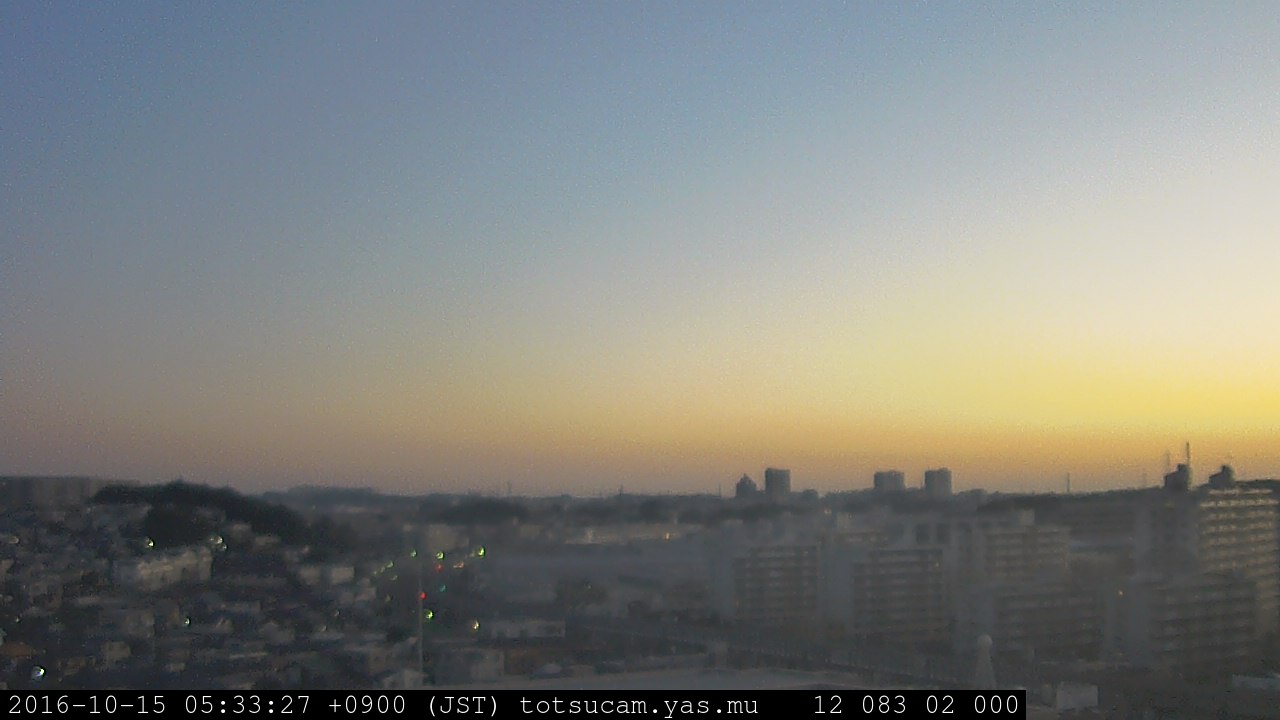 横浜市戸塚駅周辺から 東戸塚方面(北北東)を望む展望カメラの映像です。 左は現在の映像です。 下に並んでいるのは、 7日間に亘る日の出どき、昼間、夕暮れどきの写真(サムネイル)です。 それぞれ、日の出15分前、南中時、日没20分後の写真となっています。 各写真の下にはmpeg形式の動画へのリンクがあります。 それぞれ、日の出、南中、日没の前後1時間の画像です。 右欄にはその日24時間の動画へのリンクがあります。 この7日間以外は日付が一覧表示されています。 日付部分をクリックすると、 その日付から7日分が展開されて表示されます。