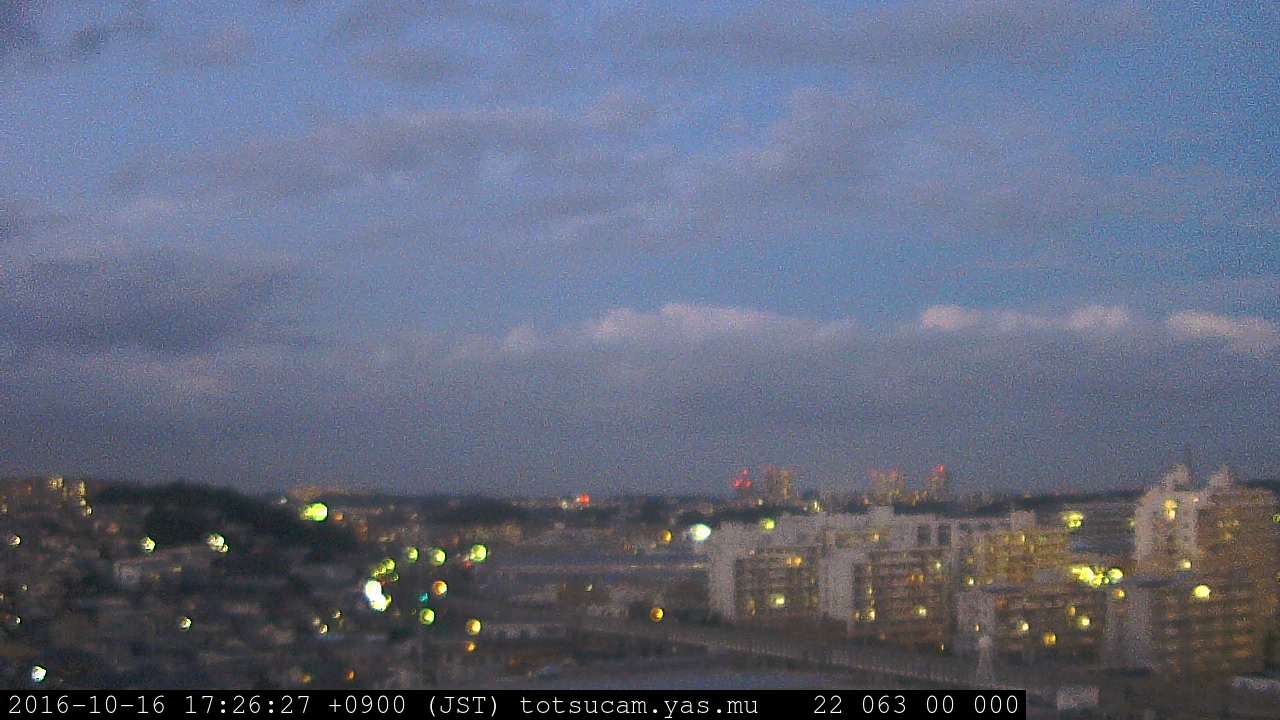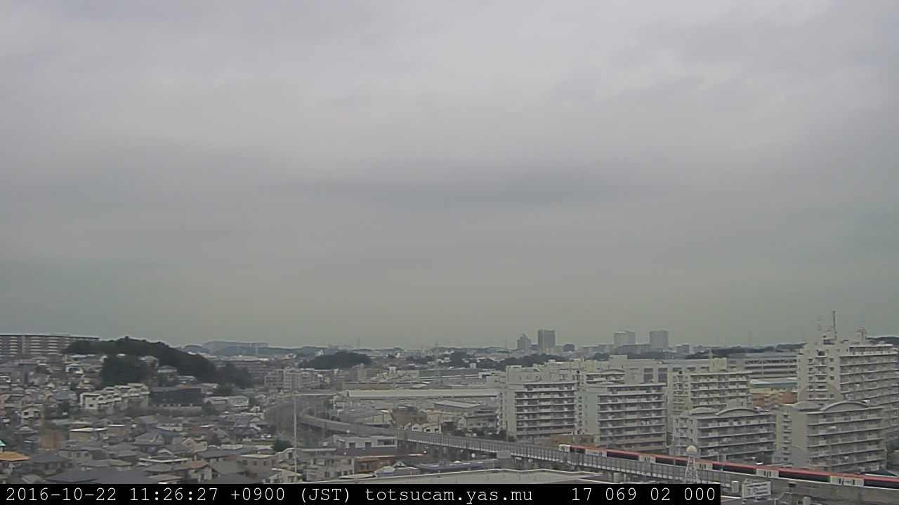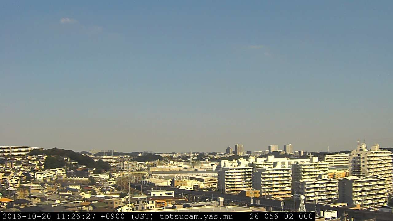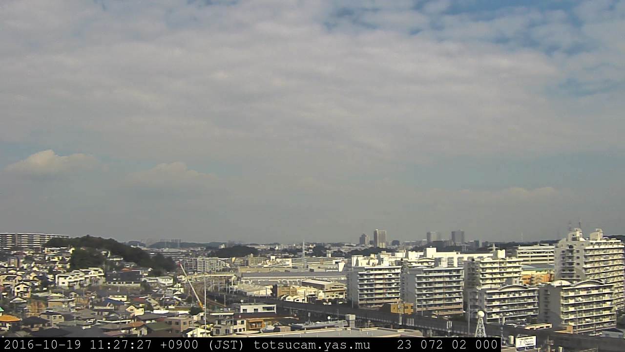 適度に曇った日の雲の動き (例: 2005-10-24) がとても楽しめます。 正面を横切っている高架は横須賀線下りです。 その下に横須賀線上り、東海道線、同貨物線が走っていますが、 高架に隠れていてよく見えません。 夜間は特に中央左寄りの車の動きがよく見えます。