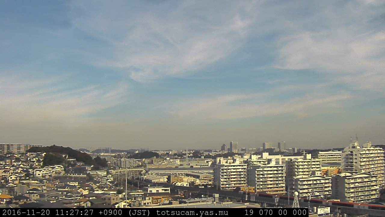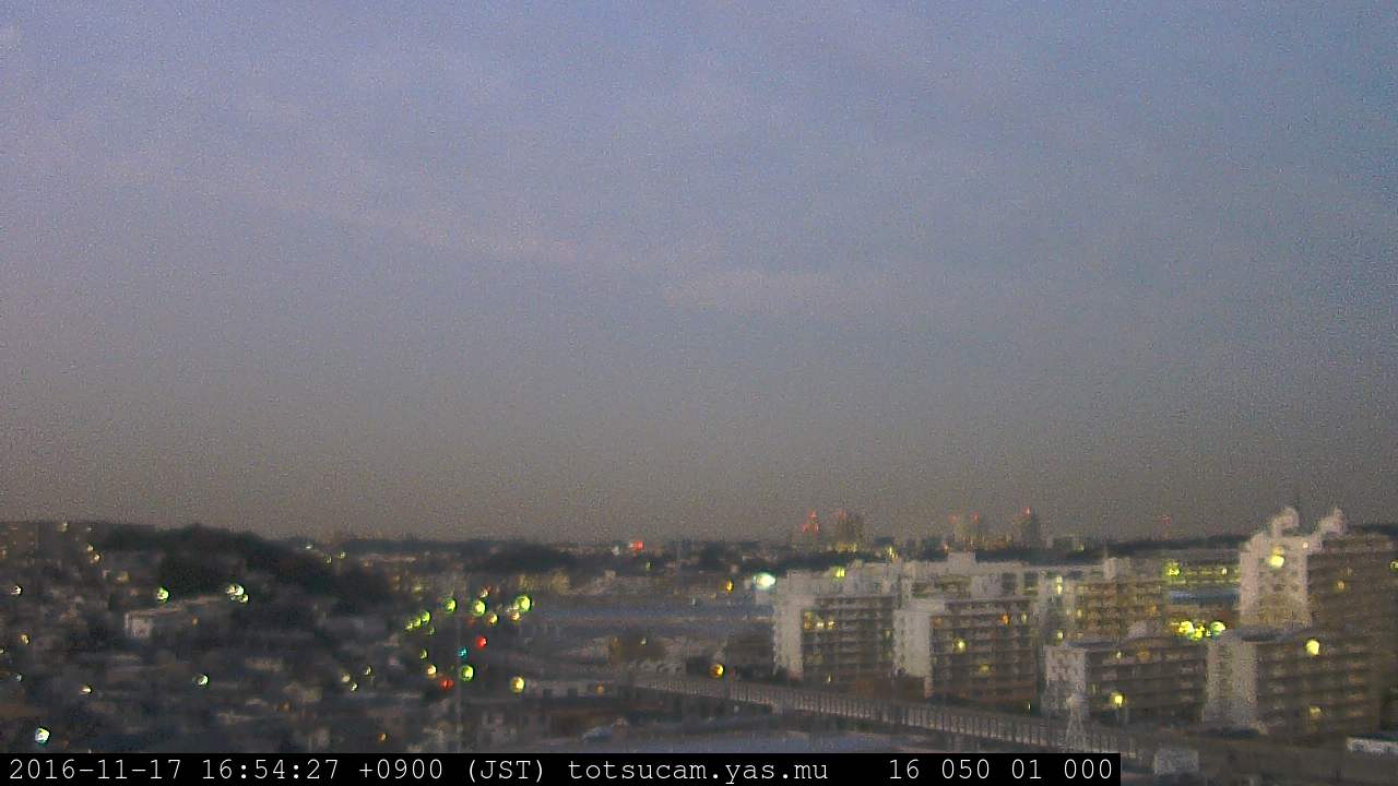 適度に曇った日の雲の動き (例: 2005-10-24) がとても楽しめます。 正面を横切っている高架は横須賀線下りです。 その下に横須賀線上り、東海道線、同貨物線が走っていますが、 高架に隠れていてよく見えません。 夜間は特に中央左寄りの車の動きがよく見えます。