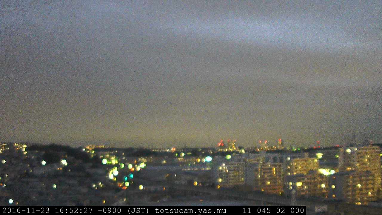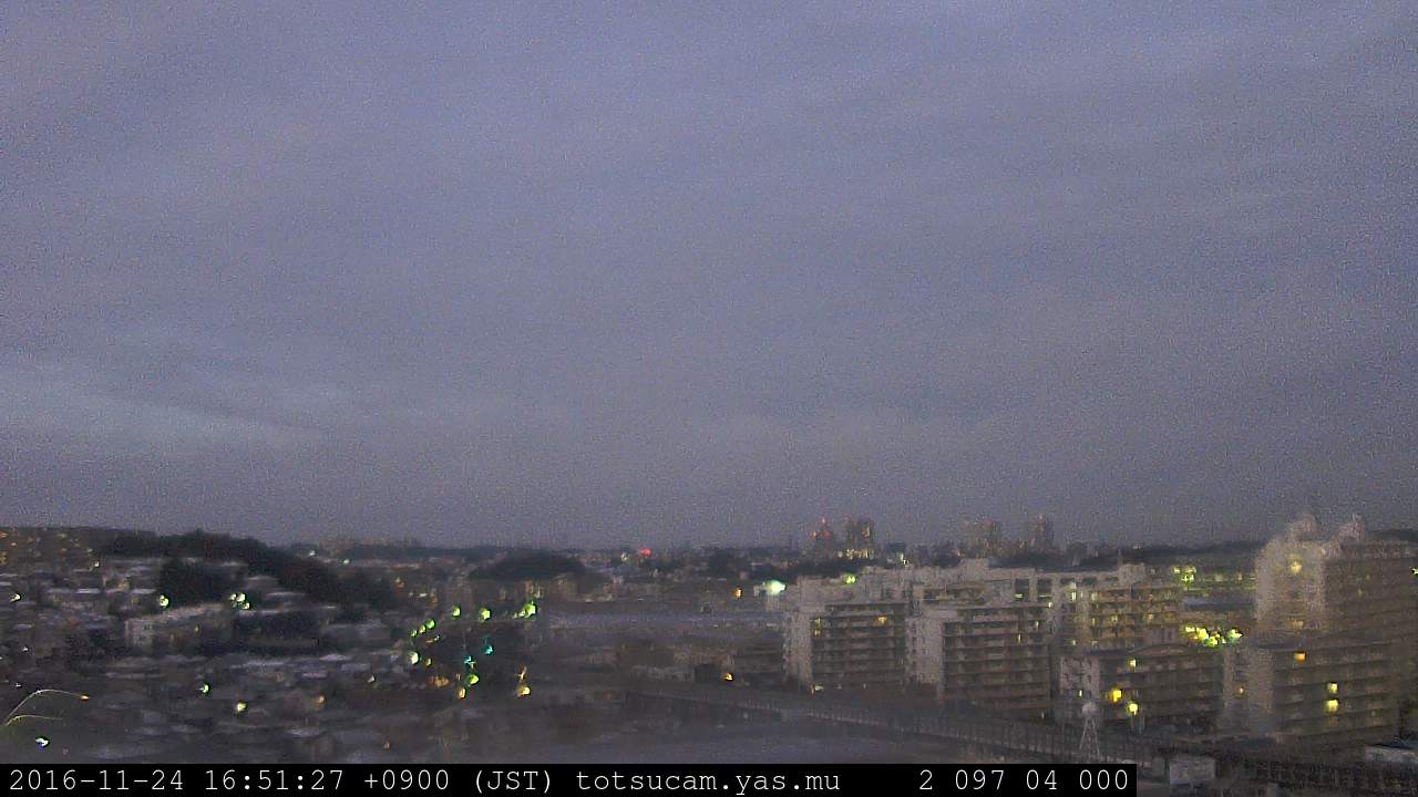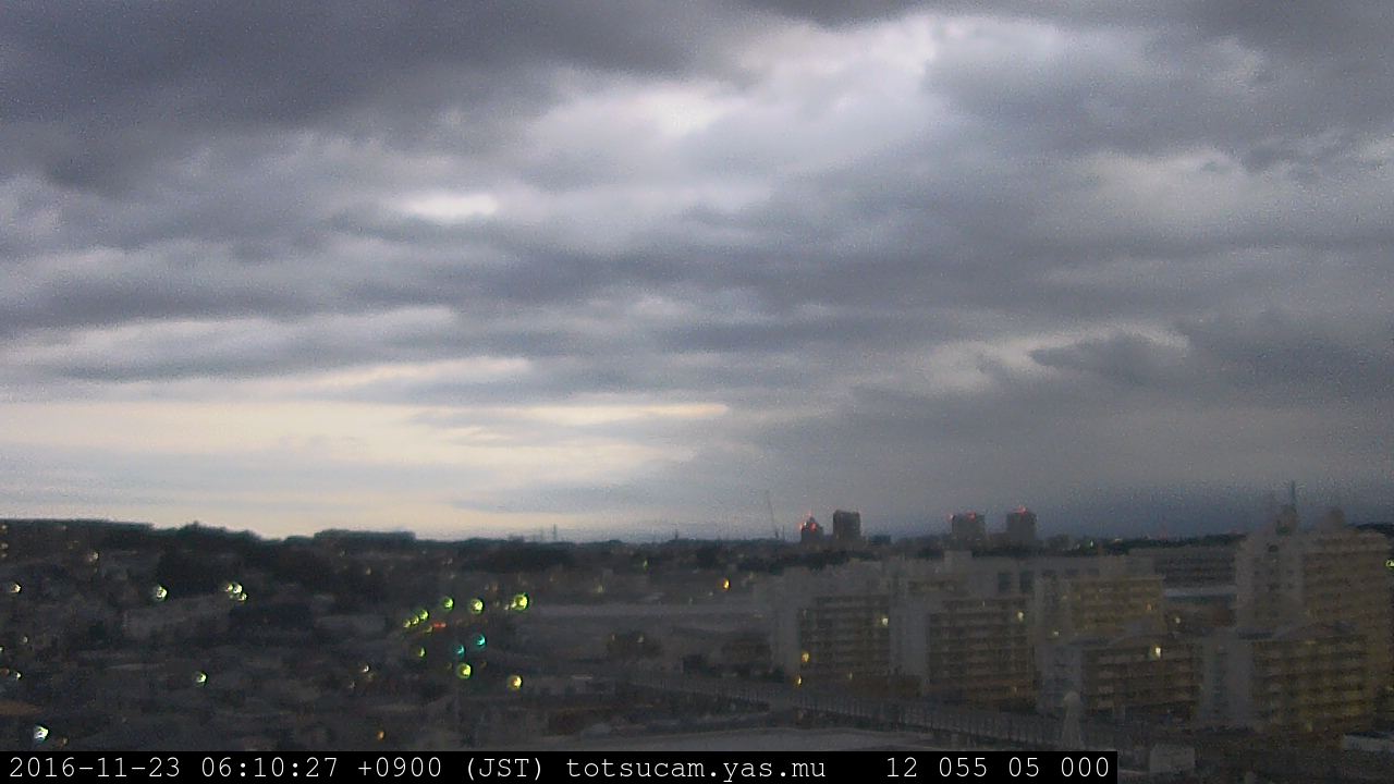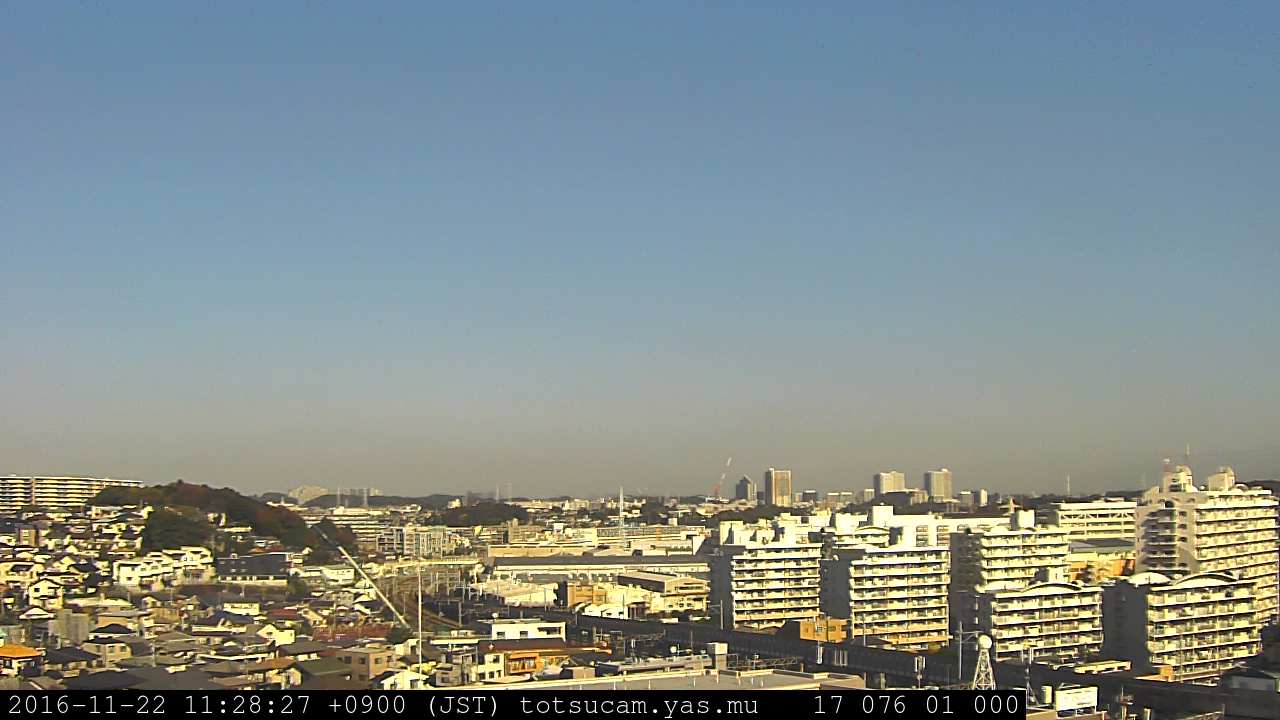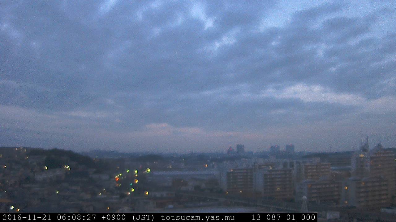 横浜市戸塚駅周辺から 東戸塚方面(北北東)を望む展望カメラの映像です。 左は現在の映像です。 下に並んでいるのは、 7日間に亘る日の出どき、昼間、夕暮れどきの写真(サムネイル)です。 それぞれ、日の出15分前、南中時、日没20分後の写真となっています。 各写真の下にはmpeg形式の動画へのリンクがあります。 それぞれ、日の出、南中、日没の前後1時間の画像です。 右欄にはその日24時間の動画へのリンクがあります。 この7日間以外は日付が一覧表示されています。 日付部分をクリックすると、 その日付から7日分が展開されて表示されます。