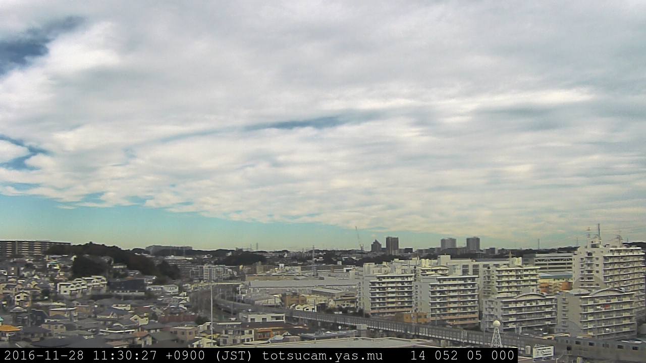 適度に曇った日の雲の動き (例: 2005-10-24) がとても楽しめます。 正面を横切っている高架は横須賀線下りです。 その下に横須賀線上り、東海道線、同貨物線が走っていますが、 高架に隠れていてよく見えません。 夜間は特に中央左寄りの車の動きがよく見えます。