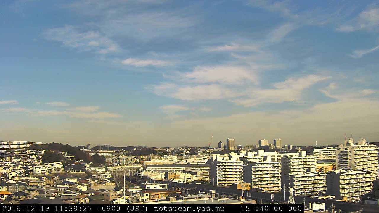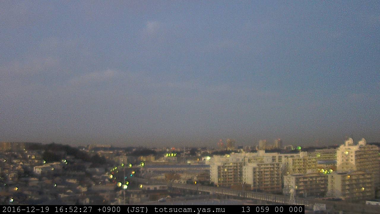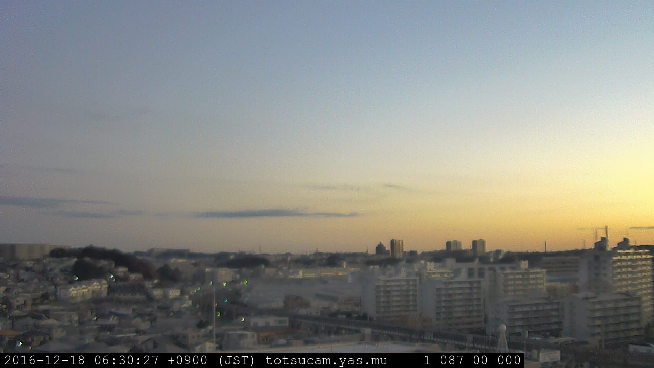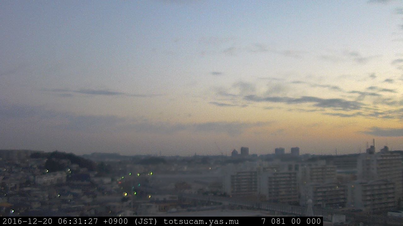 横浜市戸塚駅周辺から 東戸塚方面(北北東)を望む展望カメラの映像です。 左は現在の映像です。 下に並んでいるのは、 7日間に亘る日の出どき、昼間、夕暮れどきの写真(サムネイル)です。 それぞれ、日の出15分前、南中時、日没20分後の写真となっています。 各写真の下にはmpeg形式の動画へのリンクがあります。 それぞれ、日の出、南中、日没の前後1時間の画像です。 右欄にはその日24時間の動画へのリンクがあります。 この7日間以外は日付が一覧表示されています。 日付部分をクリックすると、 その日付から7日分が展開されて表示されます。