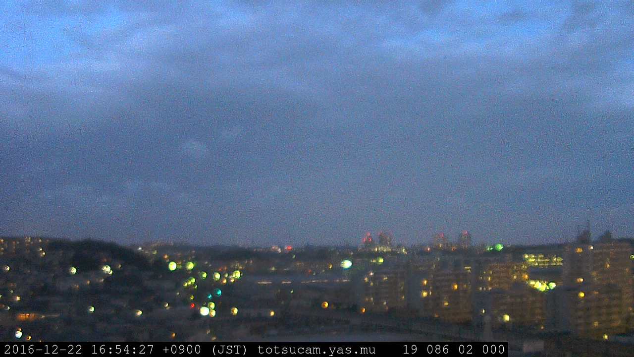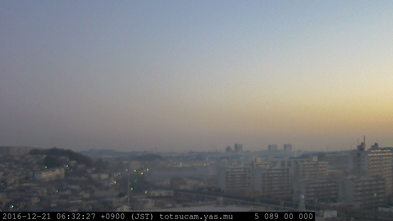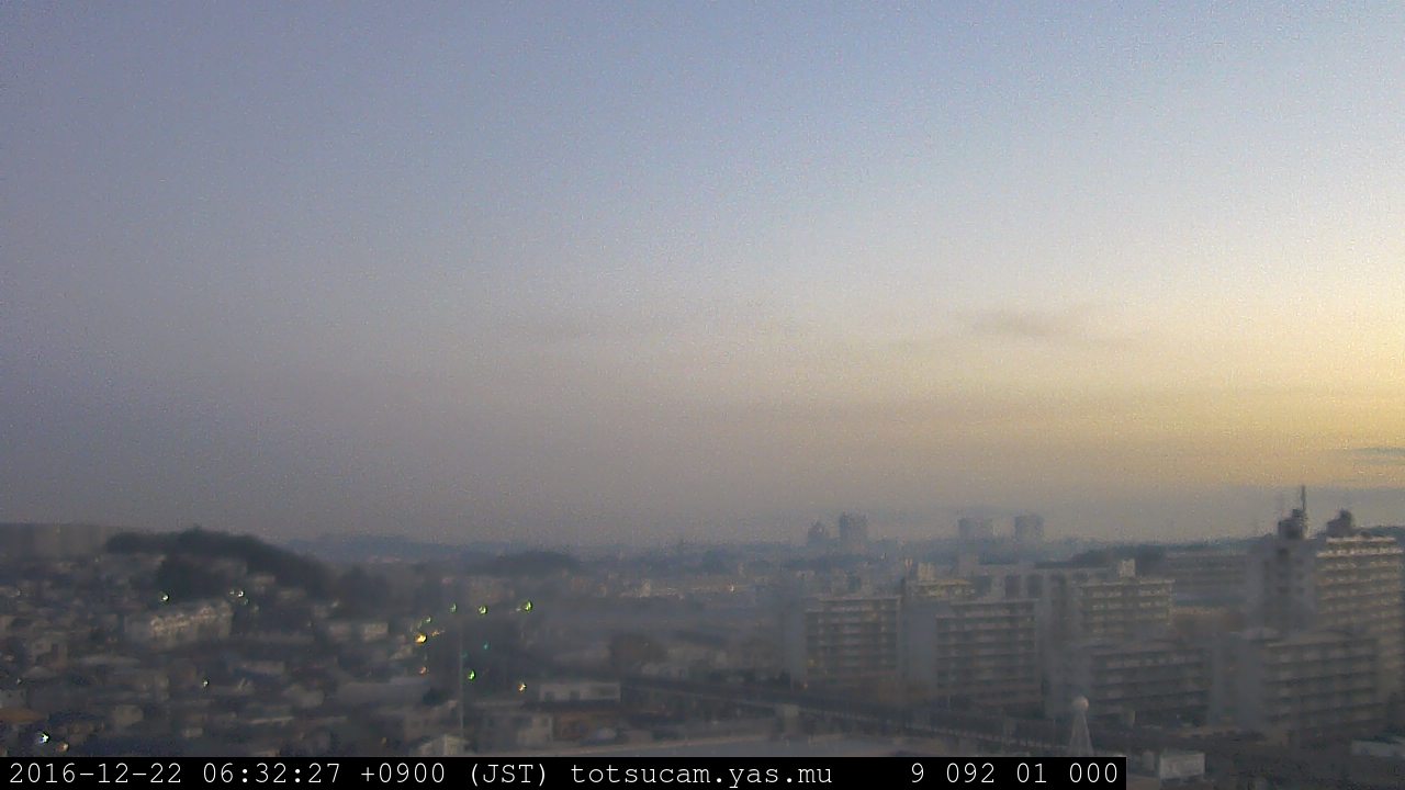 横浜市戸塚駅周辺から 東戸塚方面(北北東)を望む展望カメラの映像です。 左は現在の映像です。 下に並んでいるのは、 7日間に亘る日の出どき、昼間、夕暮れどきの写真(サムネイル)です。 それぞれ、日の出15分前、南中時、日没20分後の写真となっています。 各写真の下にはmpeg形式の動画へのリンクがあります。 それぞれ、日の出、南中、日没の前後1時間の画像です。 右欄にはその日24時間の動画へのリンクがあります。 この7日間以外は日付が一覧表示されています。 日付部分をクリックすると、 その日付から7日分が展開されて表示されます。