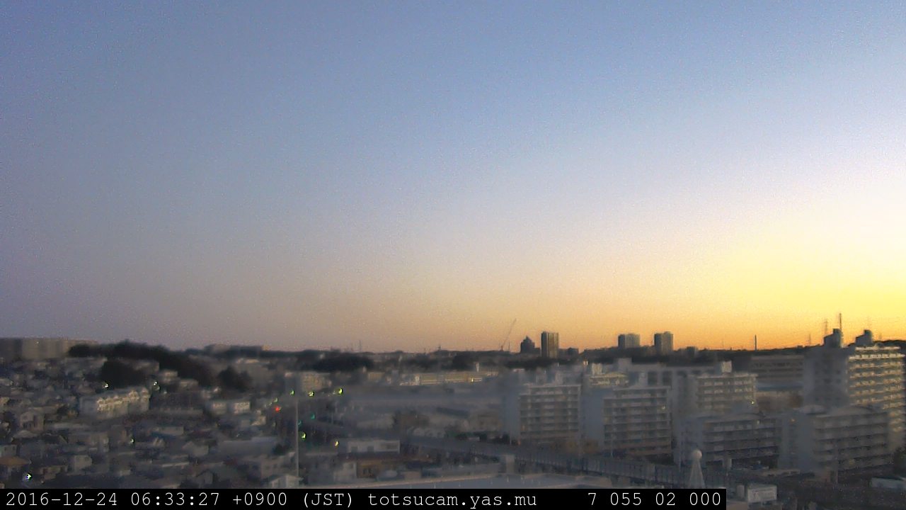 横浜市戸塚駅周辺から 東戸塚方面(北北東)を望む展望カメラの映像です。 左は現在の映像です。 下に並んでいるのは、 7日間に亘る日の出どき、昼間、夕暮れどきの写真(サムネイル)です。 それぞれ、日の出15分前、南中時、日没20分後の写真となっています。 各写真の下にはmpeg形式の動画へのリンクがあります。 それぞれ、日の出、南中、日没の前後1時間の画像です。 右欄にはその日24時間の動画へのリンクがあります。 この7日間以外は日付が一覧表示されています。 日付部分をクリックすると、 その日付から7日分が展開されて表示されます。