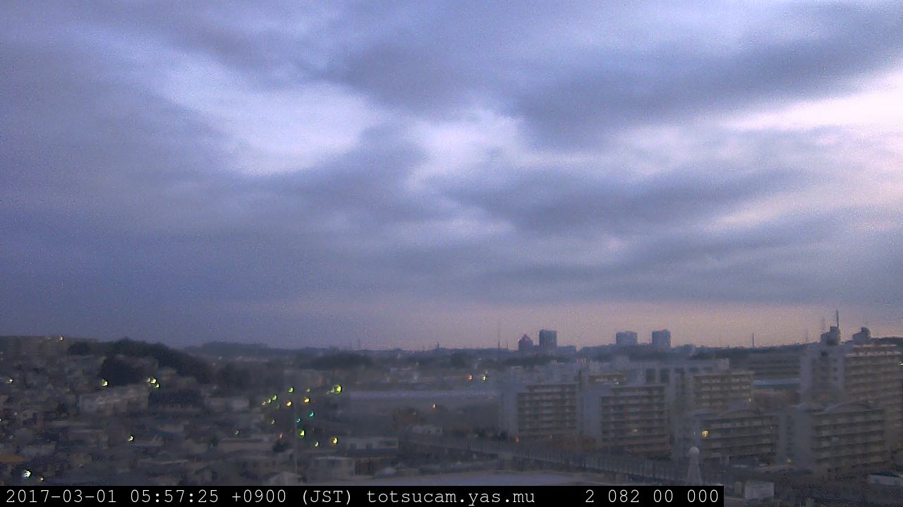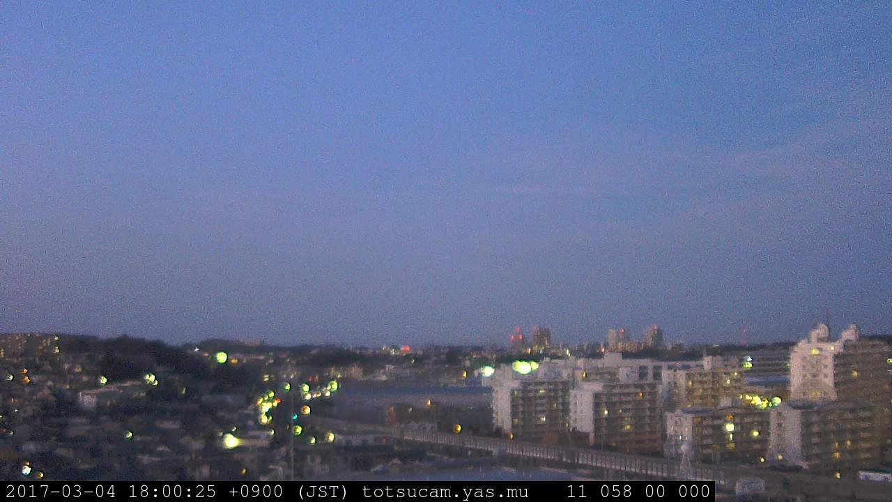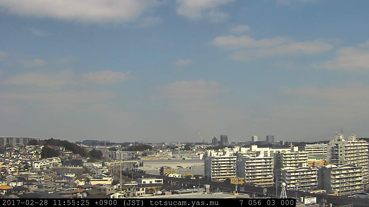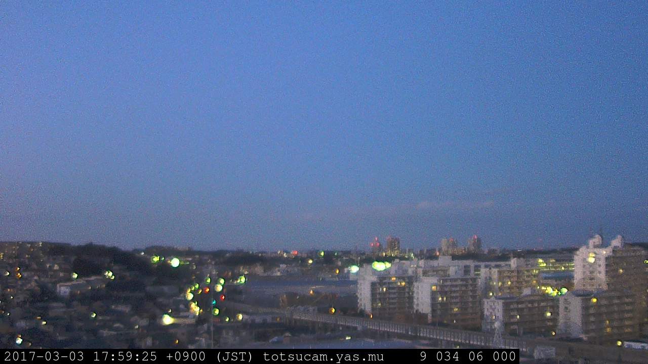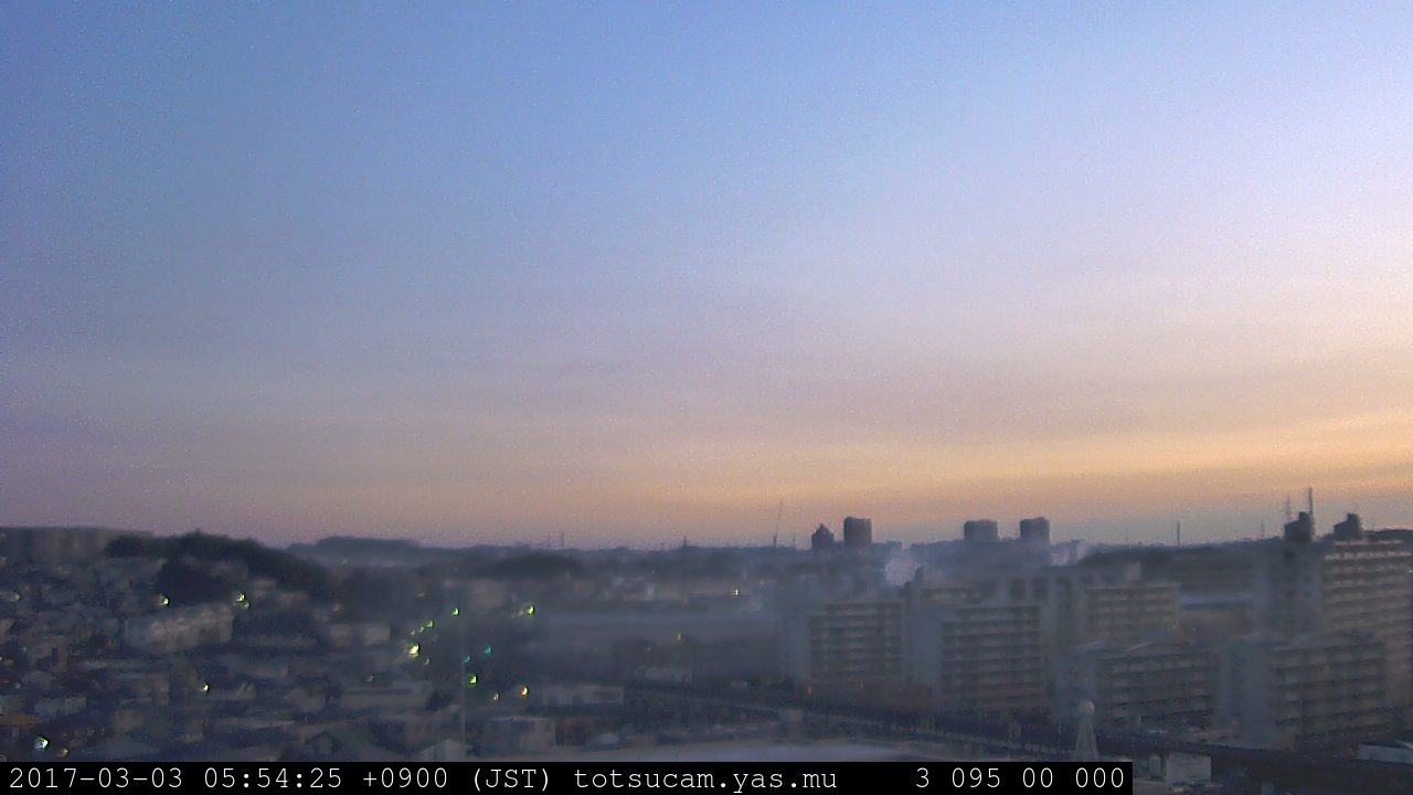 横浜市戸塚駅周辺から 東戸塚方面(北北東)を望む展望カメラの映像です。 左は現在の映像です。 下に並んでいるのは、 7日間に亘る日の出どき、昼間、夕暮れどきの写真(サムネイル)です。 それぞれ、日の出15分前、南中時、日没20分後の写真となっています。 各写真の下にはmpeg形式の動画へのリンクがあります。 それぞれ、日の出、南中、日没の前後1時間の画像です。 右欄にはその日24時間の動画へのリンクがあります。 この7日間以外は日付が一覧表示されています。 日付部分をクリックすると、 その日付から7日分が展開されて表示されます。