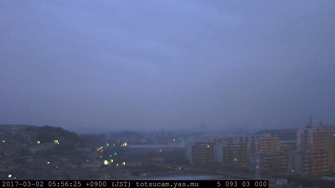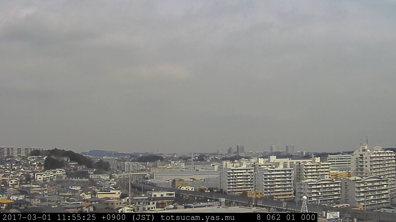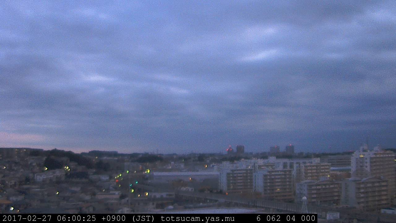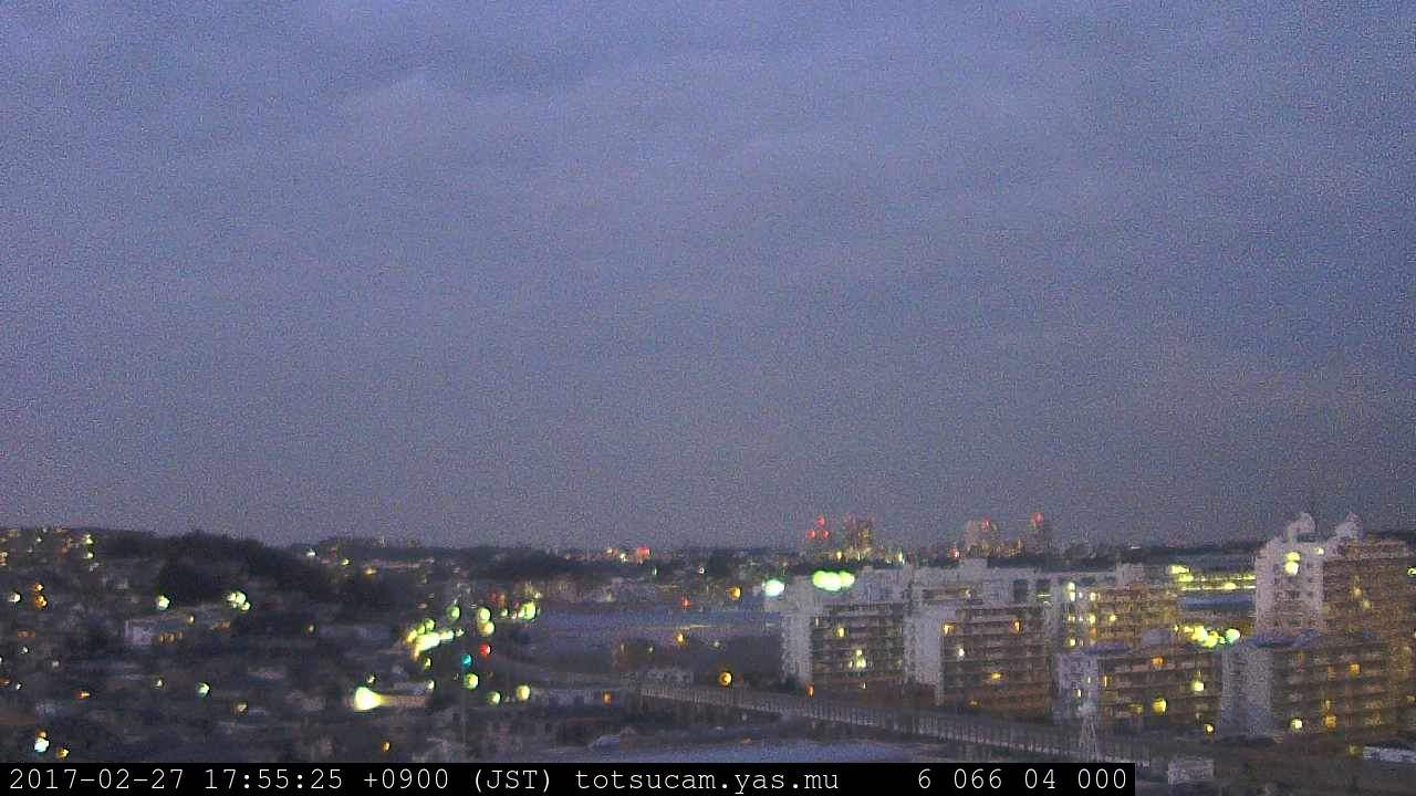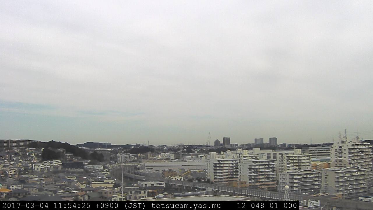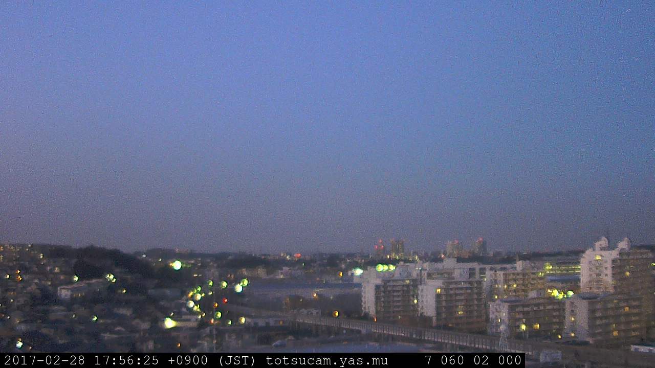 横浜市戸塚駅周辺から 東戸塚方面(北北東)を望む展望カメラの映像です。 左は現在の映像です。 下に並んでいるのは、 7日間に亘る日の出どき、昼間、夕暮れどきの写真(サムネイル)です。 それぞれ、日の出15分前、南中時、日没20分後の写真となっています。 各写真の下にはmpeg形式の動画へのリンクがあります。 それぞれ、日の出、南中、日没の前後1時間の画像です。 右欄にはその日24時間の動画へのリンクがあります。 この7日間以外は日付が一覧表示されています。 日付部分をクリックすると、 その日付から7日分が展開されて表示されます。