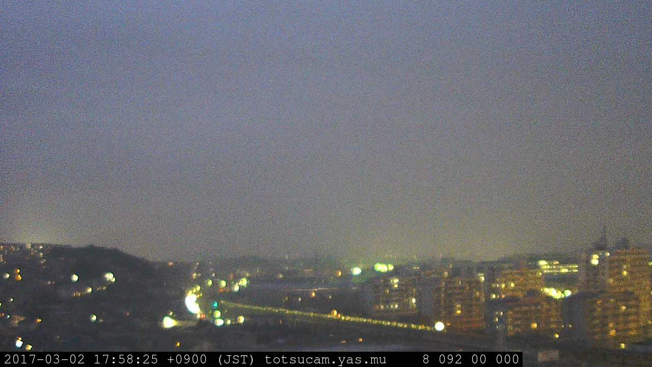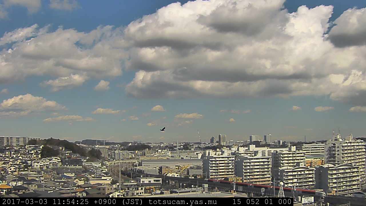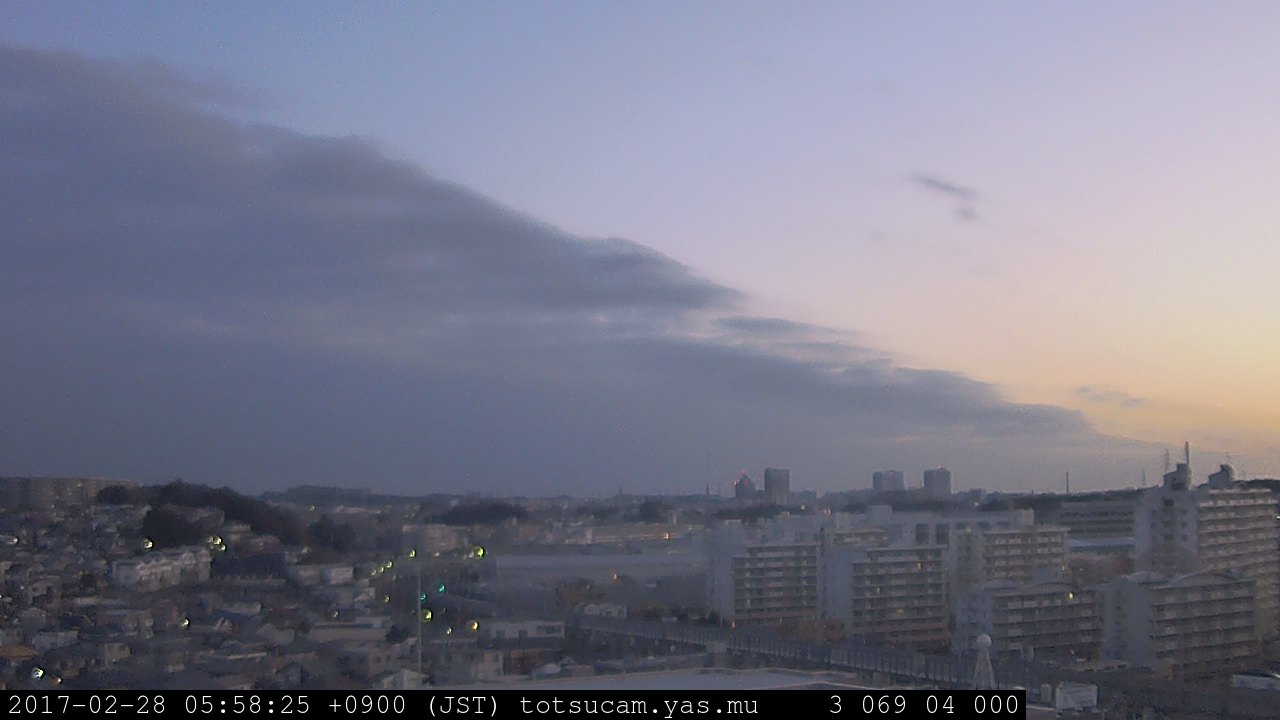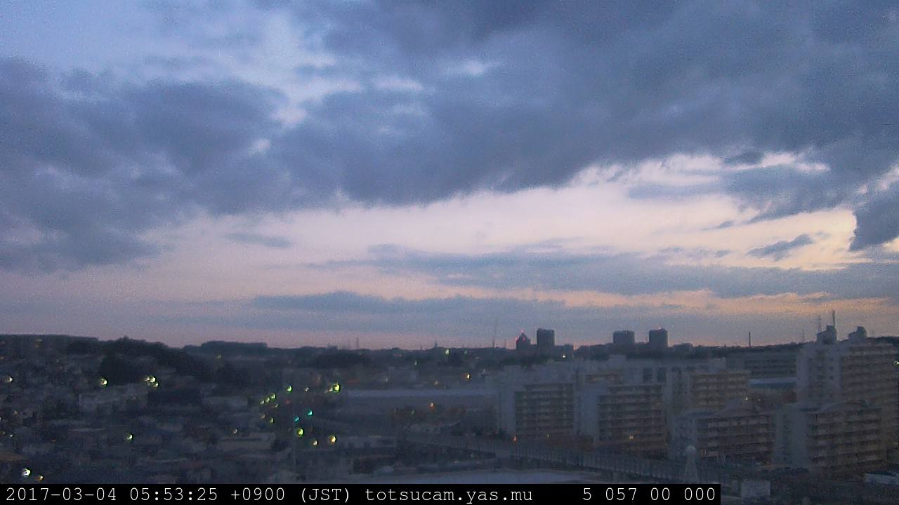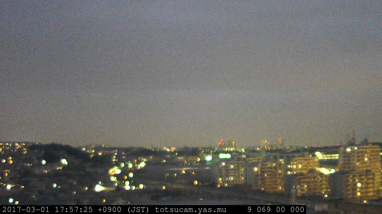 横浜市戸塚駅周辺から 東戸塚方面(北北東)を望む展望カメラの映像です。 左は現在の映像です。 下に並んでいるのは、 7日間に亘る日の出どき、昼間、夕暮れどきの写真(サムネイル)です。 それぞれ、日の出15分前、南中時、日没20分後の写真となっています。 各写真の下にはmpeg形式の動画へのリンクがあります。 それぞれ、日の出、南中、日没の前後1時間の画像です。 右欄にはその日24時間の動画へのリンクがあります。 この7日間以外は日付が一覧表示されています。 日付部分をクリックすると、 その日付から7日分が展開されて表示されます。