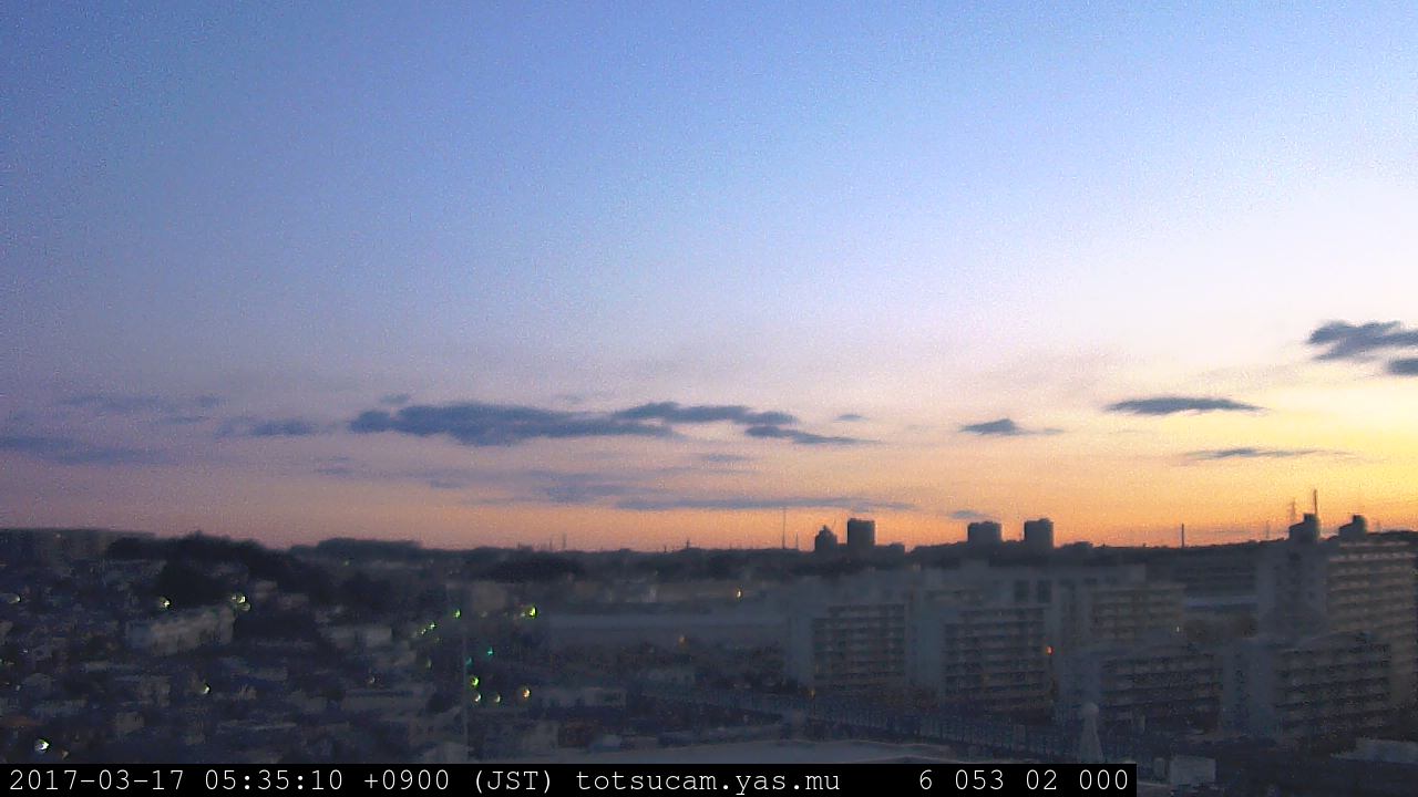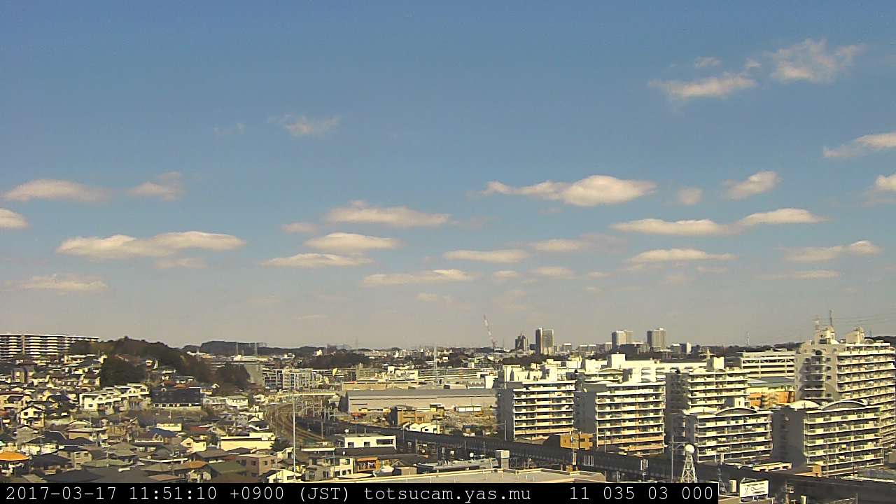 横浜市戸塚駅周辺から 東戸塚方面(北北東)を望む展望カメラの映像です。 左は現在の映像です。 下に並んでいるのは、 7日間に亘る日の出どき、昼間、夕暮れどきの写真(サムネイル)です。 それぞれ、日の出15分前、南中時、日没20分後の写真となっています。 各写真の下にはmpeg形式の動画へのリンクがあります。 それぞれ、日の出、南中、日没の前後1時間の画像です。 右欄にはその日24時間の動画へのリンクがあります。 この7日間以外は日付が一覧表示されています。 日付部分をクリックすると、 その日付から7日分が展開されて表示されます。
