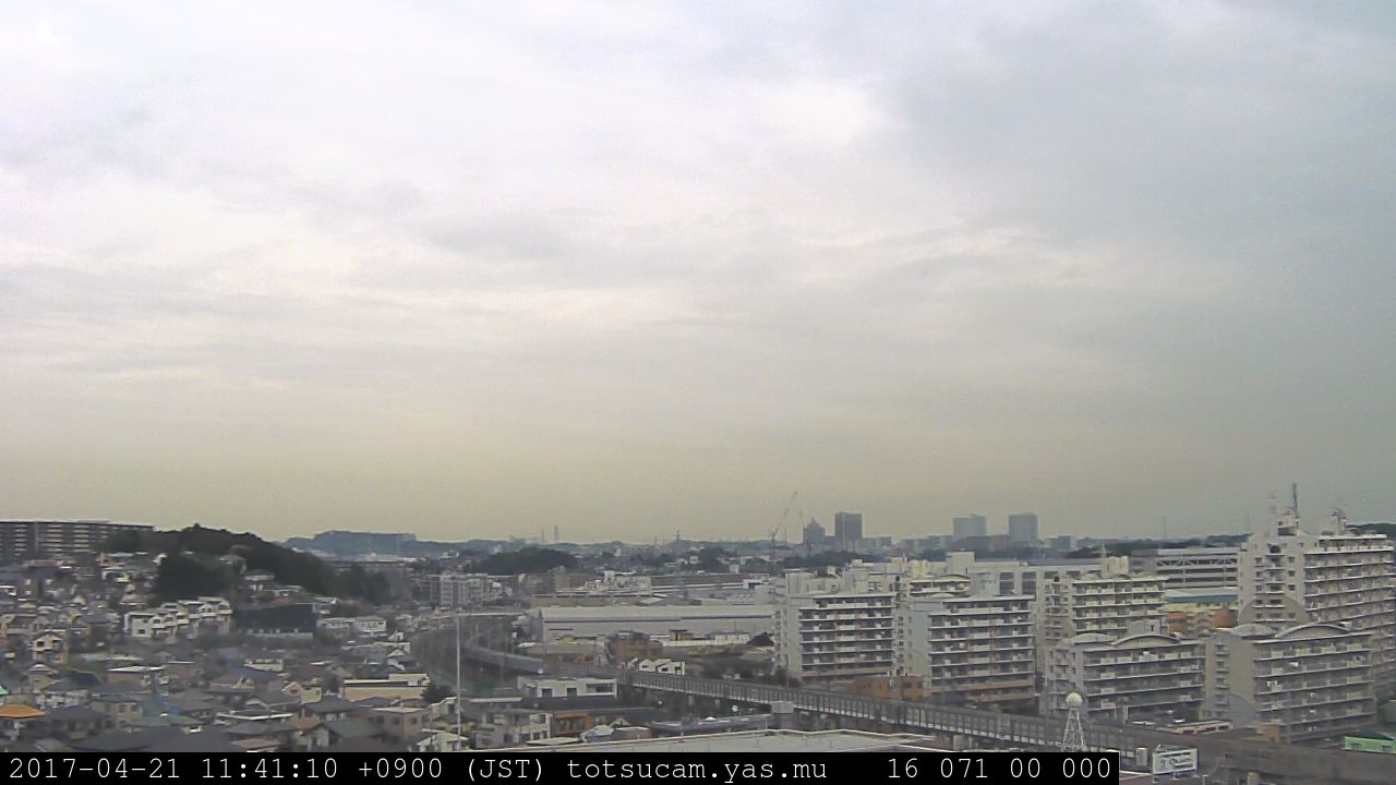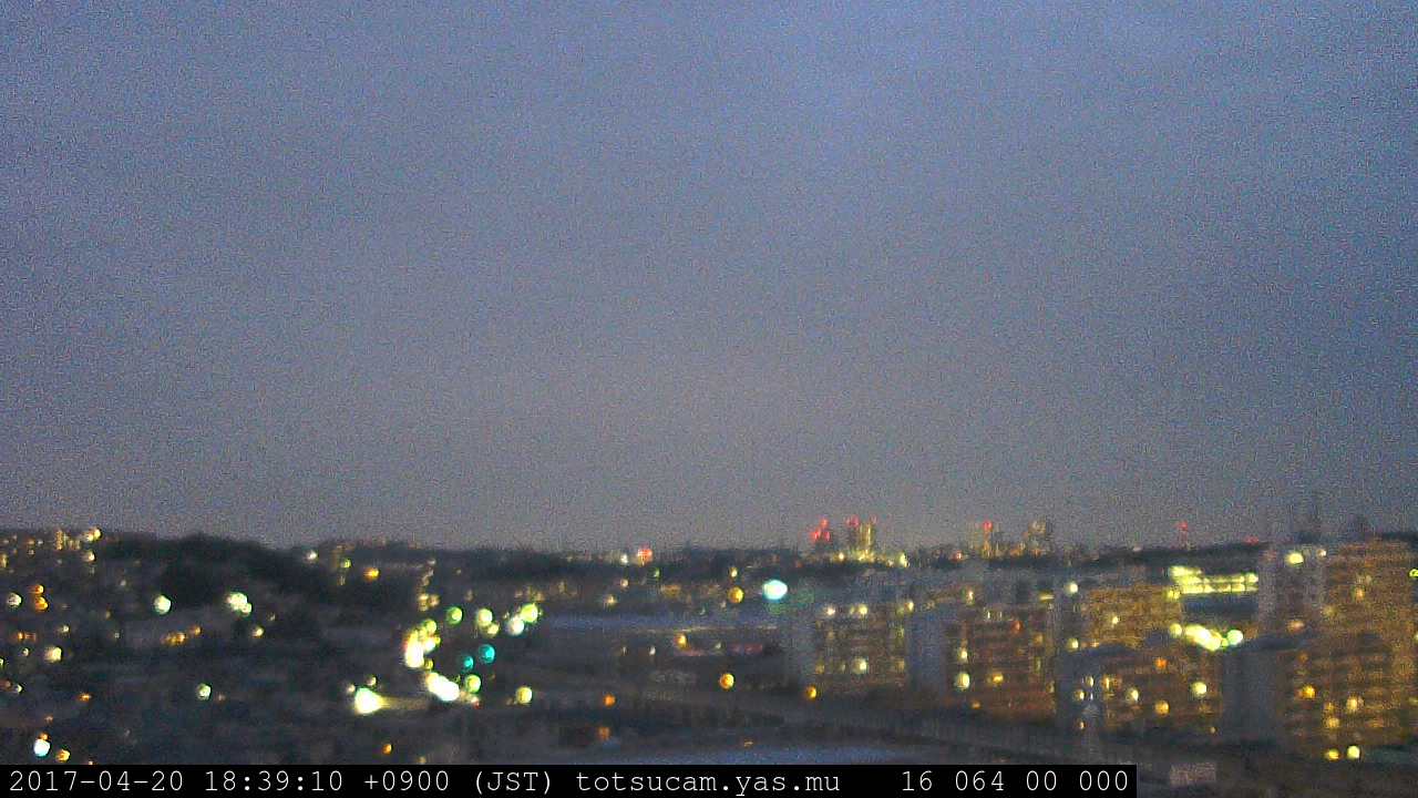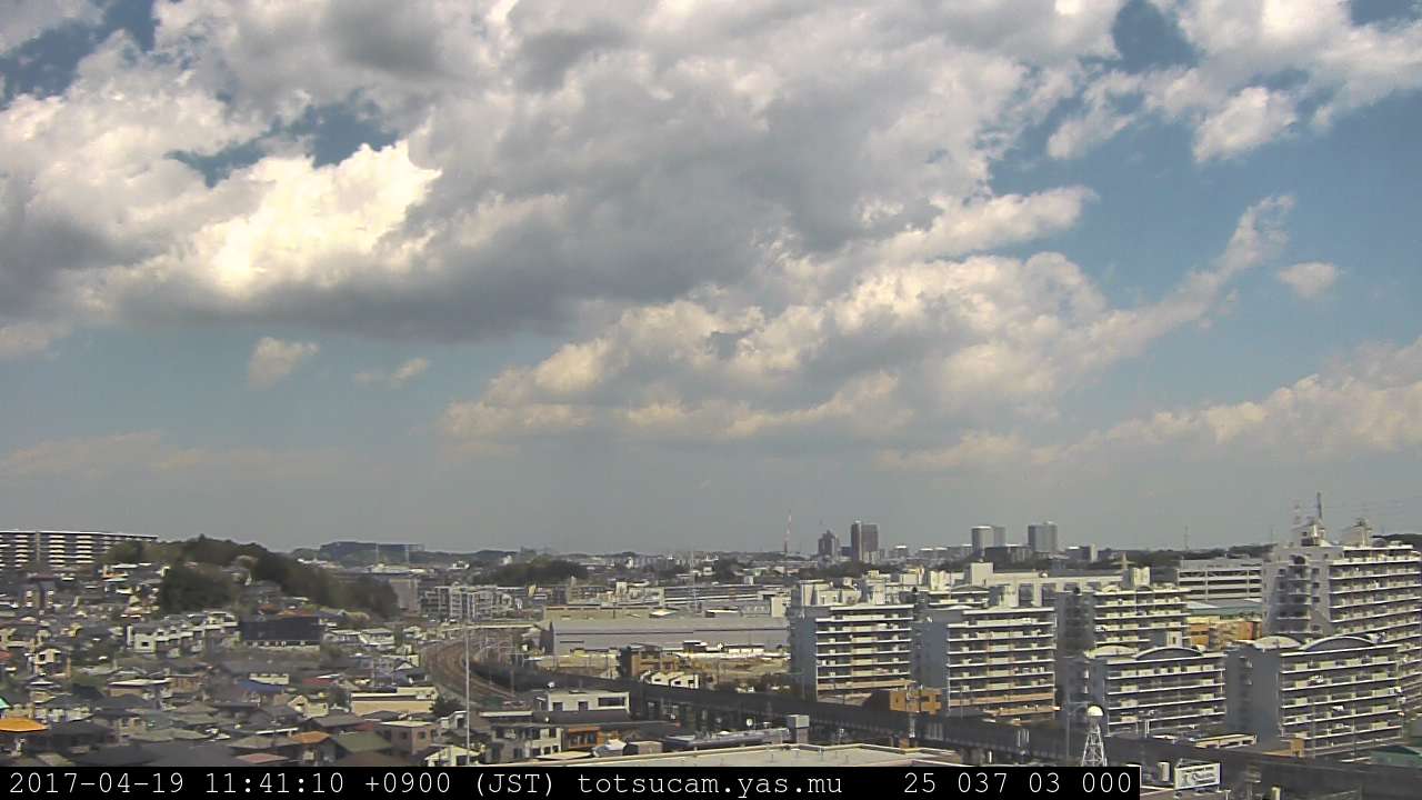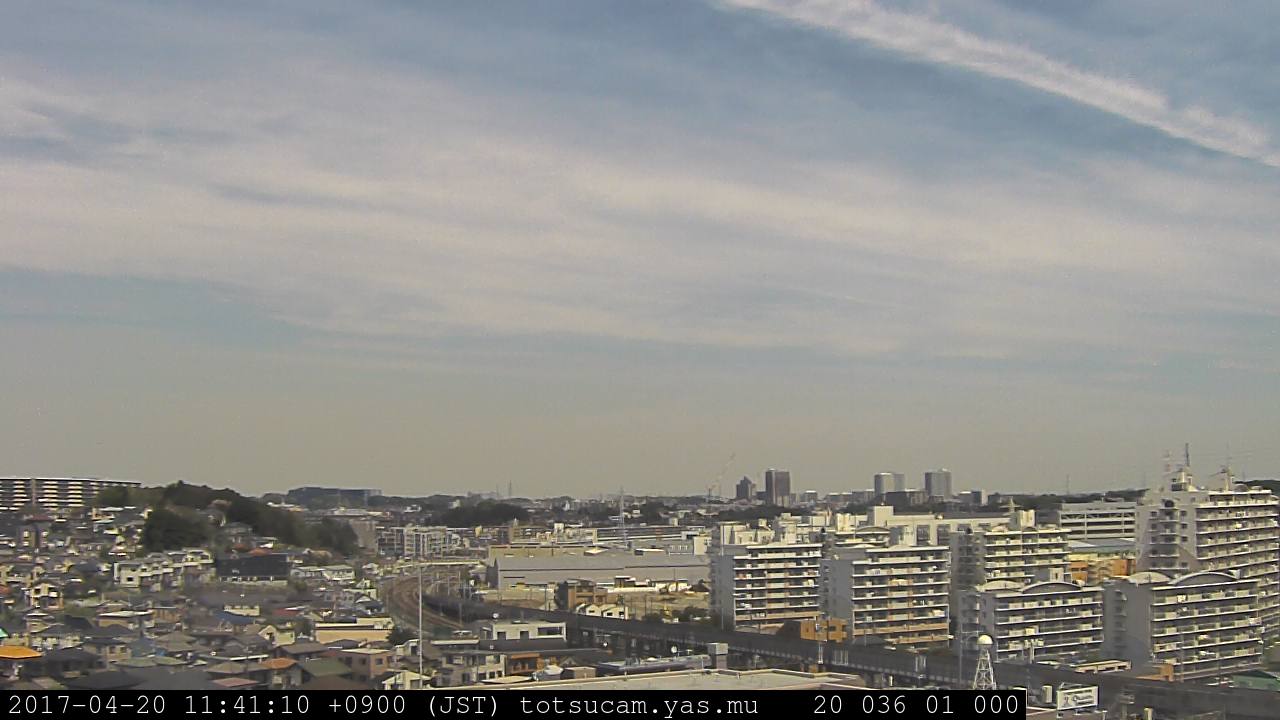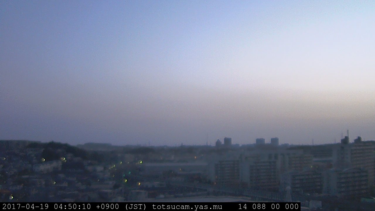 横浜市戸塚駅周辺から 東戸塚方面(北北東)を望む展望カメラの映像です。 左は現在の映像です。 下に並んでいるのは、 7日間に亘る日の出どき、昼間、夕暮れどきの写真(サムネイル)です。 それぞれ、日の出15分前、南中時、日没20分後の写真となっています。 各写真の下にはmpeg形式の動画へのリンクがあります。 それぞれ、日の出、南中、日没の前後1時間の画像です。 右欄にはその日24時間の動画へのリンクがあります。 この7日間以外は日付が一覧表示されています。 日付部分をクリックすると、 その日付から7日分が展開されて表示されます。