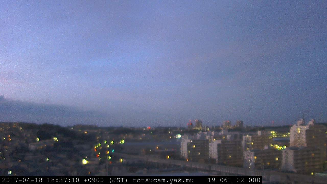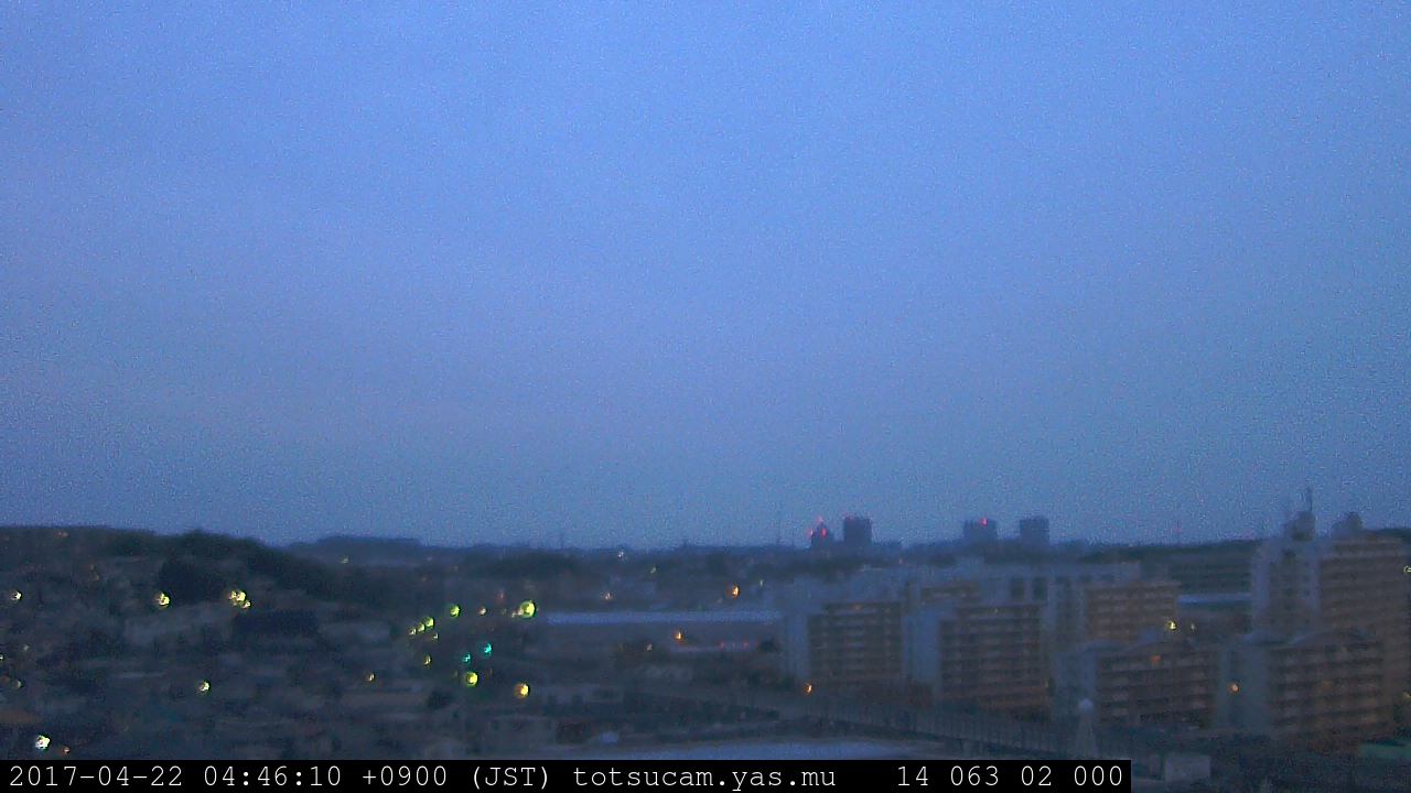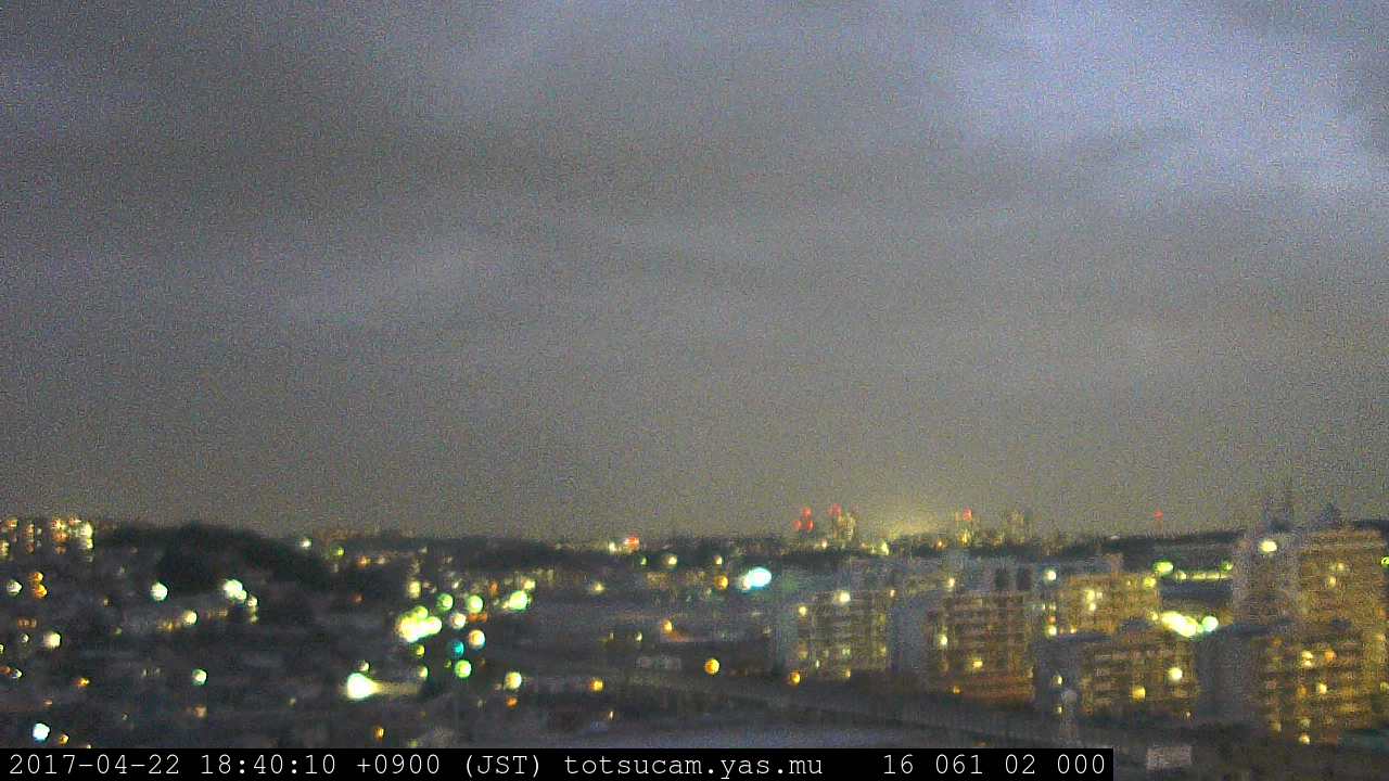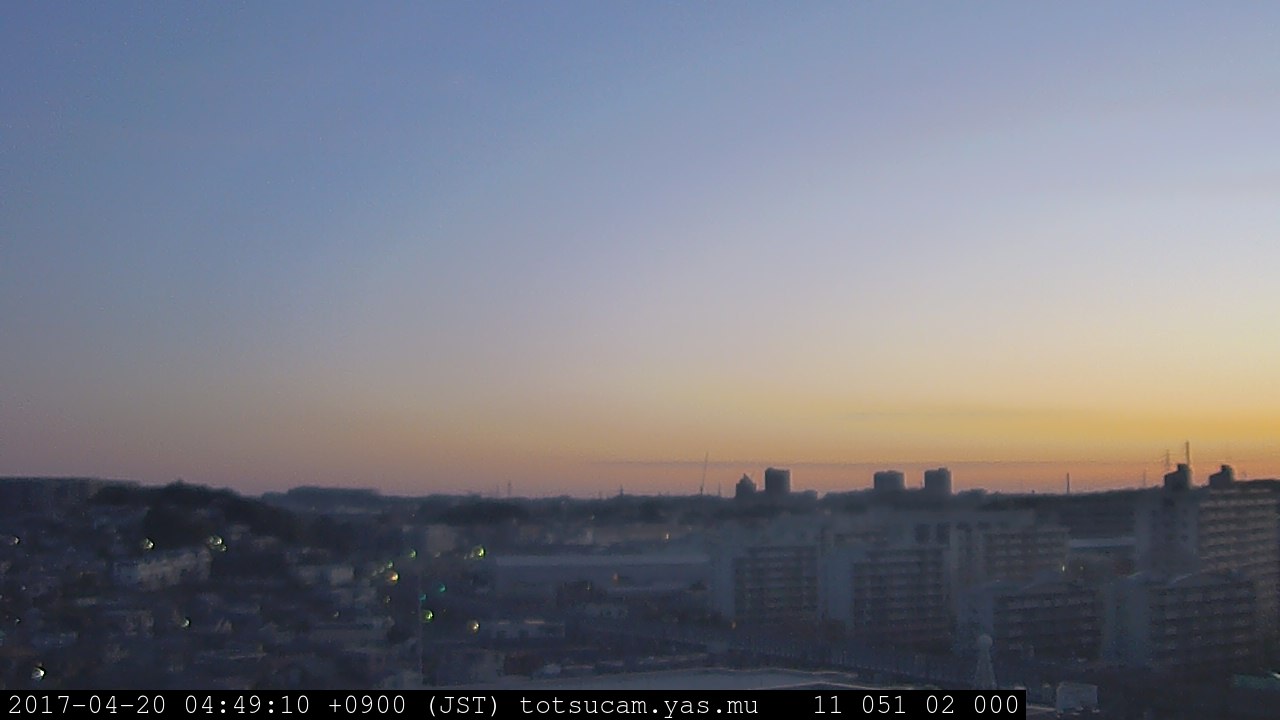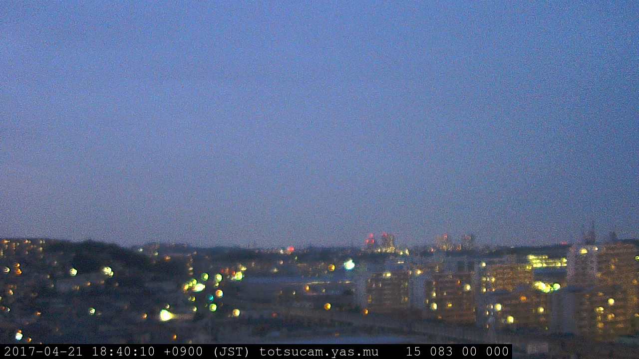横浜市戸塚駅周辺から 東戸塚方面(北北東)を望む展望カメラの映像です。 左は現在の映像です。 下に並んでいるのは、 7日間に亘る日の出どき、昼間、夕暮れどきの写真(サムネイル)です。 それぞれ、日の出15分前、南中時、日没20分後の写真となっています。 各写真の下にはmpeg形式の動画へのリンクがあります。 それぞれ、日の出、南中、日没の前後1時間の画像です。 右欄にはその日24時間の動画へのリンクがあります。 この7日間以外は日付が一覧表示されています。 日付部分をクリックすると、 その日付から7日分が展開されて表示されます。