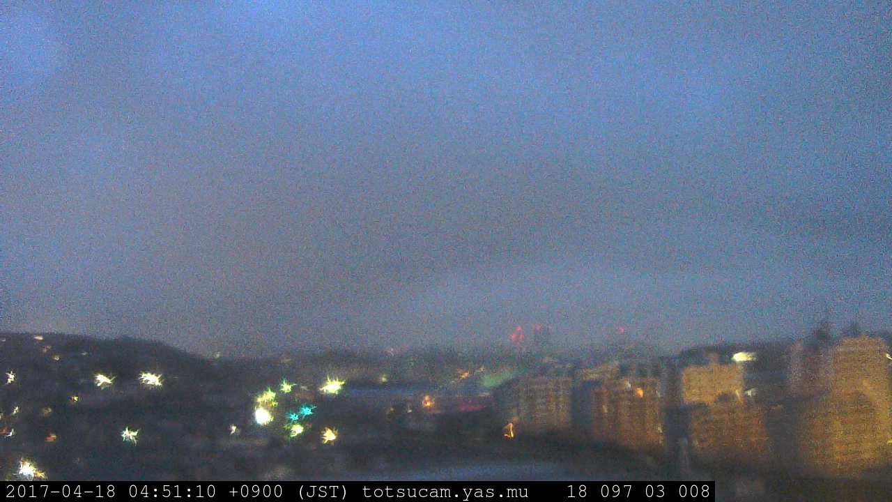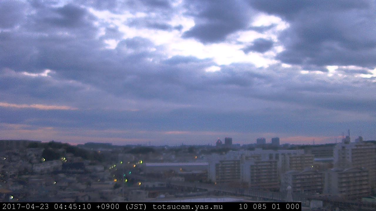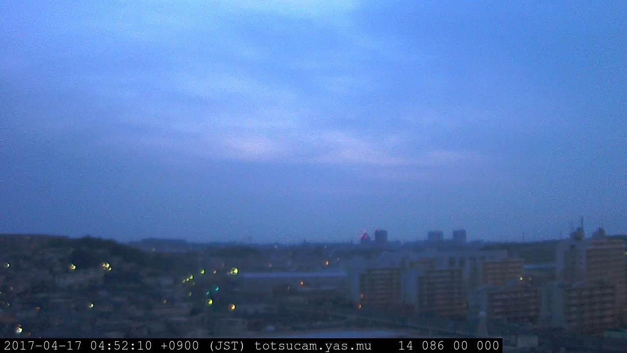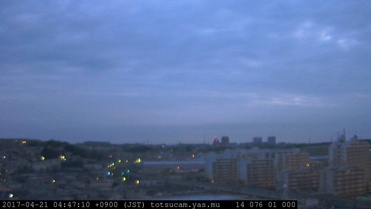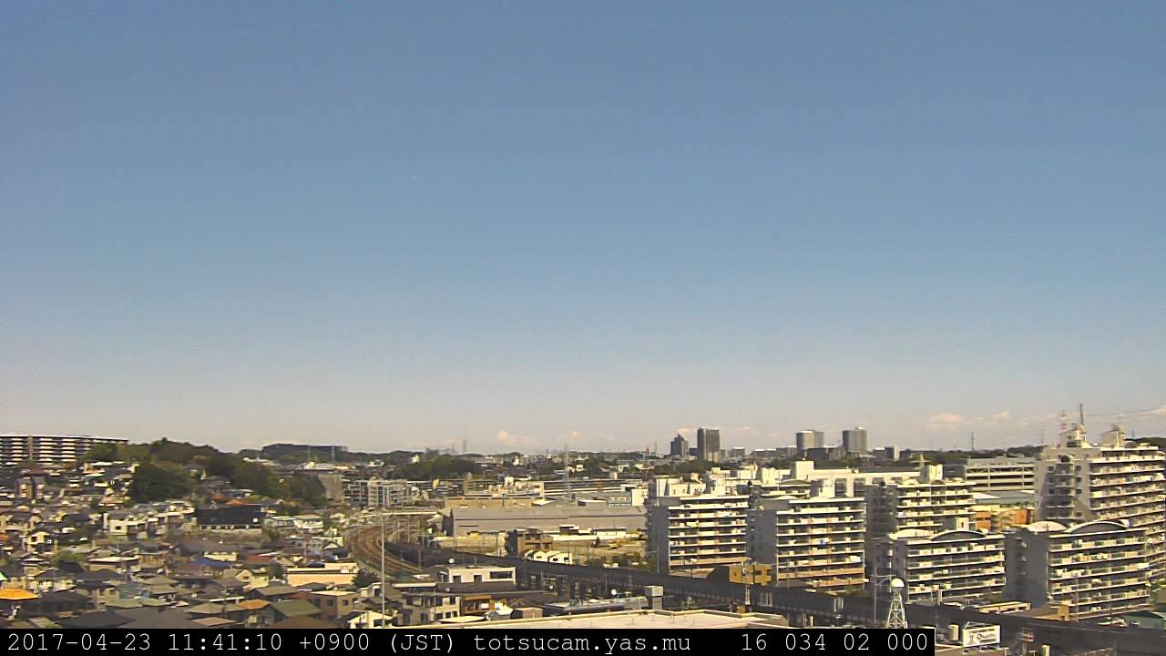 横浜市戸塚駅周辺から 東戸塚方面(北北東)を望む展望カメラの映像です。 左は現在の映像です。 下に並んでいるのは、 7日間に亘る日の出どき、昼間、夕暮れどきの写真(サムネイル)です。 それぞれ、日の出15分前、南中時、日没20分後の写真となっています。 各写真の下にはmpeg形式の動画へのリンクがあります。 それぞれ、日の出、南中、日没の前後1時間の画像です。 右欄にはその日24時間の動画へのリンクがあります。 この7日間以外は日付が一覧表示されています。 日付部分をクリックすると、 その日付から7日分が展開されて表示されます。