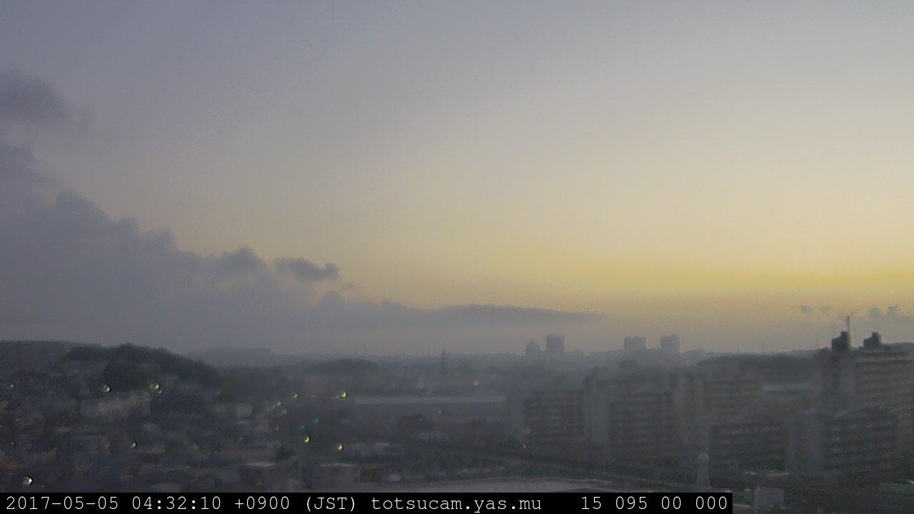 横浜市戸塚駅周辺から 東戸塚方面(北北東)を望む展望カメラの映像です。 左は現在の映像です。 下に並んでいるのは、 7日間に亘る日の出どき、昼間、夕暮れどきの写真(サムネイル)です。 それぞれ、日の出15分前、南中時、日没20分後の写真となっています。 各写真の下にはmpeg形式の動画へのリンクがあります。 それぞれ、日の出、南中、日没の前後1時間の画像です。 右欄にはその日24時間の動画へのリンクがあります。 この7日間以外は日付が一覧表示されています。 日付部分をクリックすると、 その日付から7日分が展開されて表示されます。