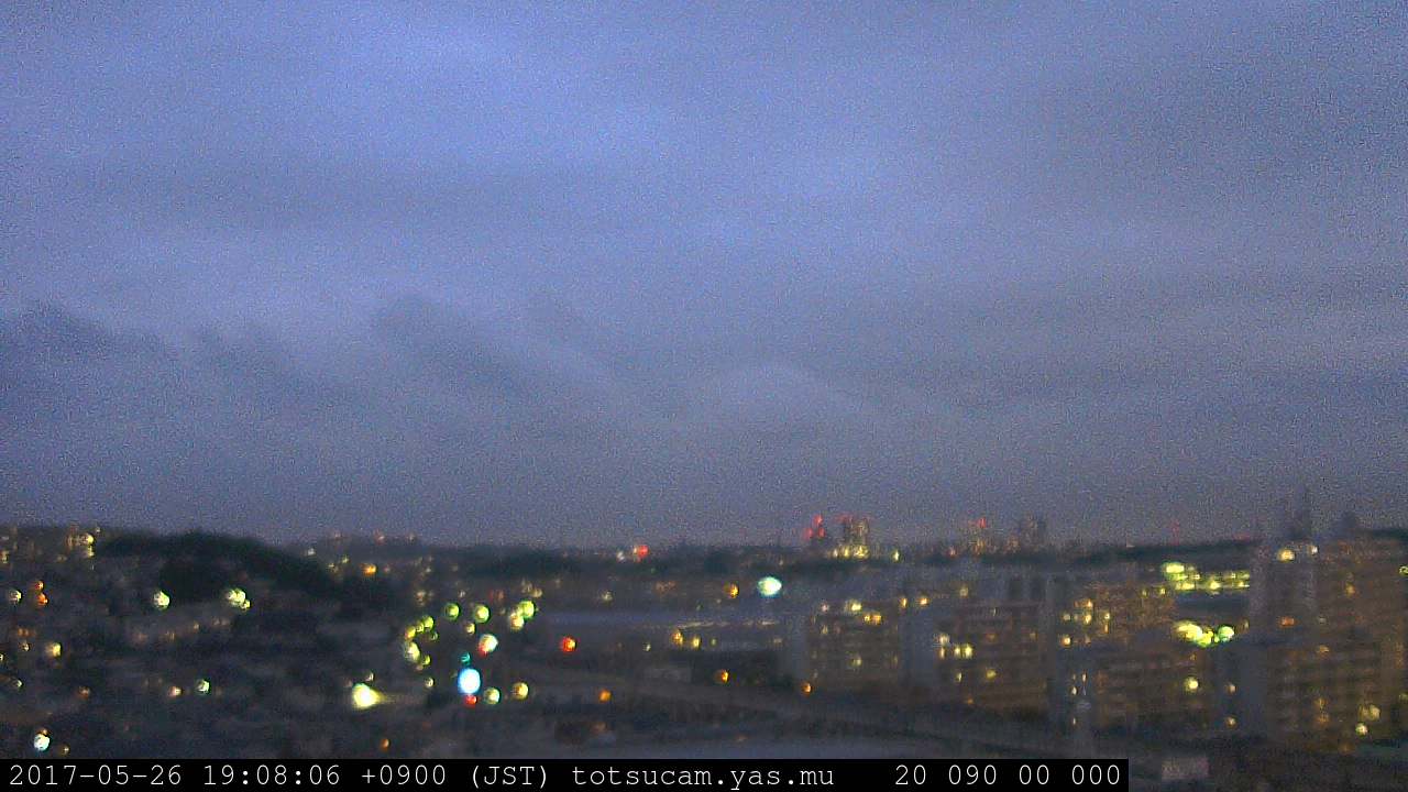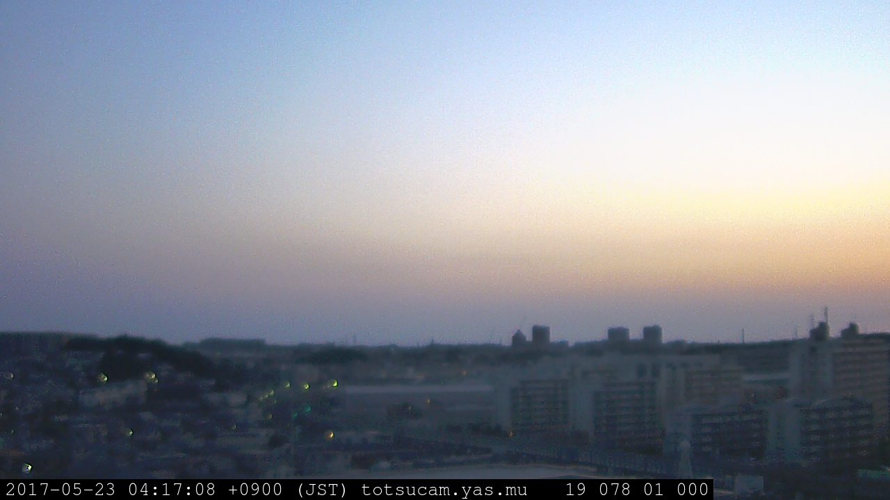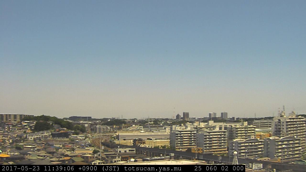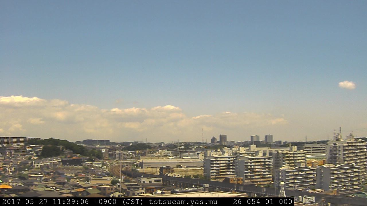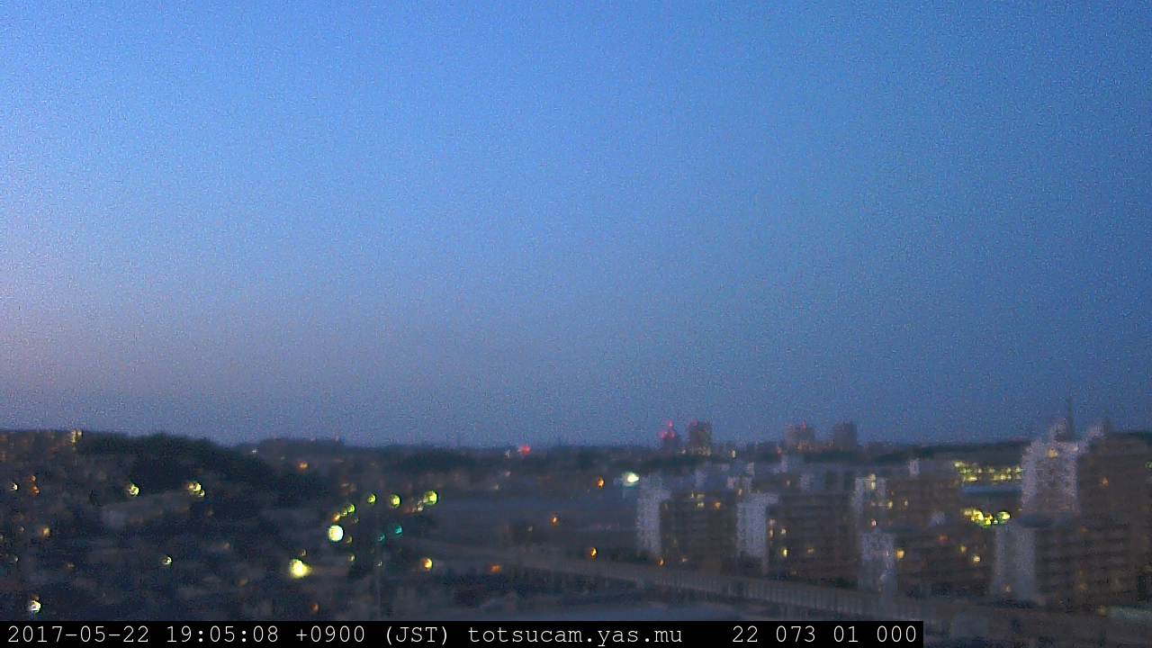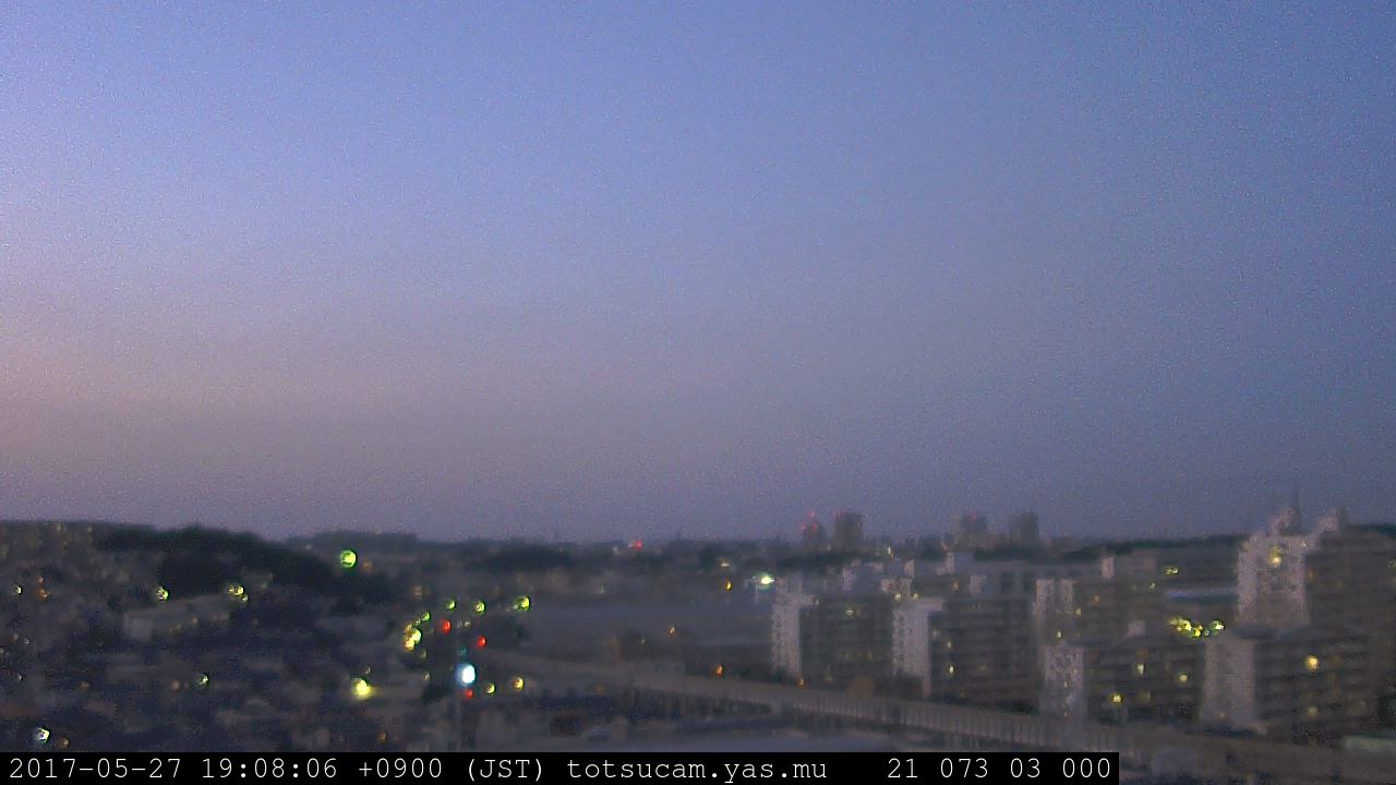 横浜市戸塚駅周辺から 東戸塚方面(北北東)を望む展望カメラの映像です。 左は現在の映像です。 下に並んでいるのは、 7日間に亘る日の出どき、昼間、夕暮れどきの写真(サムネイル)です。 それぞれ、日の出15分前、南中時、日没20分後の写真となっています。 各写真の下にはmpeg形式の動画へのリンクがあります。 それぞれ、日の出、南中、日没の前後1時間の画像です。 右欄にはその日24時間の動画へのリンクがあります。 この7日間以外は日付が一覧表示されています。 日付部分をクリックすると、 その日付から7日分が展開されて表示されます。