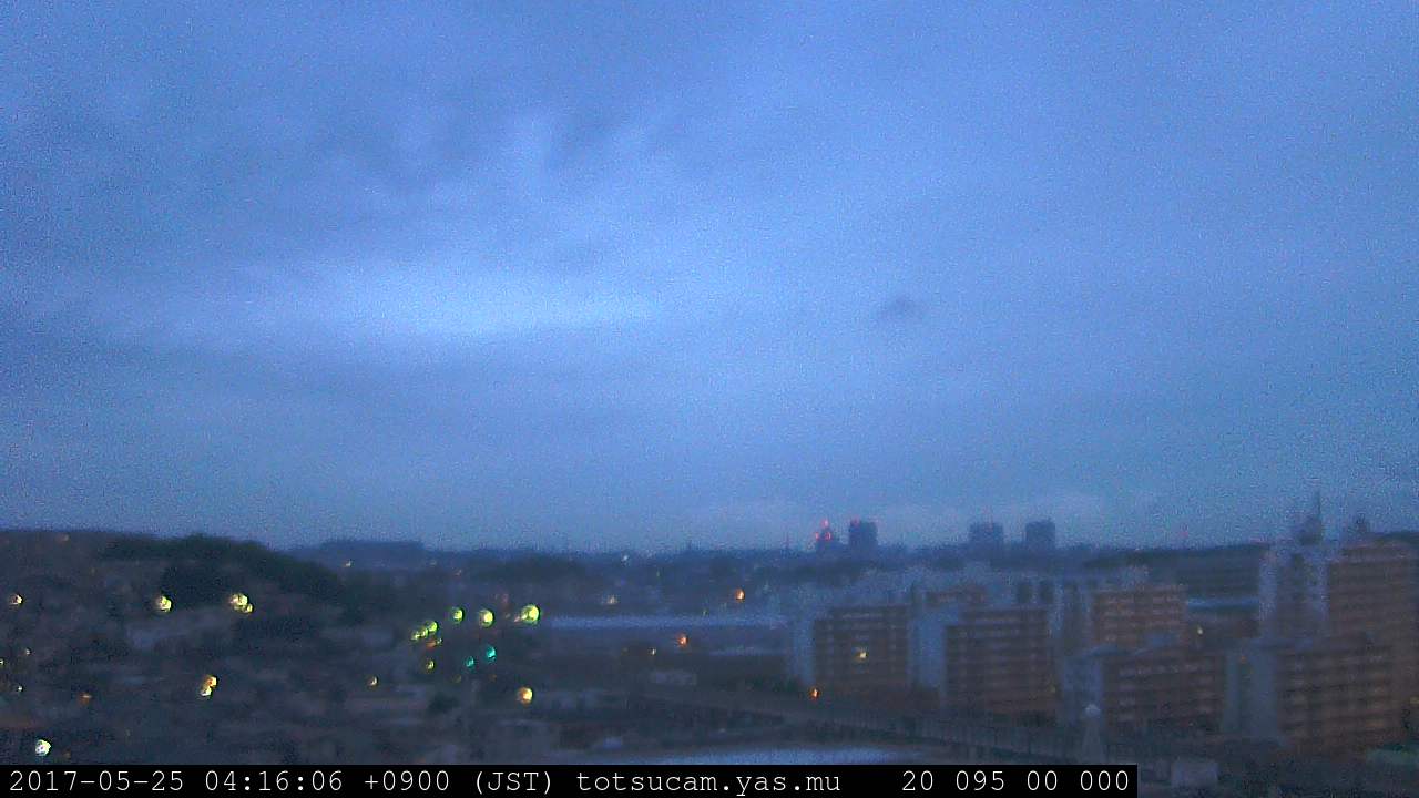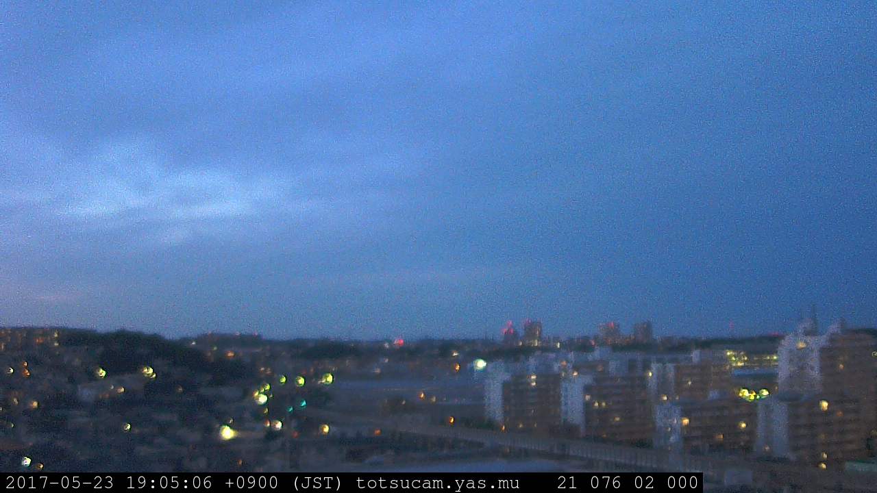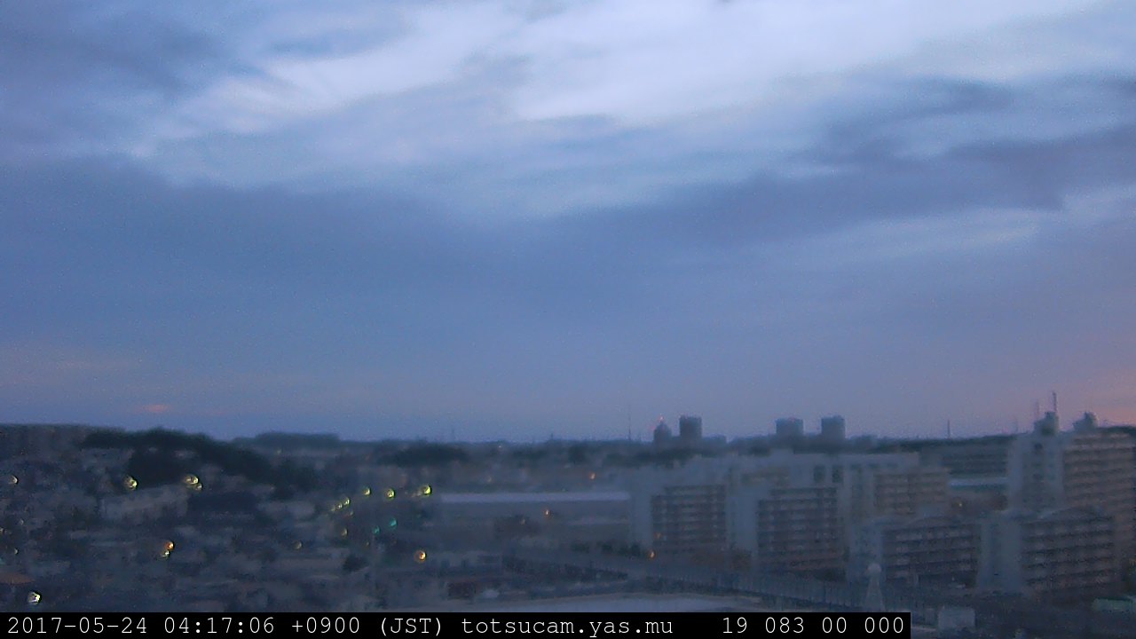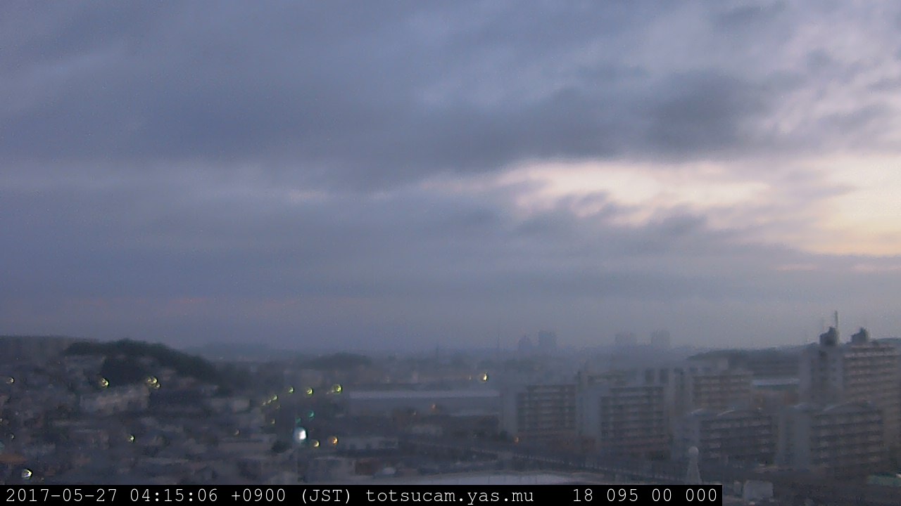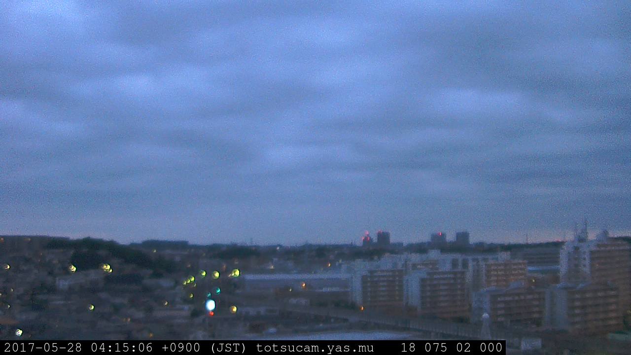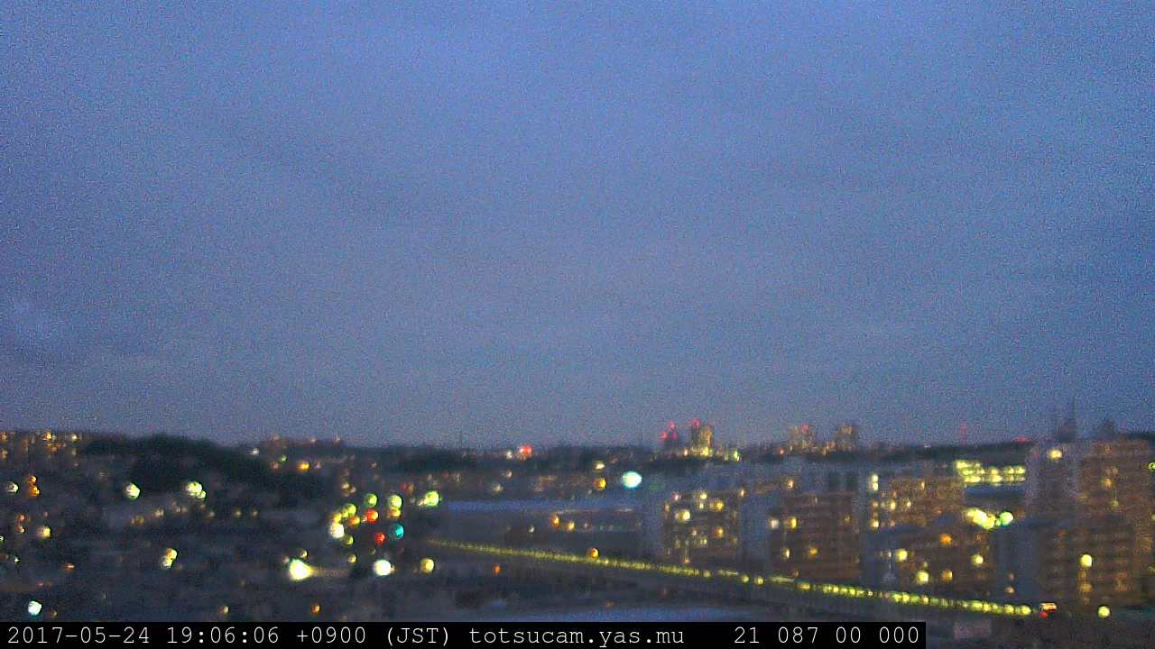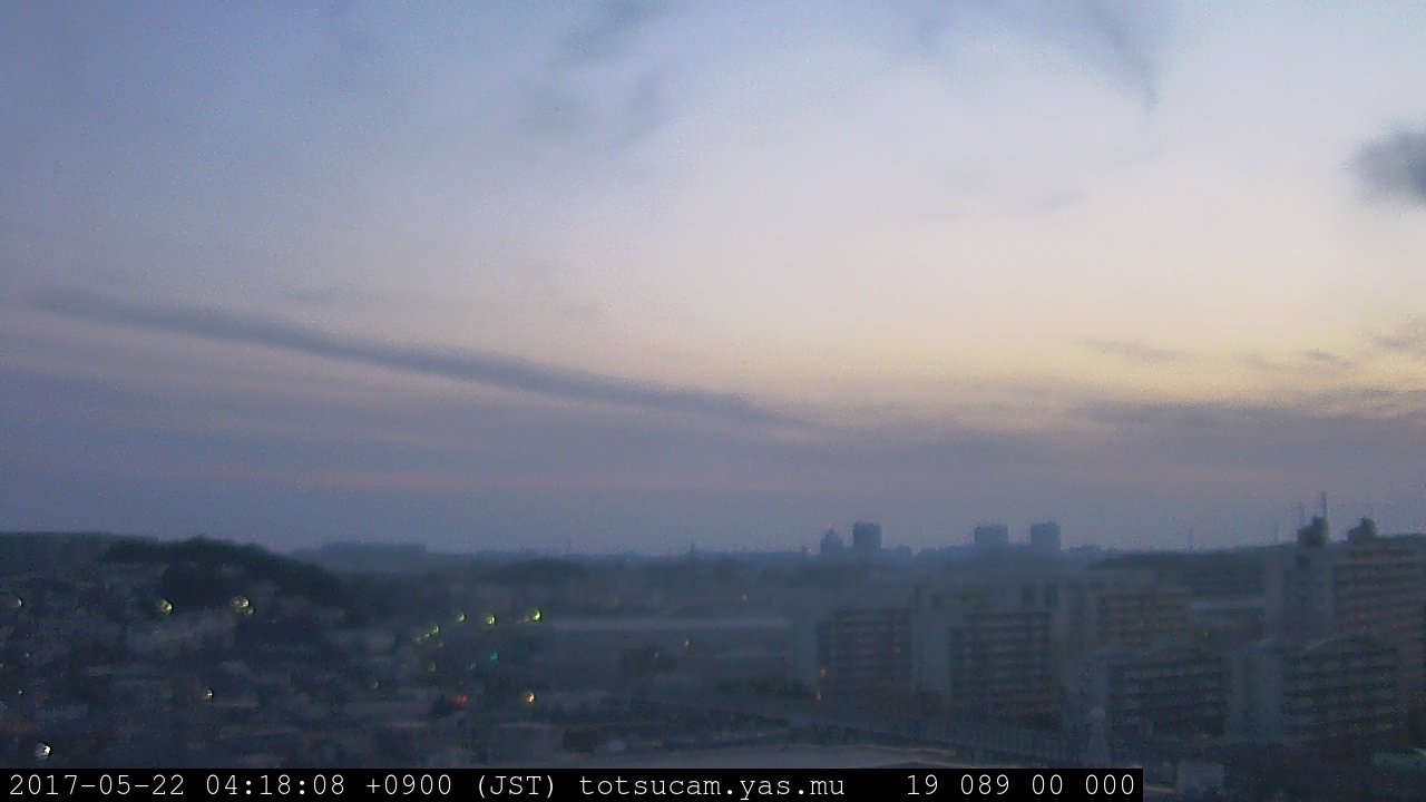 横浜市戸塚駅周辺から 東戸塚方面(北北東)を望む展望カメラの映像です。 左は現在の映像です。 下に並んでいるのは、 7日間に亘る日の出どき、昼間、夕暮れどきの写真(サムネイル)です。 それぞれ、日の出15分前、南中時、日没20分後の写真となっています。 各写真の下にはmpeg形式の動画へのリンクがあります。 それぞれ、日の出、南中、日没の前後1時間の画像です。 右欄にはその日24時間の動画へのリンクがあります。 この7日間以外は日付が一覧表示されています。 日付部分をクリックすると、 その日付から7日分が展開されて表示されます。