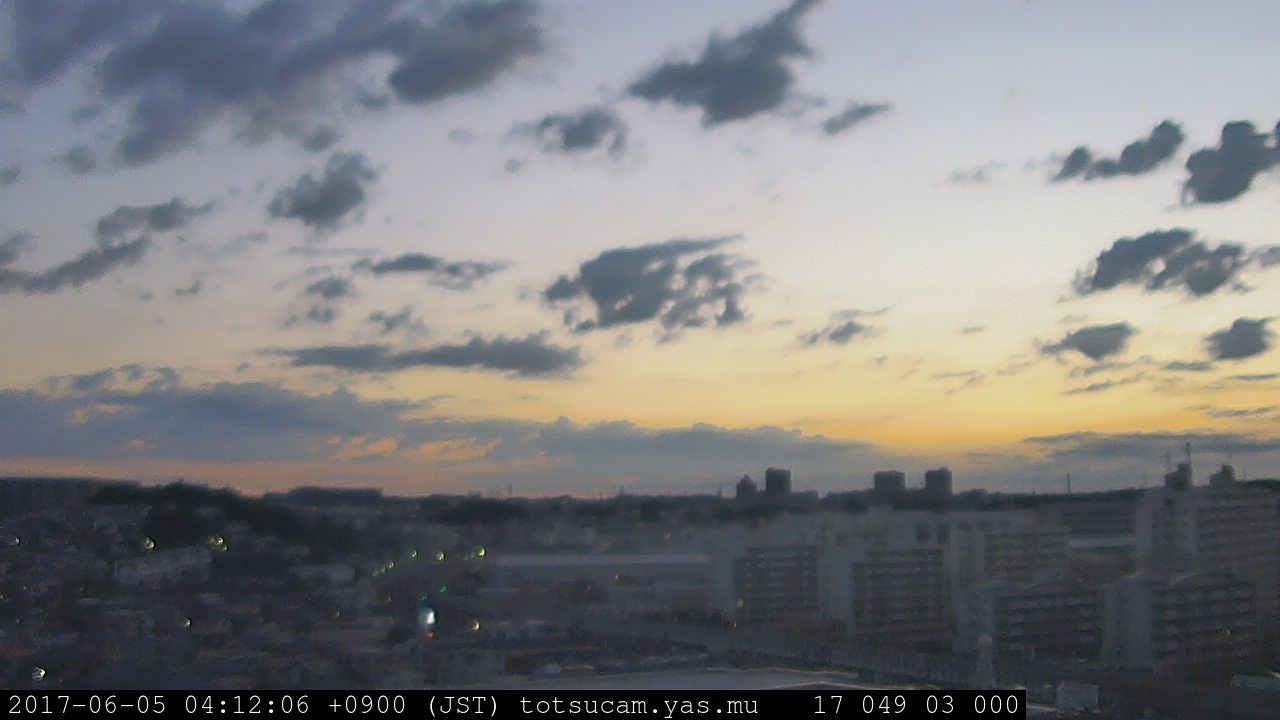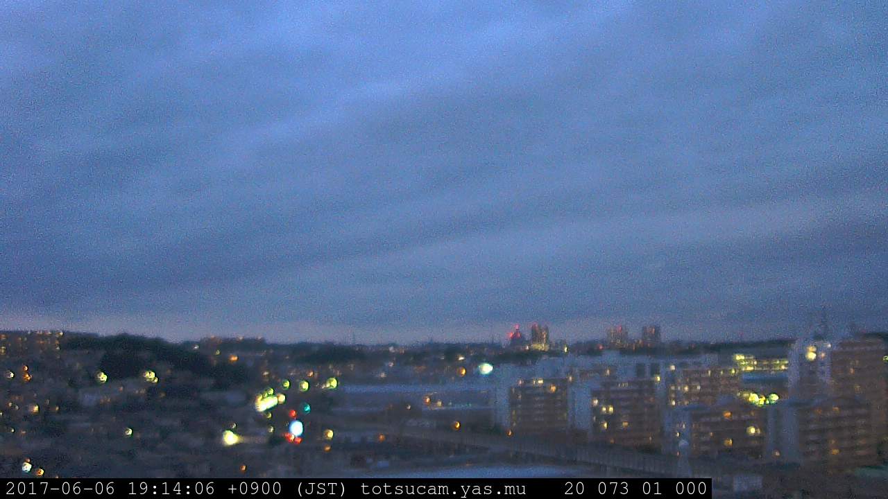 横浜市戸塚駅周辺から 東戸塚方面(北北東)を望む展望カメラの映像です。 左は現在の映像です。 下に並んでいるのは、 7日間に亘る日の出どき、昼間、夕暮れどきの写真(サムネイル)です。 それぞれ、日の出15分前、南中時、日没20分後の写真となっています。 各写真の下にはmpeg形式の動画へのリンクがあります。 それぞれ、日の出、南中、日没の前後1時間の画像です。 右欄にはその日24時間の動画へのリンクがあります。 この7日間以外は日付が一覧表示されています。 日付部分をクリックすると、 その日付から7日分が展開されて表示されます。